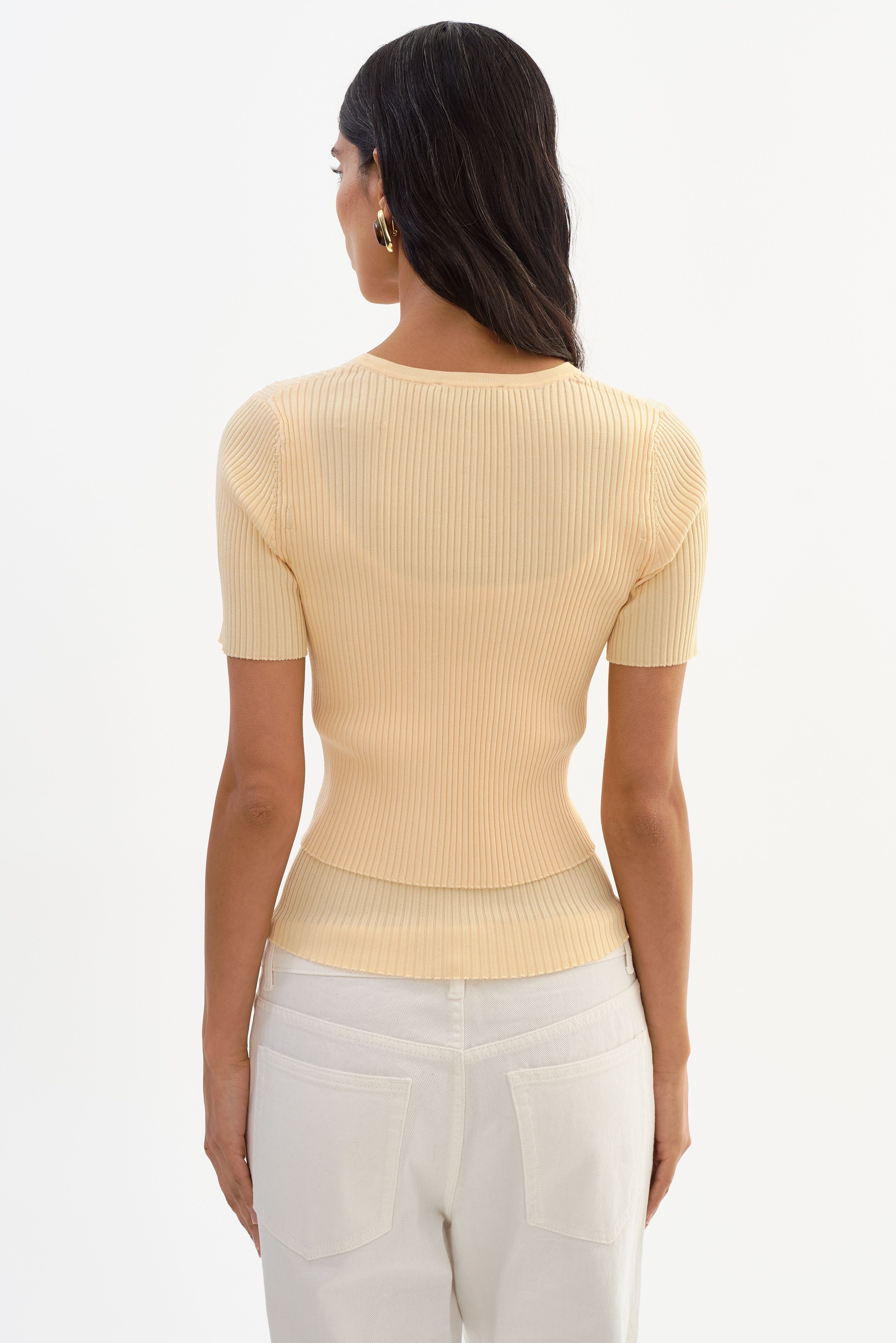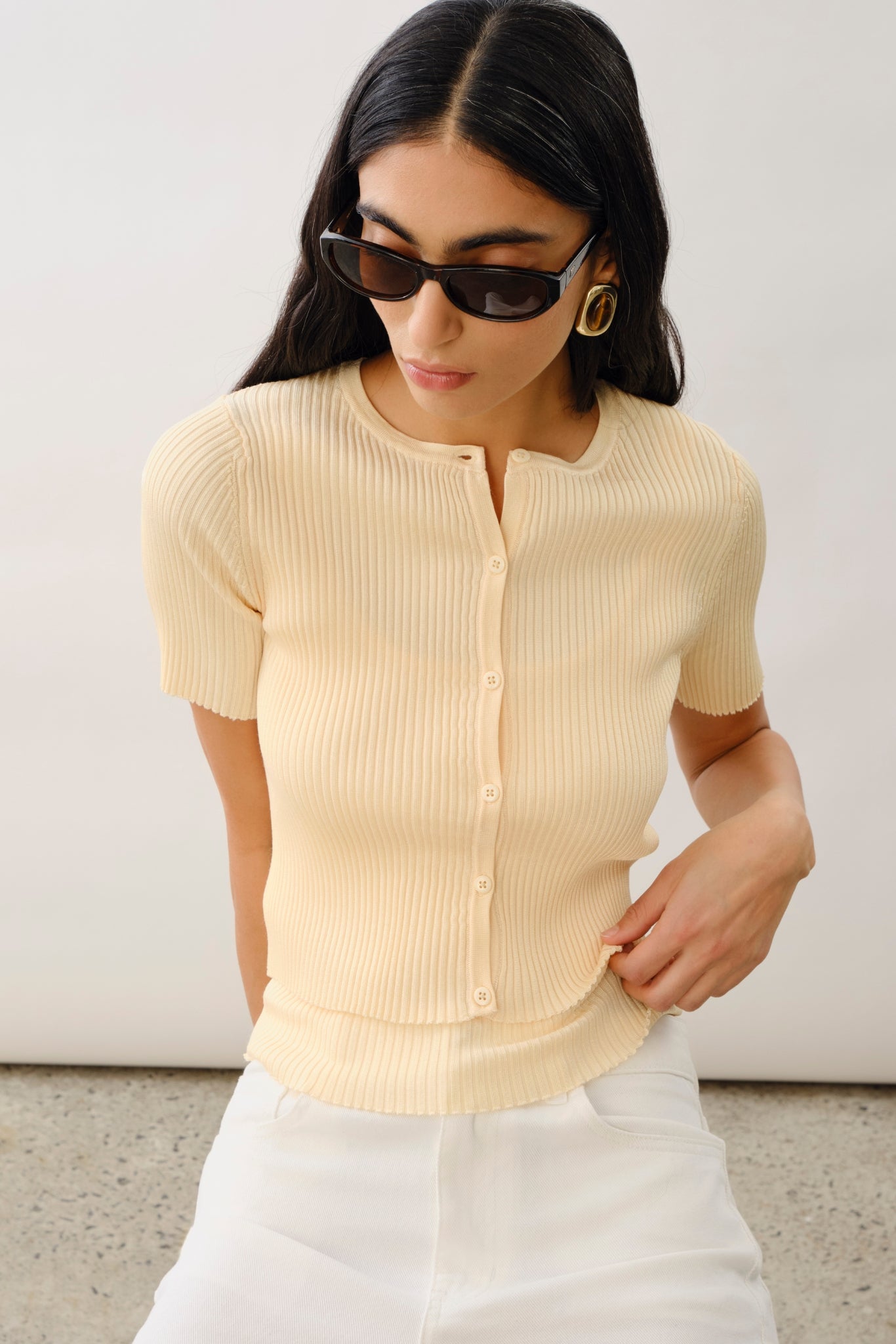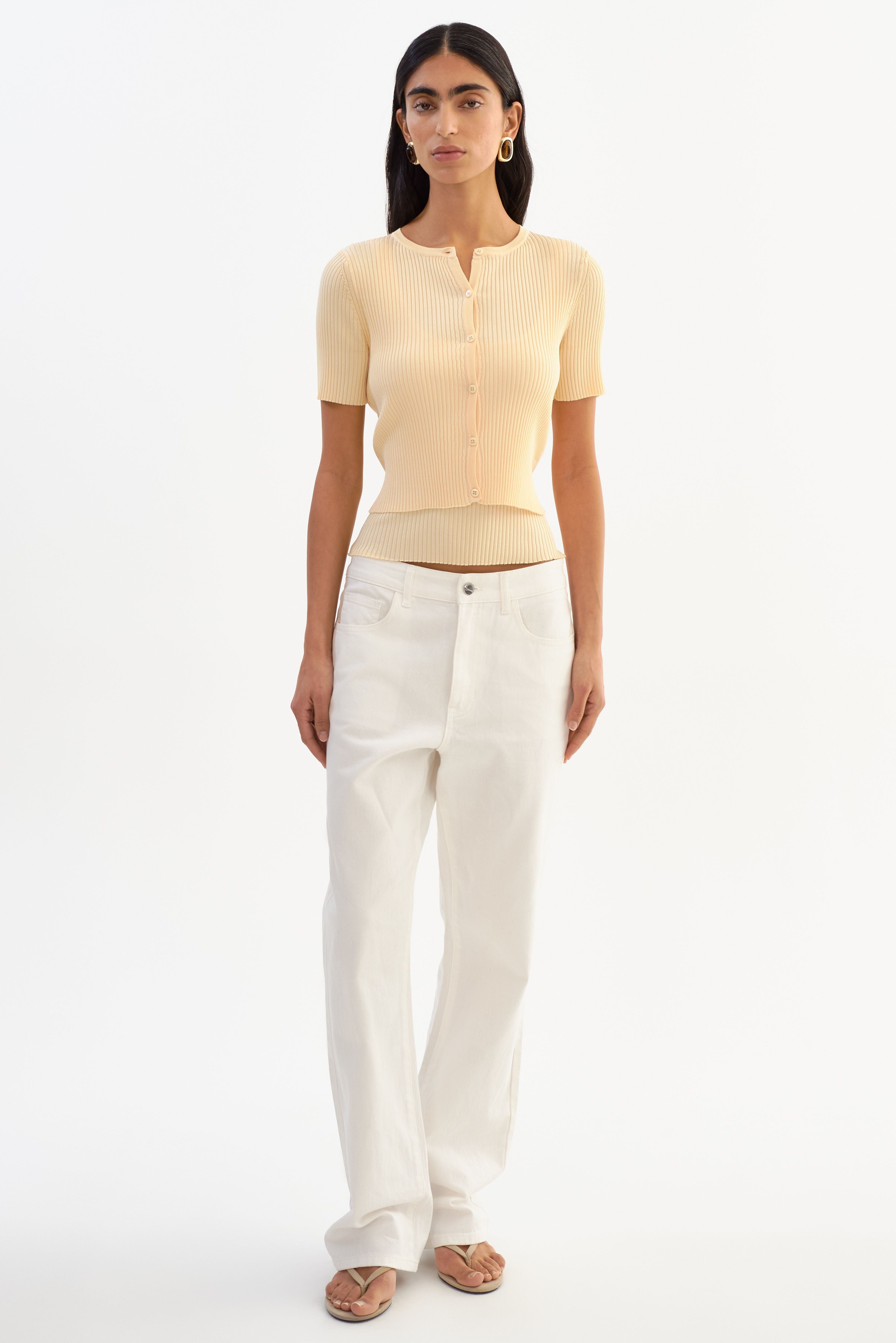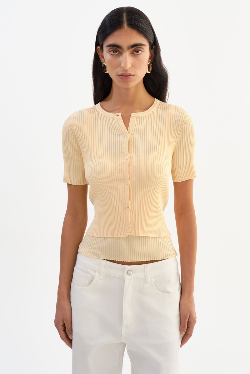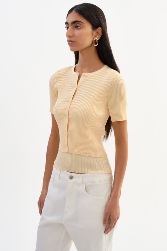 The MAEVA cardigan blends structure and ease in a modern cropped silhouette. Made from rib knit, it features a button-front closure and refined rib detailing throughout. Style it with capris for a polished and effortless look.