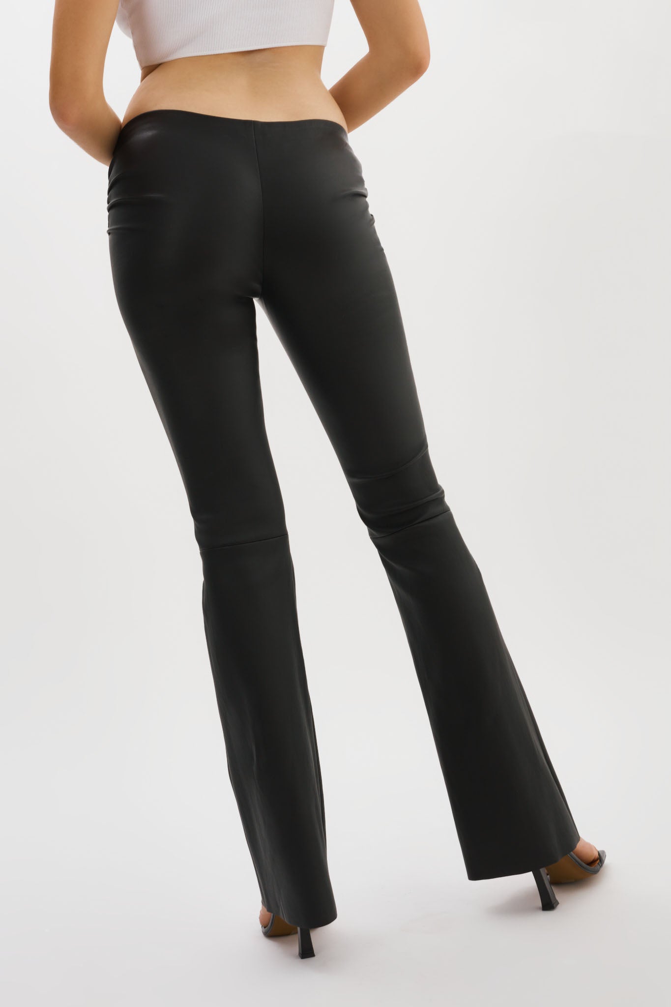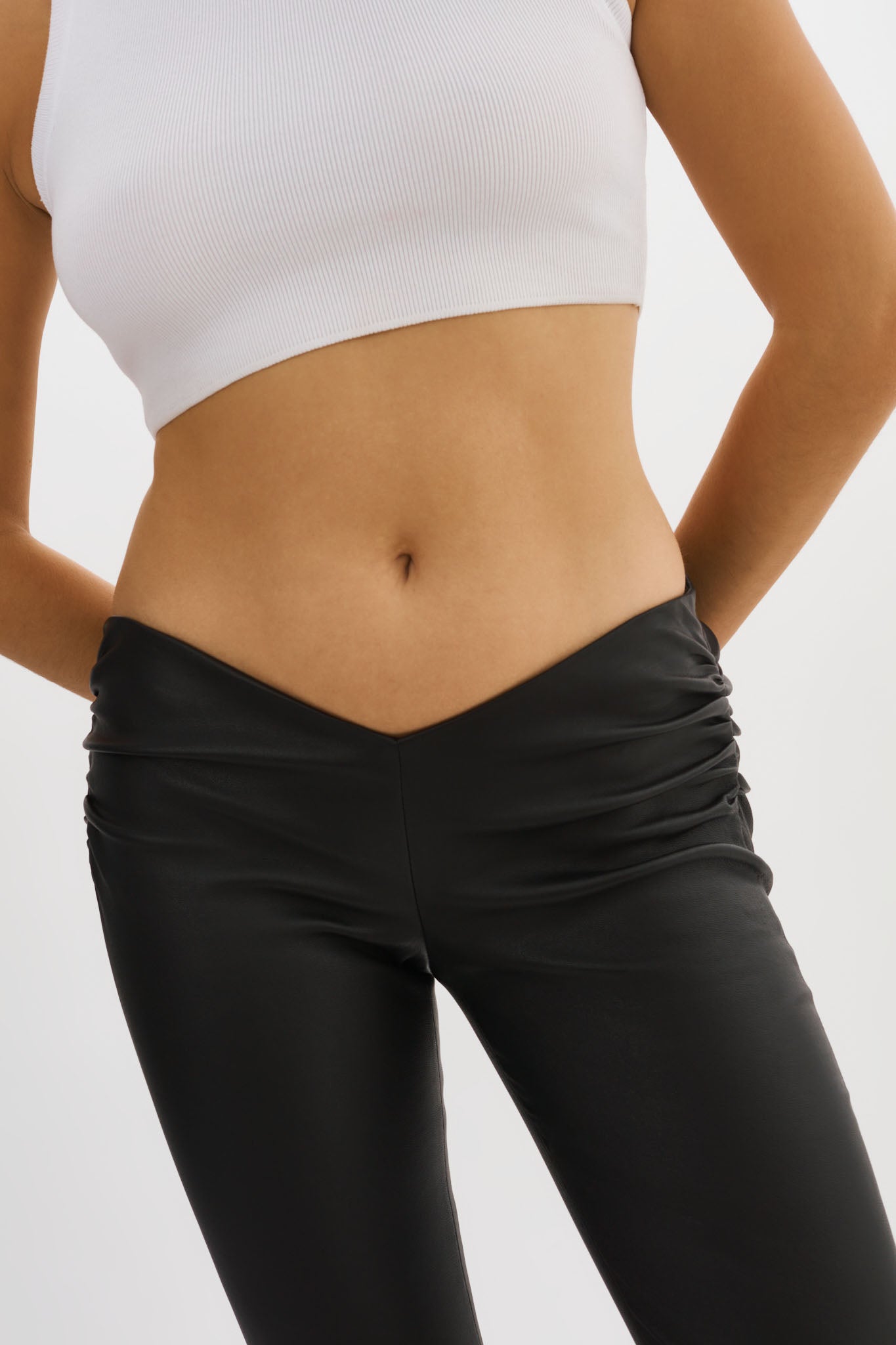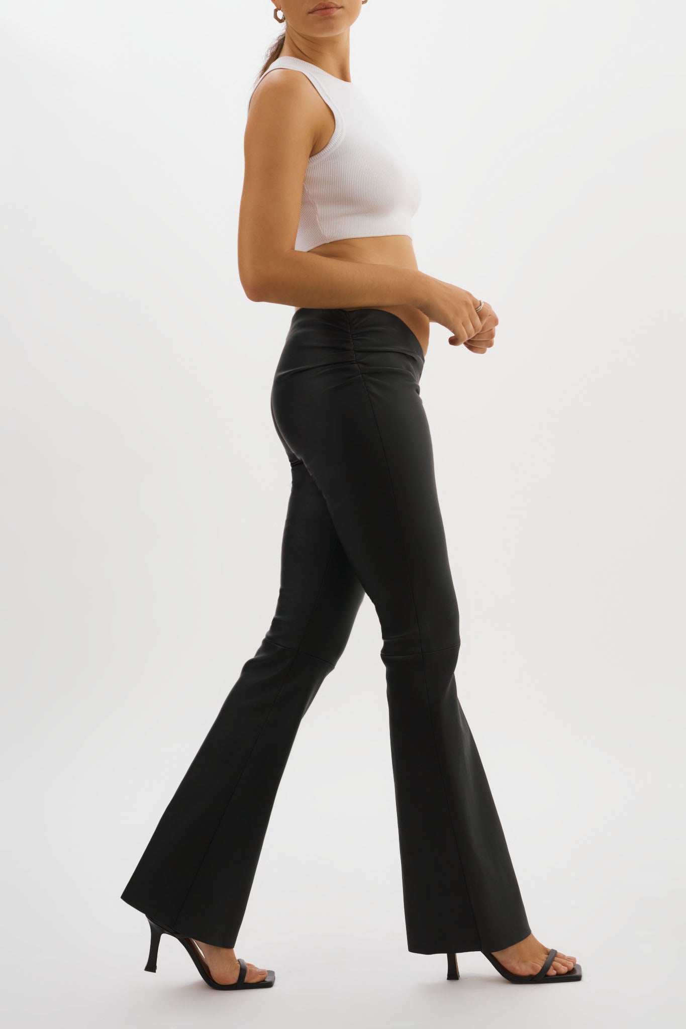 An elevated version of the classic leather trouser, the NADDA low rise leather pants feature a dipped front, ruching at the hips and a flared hem to flatter your shape. Think of them as an effortless foundation for so many outfits.