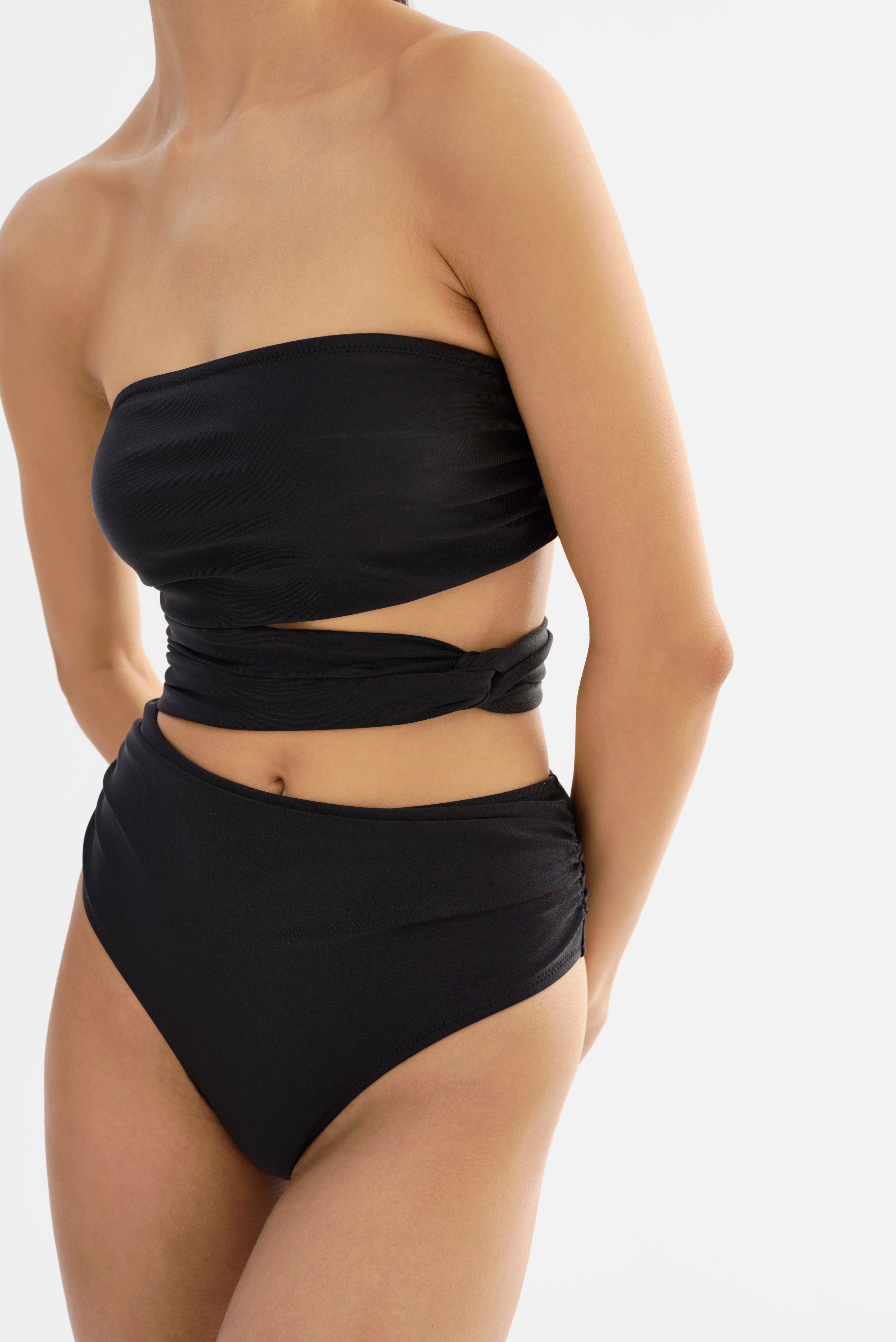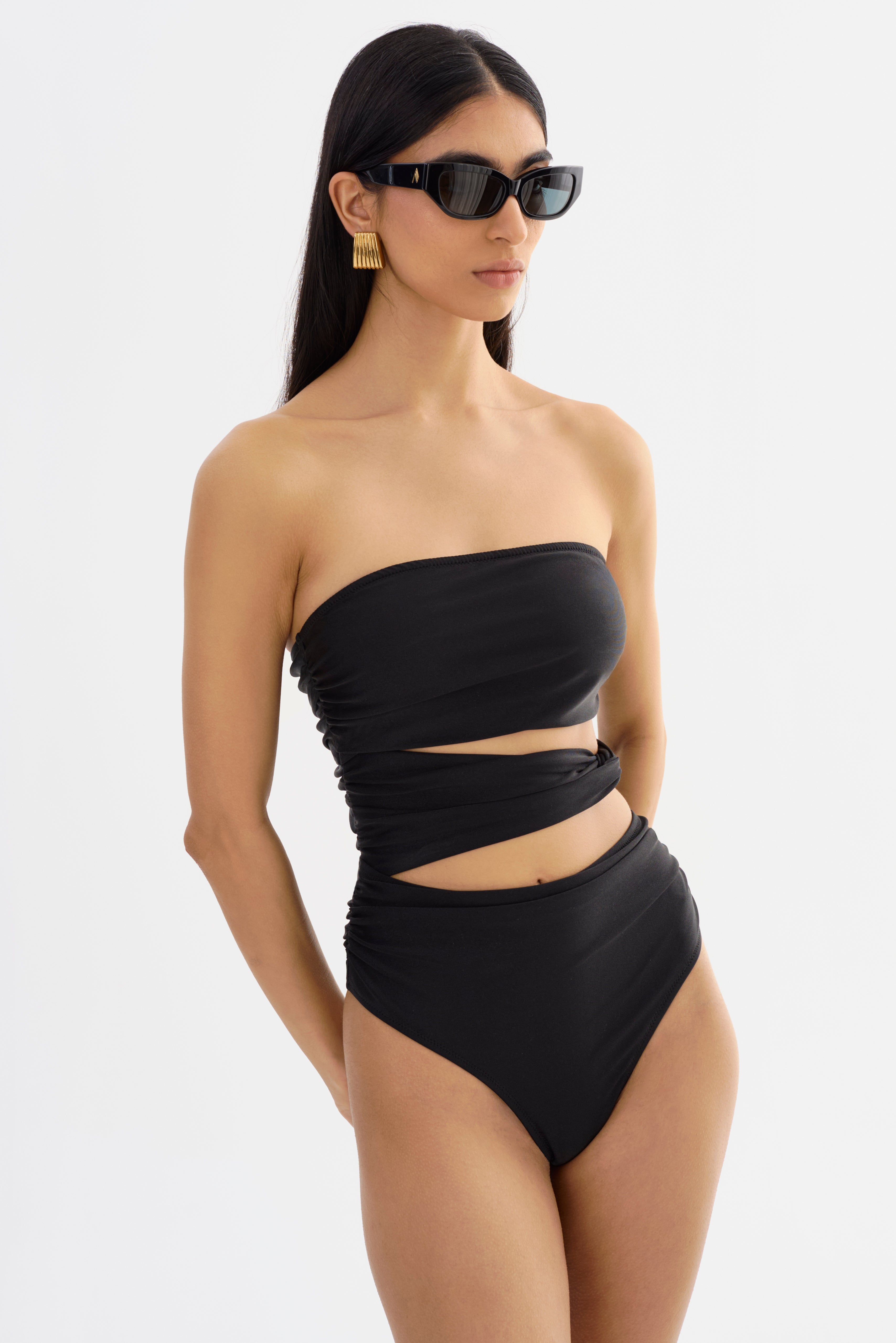 The MEKHI One-Piece Swimsuit combines sculptural design with sleek allure. This strapless silhouette features statement side cutouts and ruching along the sides and bottom for a flattering effect. Grip tape along the neckline ensures a secure fit, making it a sophisticated swim essential with bold, modern appeal.