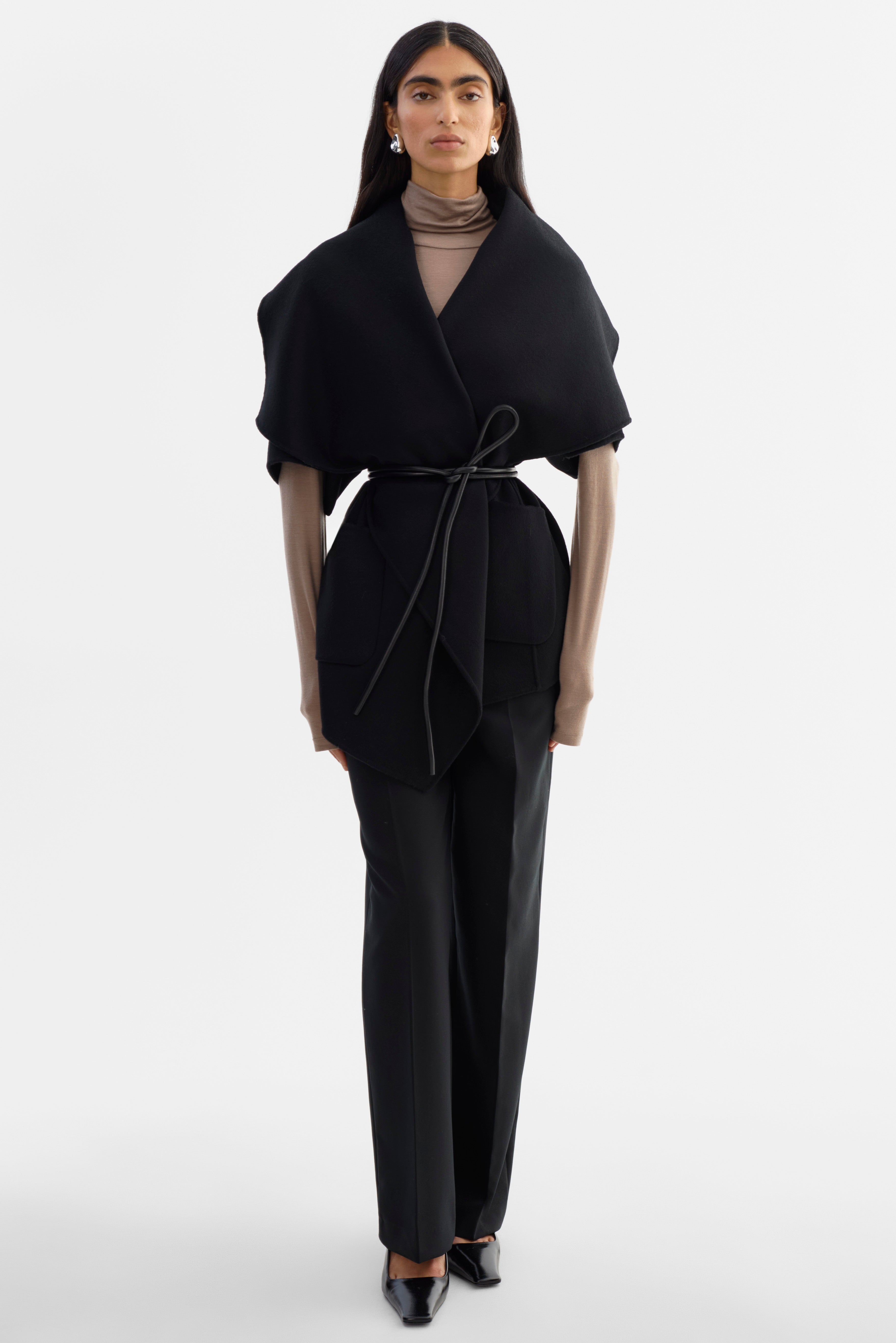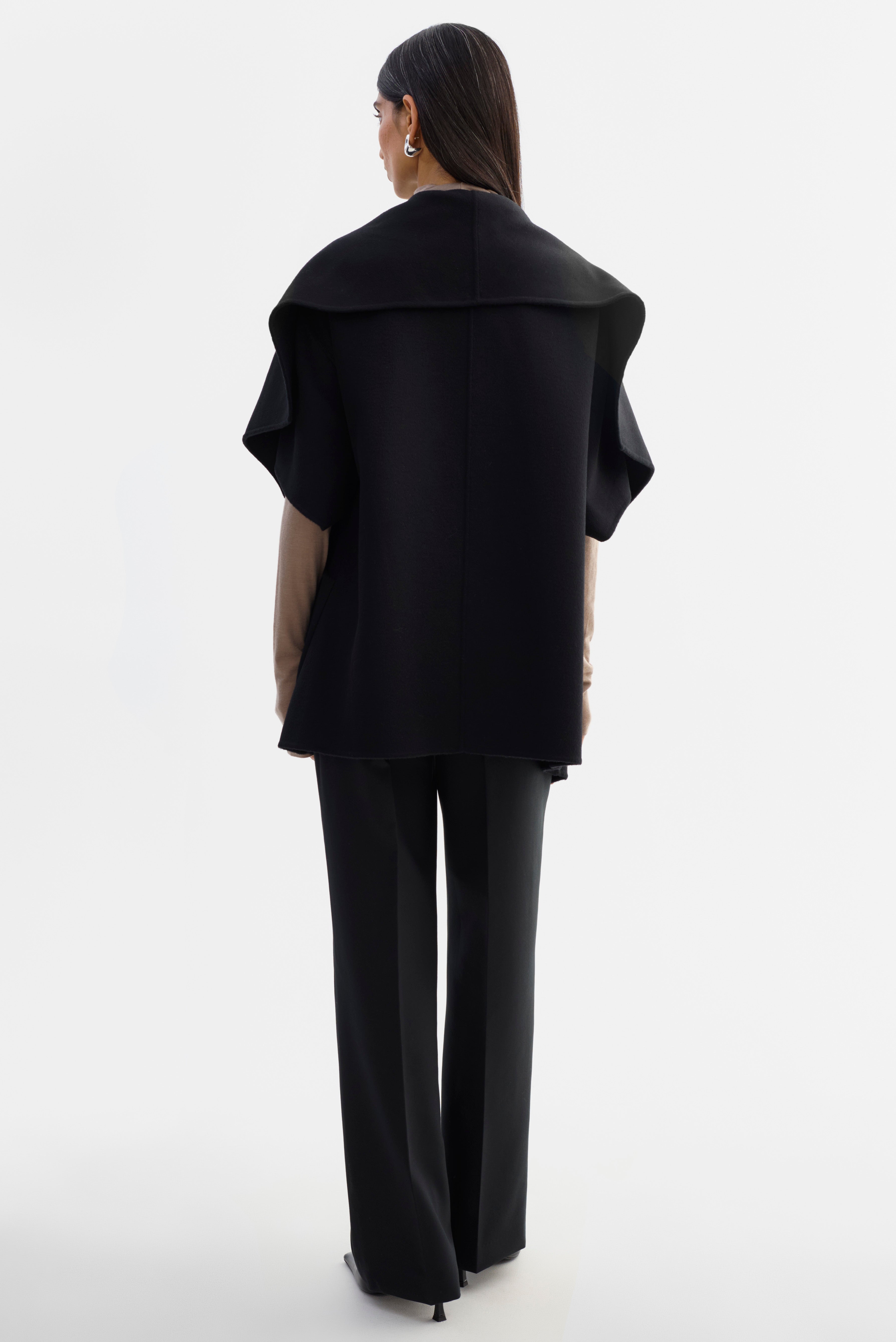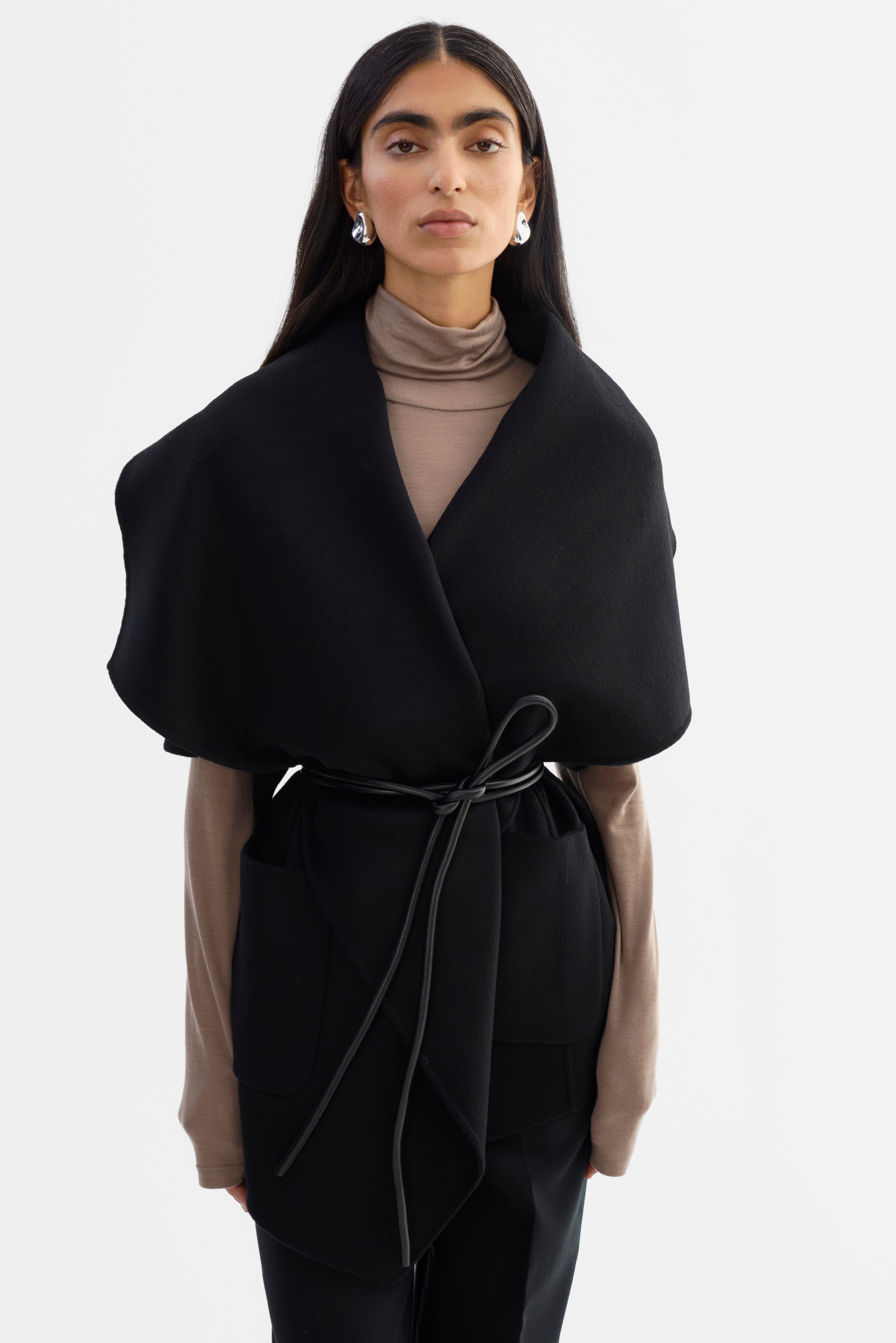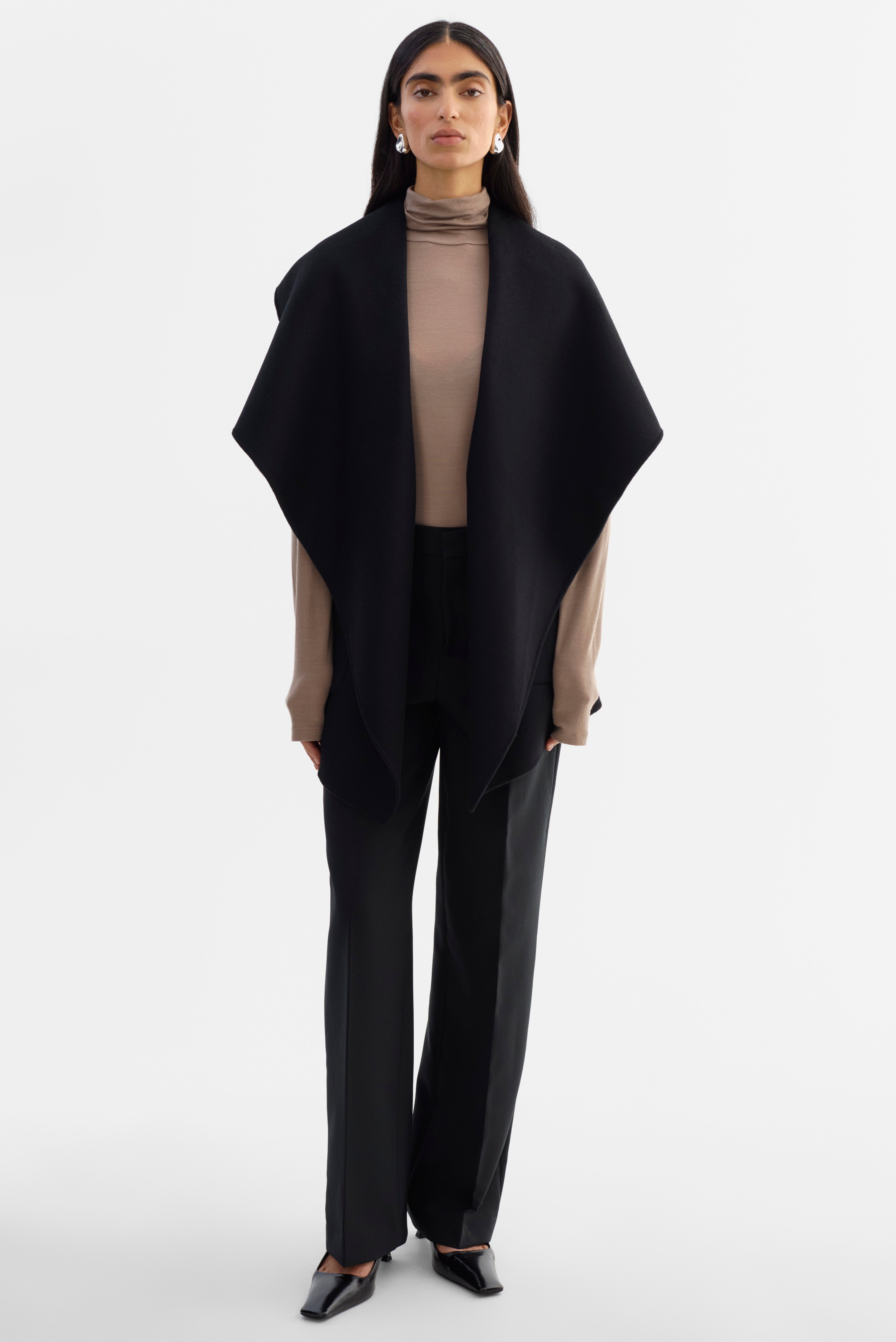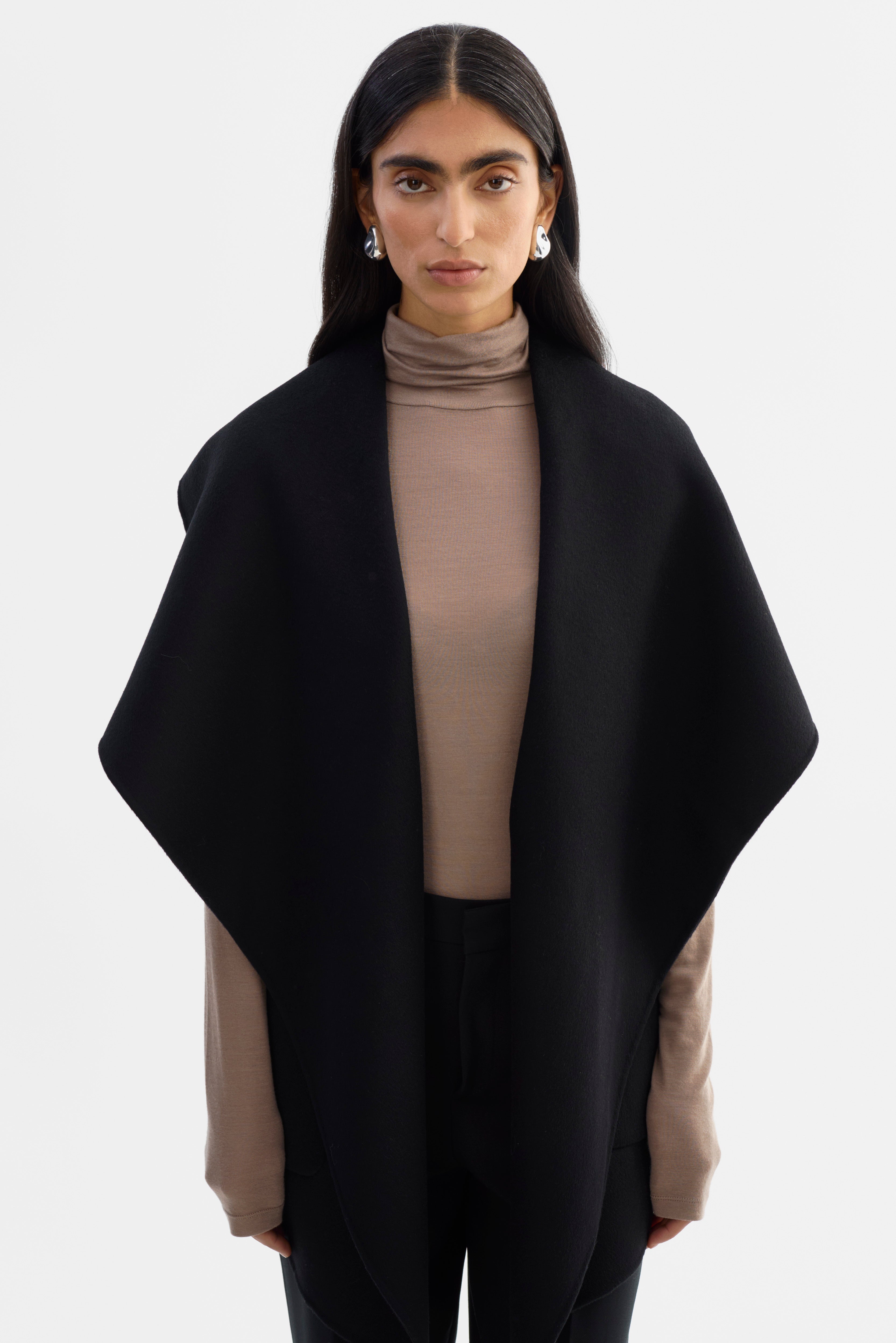 Sculptural and softly structured, the ANCA Wool Scarf Jacket redefines outerwear with its modern cape silhouette and built-in scarf drape. Crafted from a warm wool blend, it features wide sleeves, tonal buttons, and oversized patch pockets for a minimalist finish with maximum impact.
