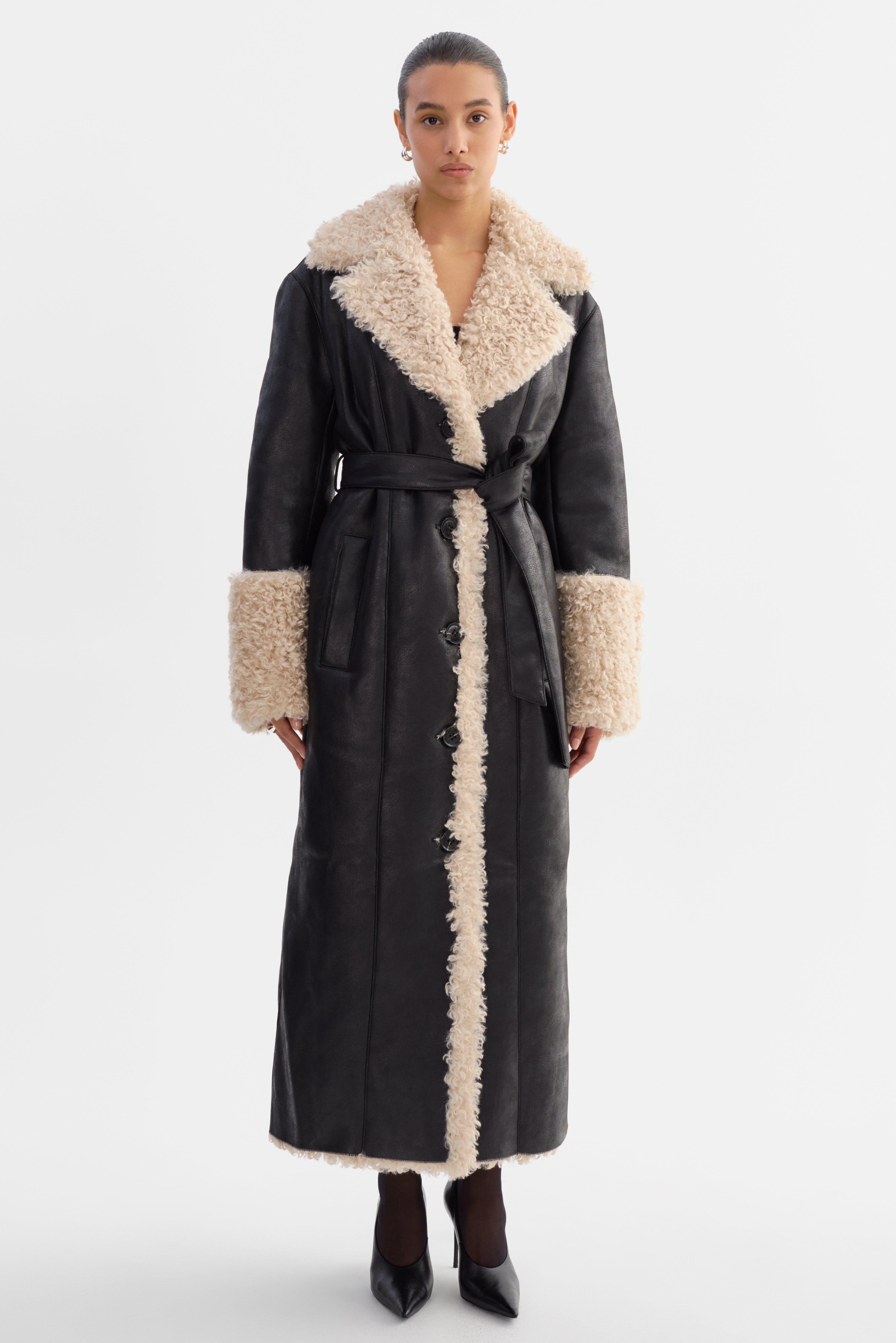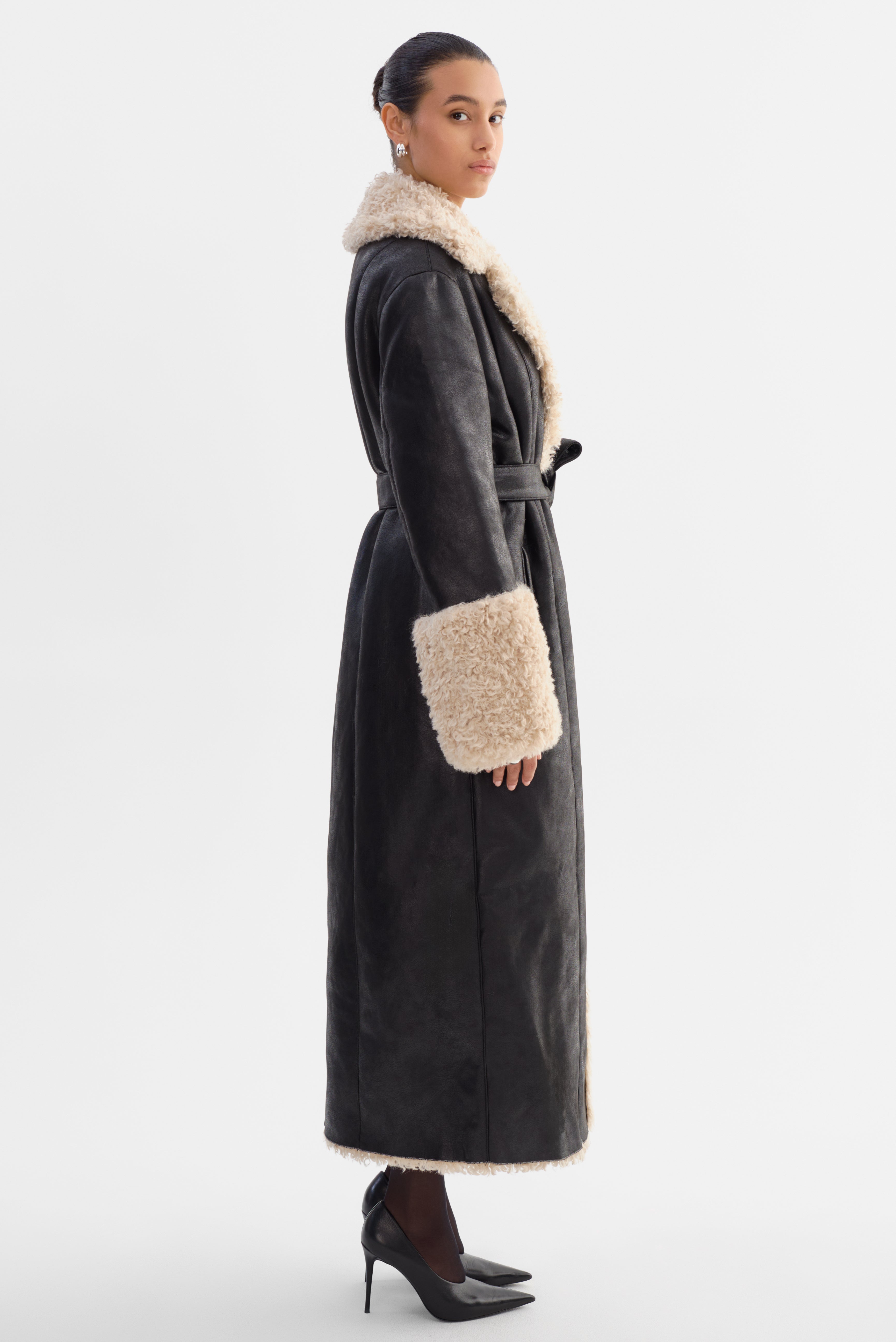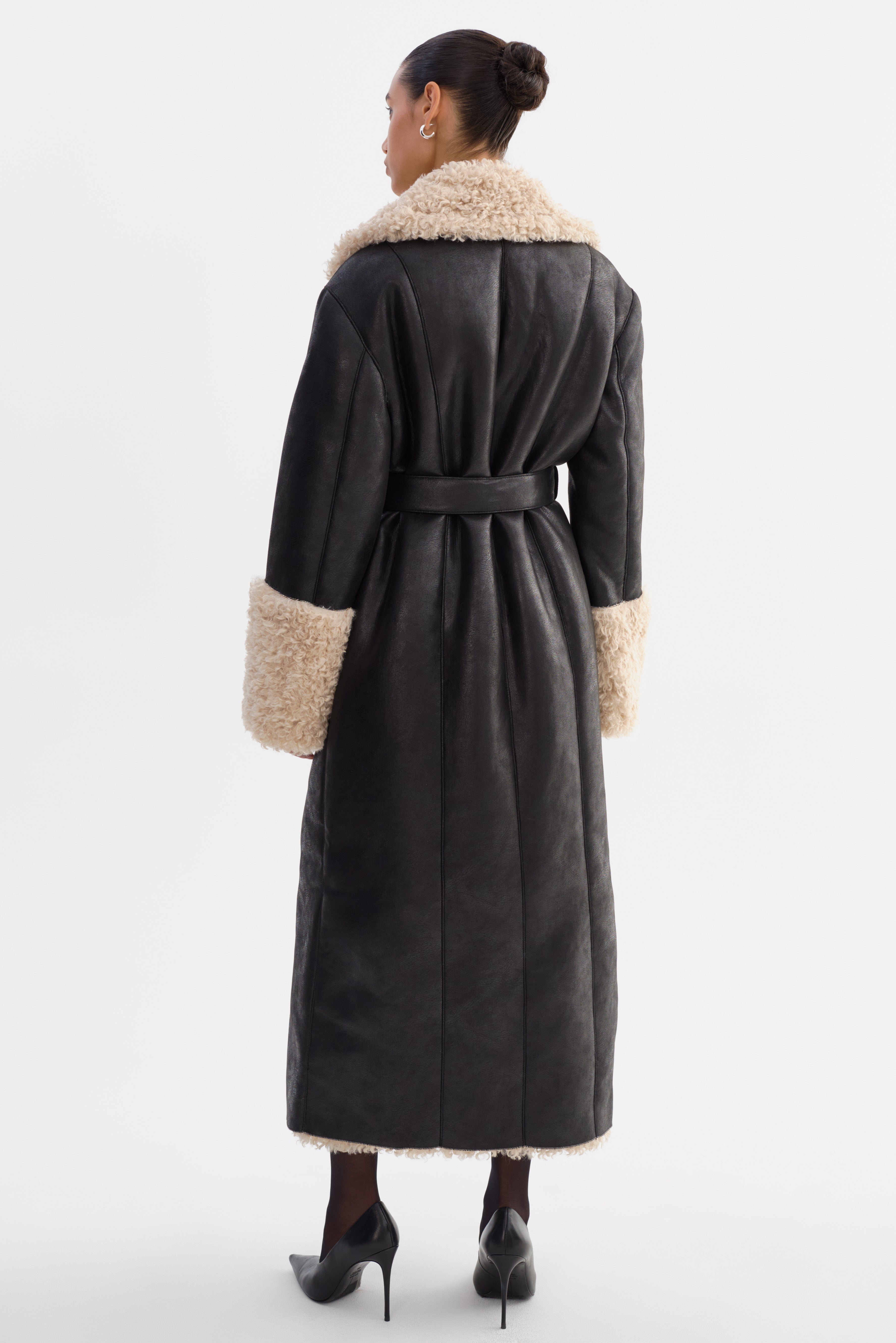 The POLLY Mixed Media Maxi Coat makes a striking statement with its floor-grazing length and bold contrast faux shearling trim. Designed with a notched collar and turned-up cuffs, it brings texture and structure to cold-weather dressing. The belted waist defines the silhouette, while welt pockets add a functional touch.