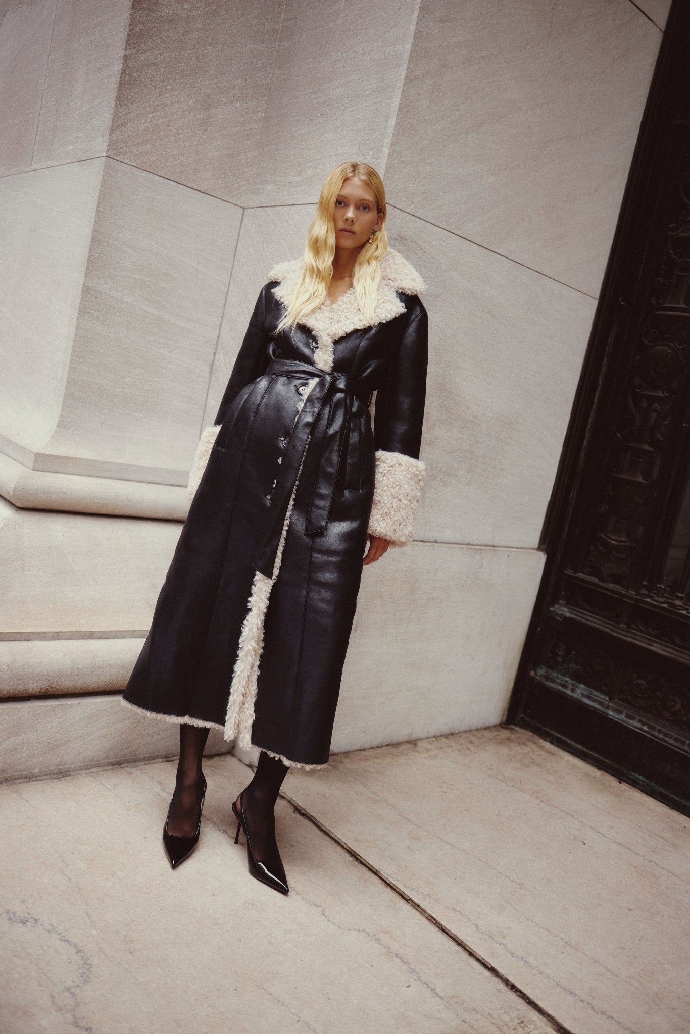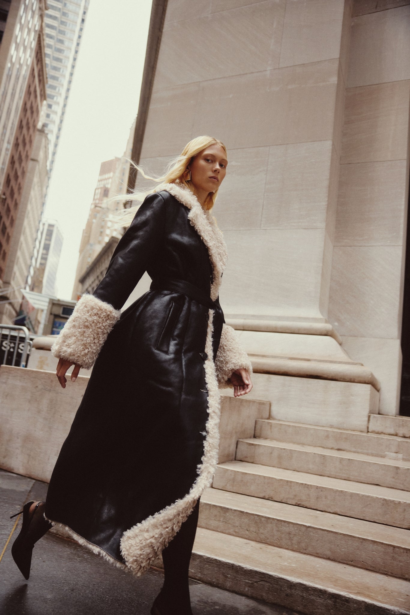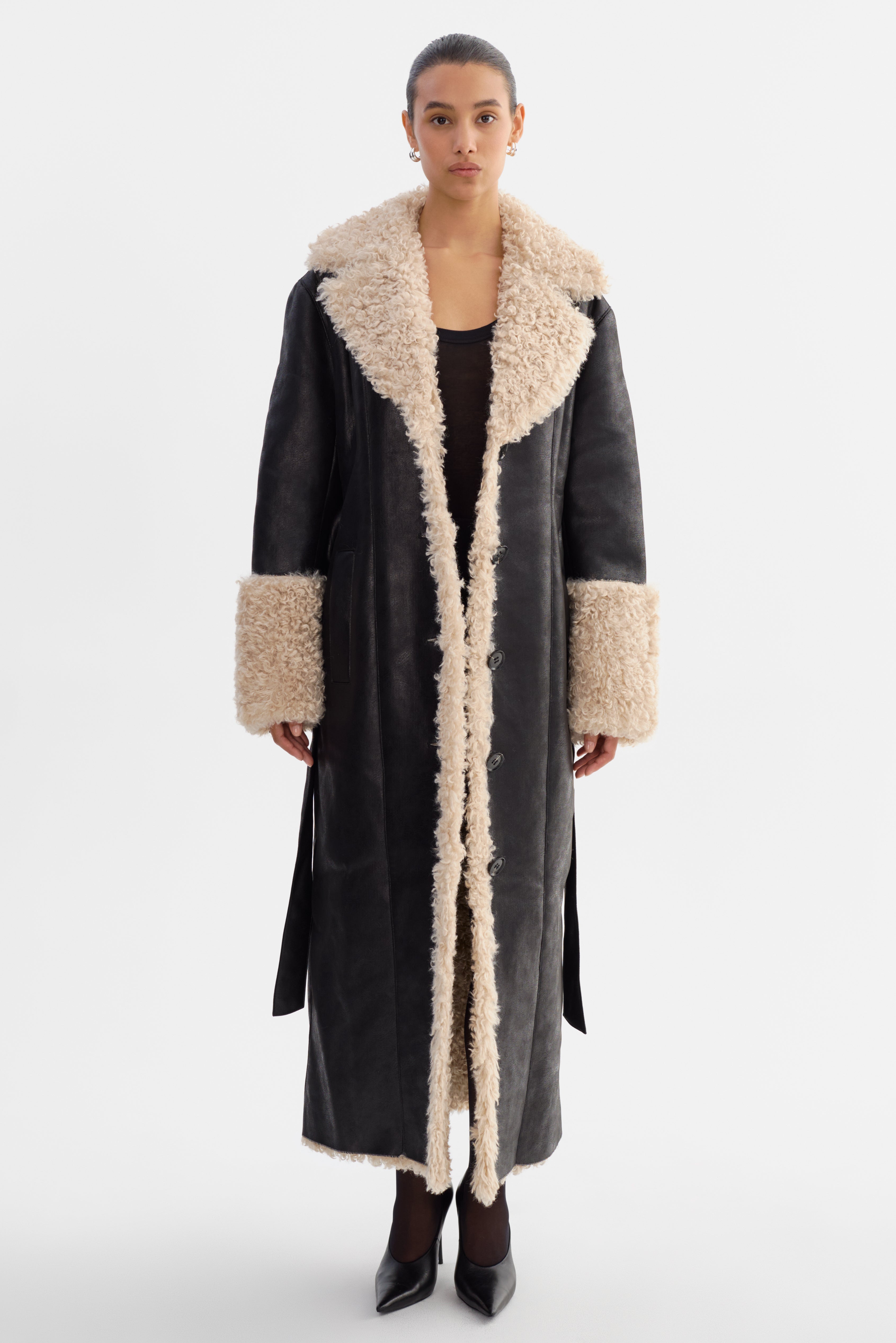 The POLLY Mixed Media Maxi Coat makes a striking statement with its floor-grazing length and bold contrast faux shearling trim. Designed with a notched collar and turned-up cuffs, it brings texture and structure to cold-weather dressing. The belted waist defines the silhouette, while welt pockets add a functional touch.