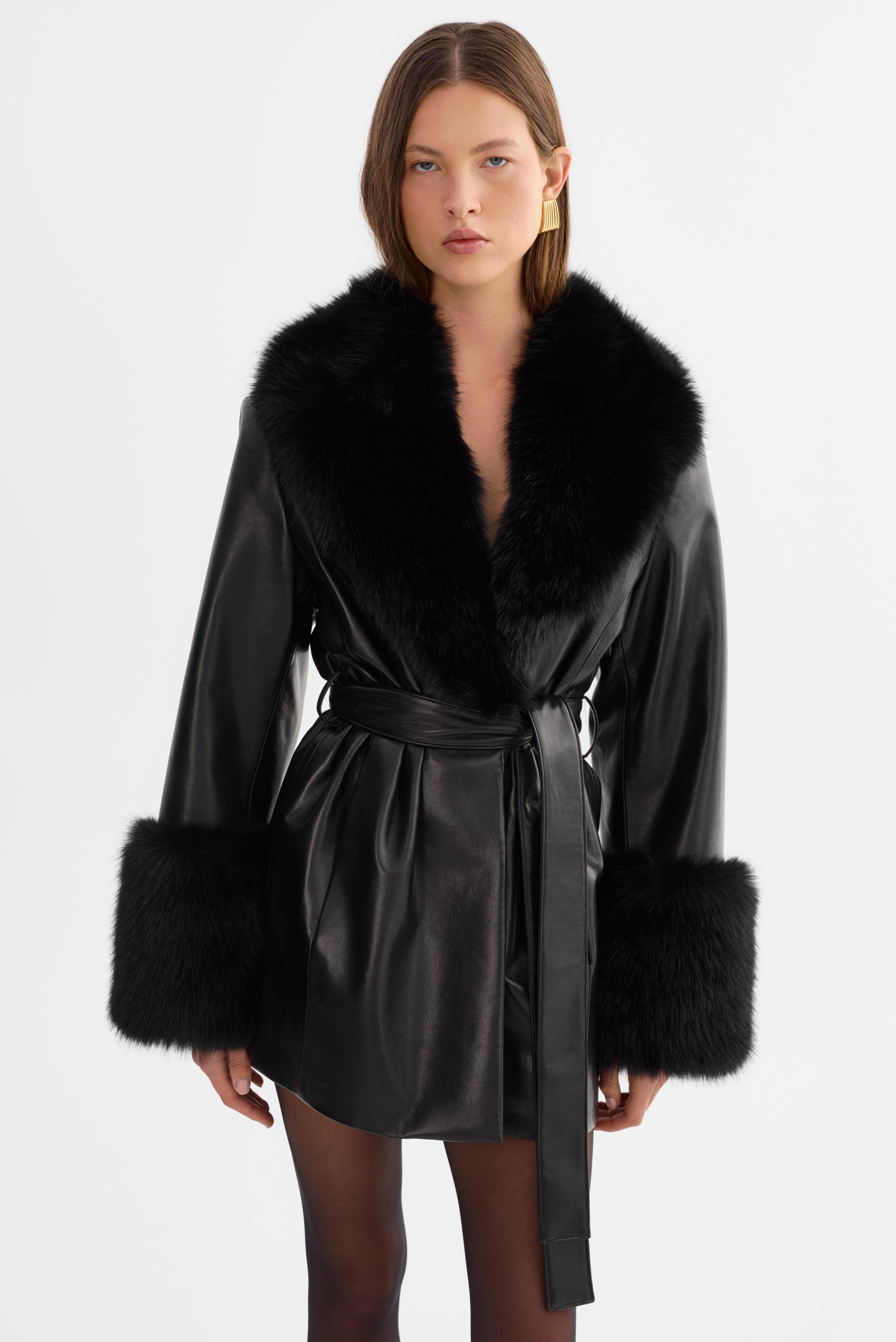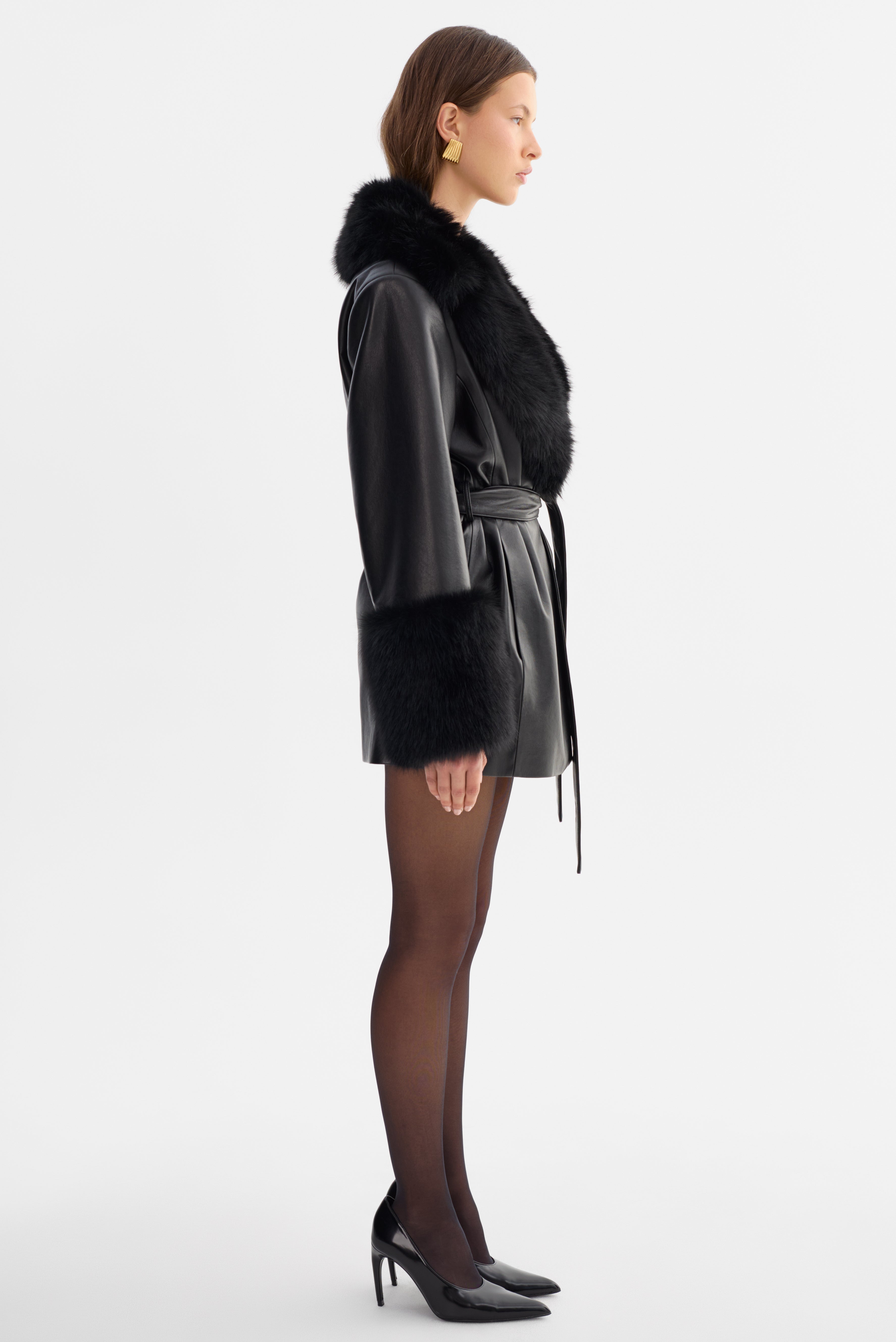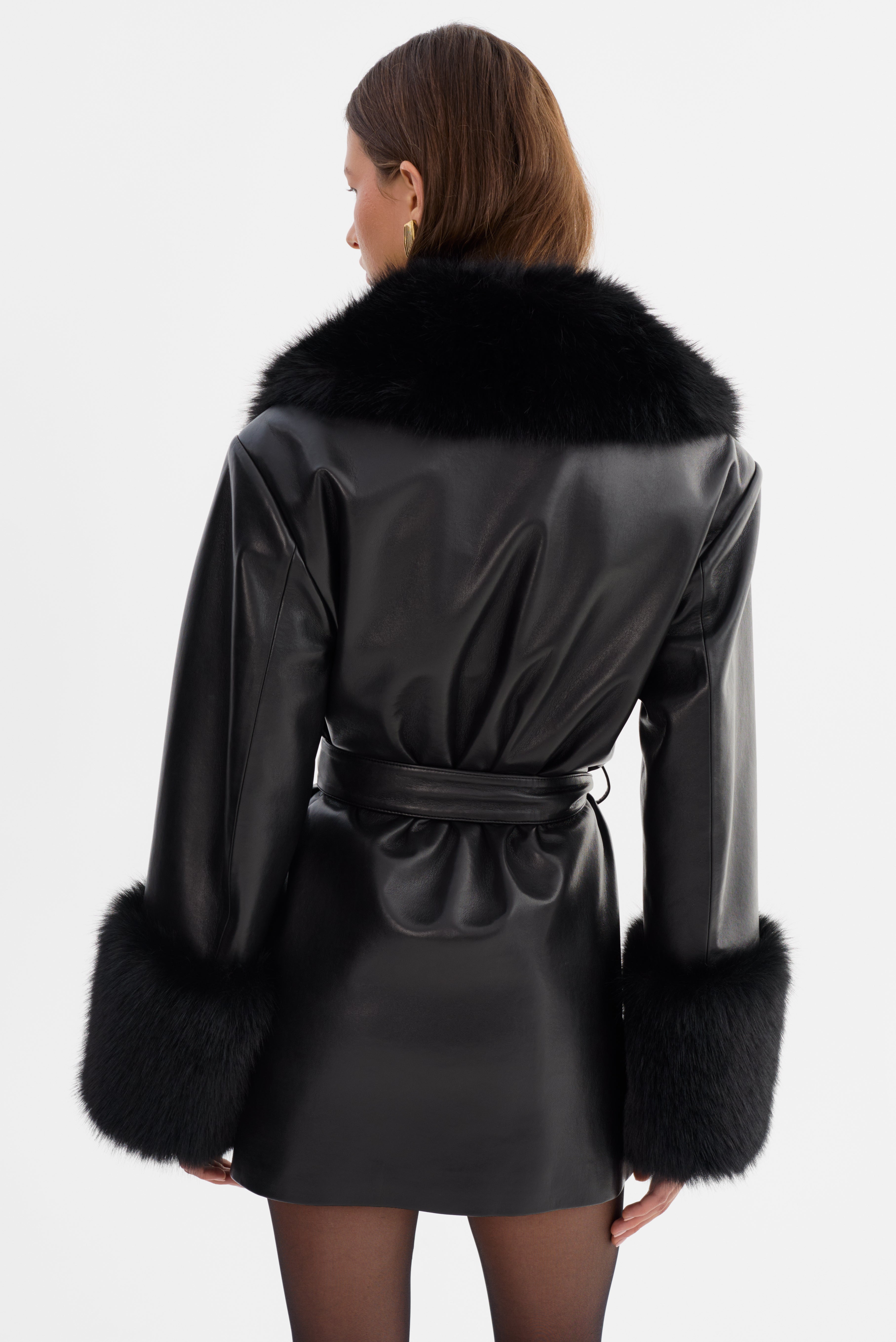 The ROSABELLA Leather Jacket balances sophistication and warmth with its faux fur details. Designed with a wide faux fur notch collar, belted waist, and  faux fur trimmed cuffs, it exudes timeless elegance while keeping a modern edge. A single-breasted closure and seam pockets complete the look, making it a statement piece for cold-weather dressing.