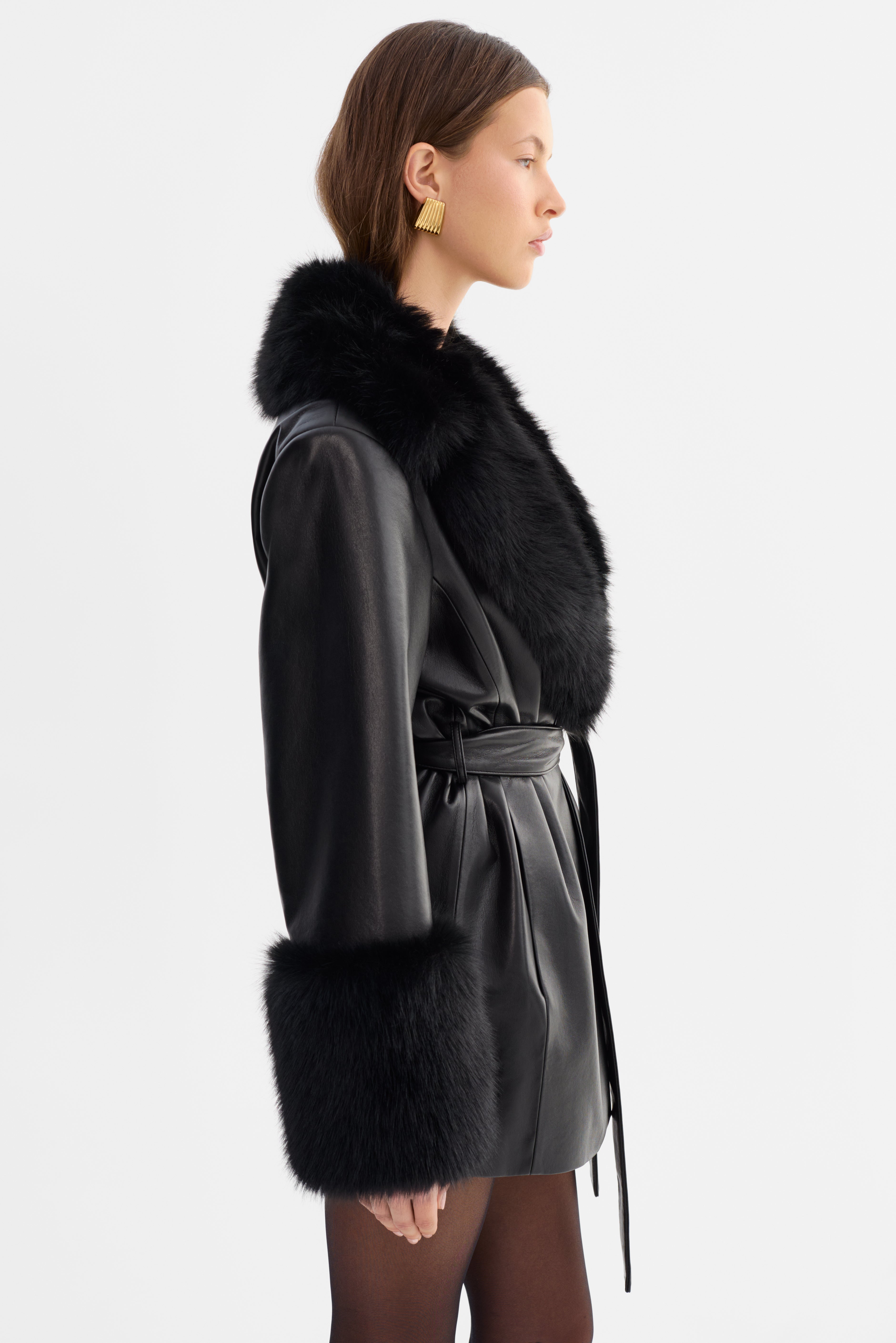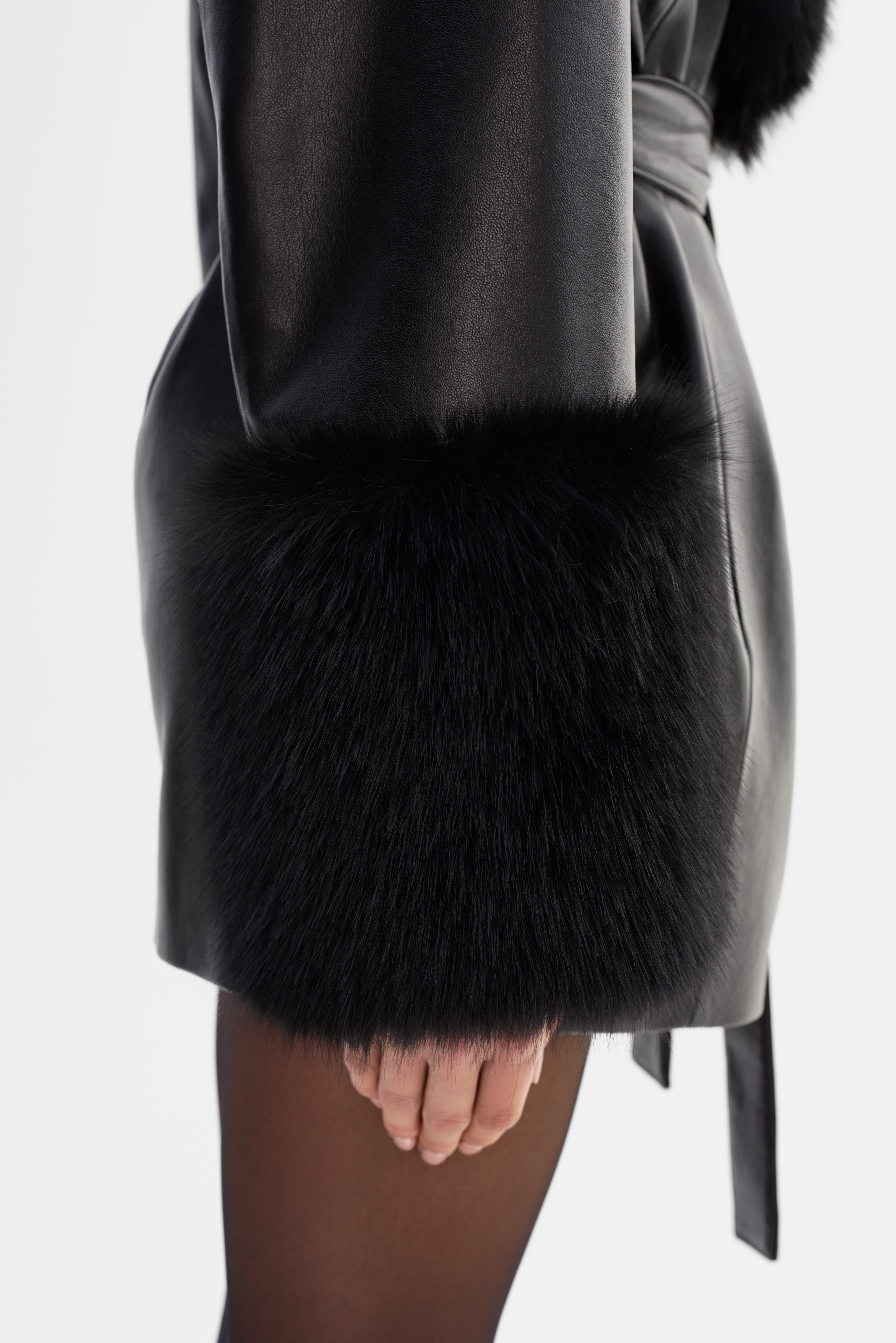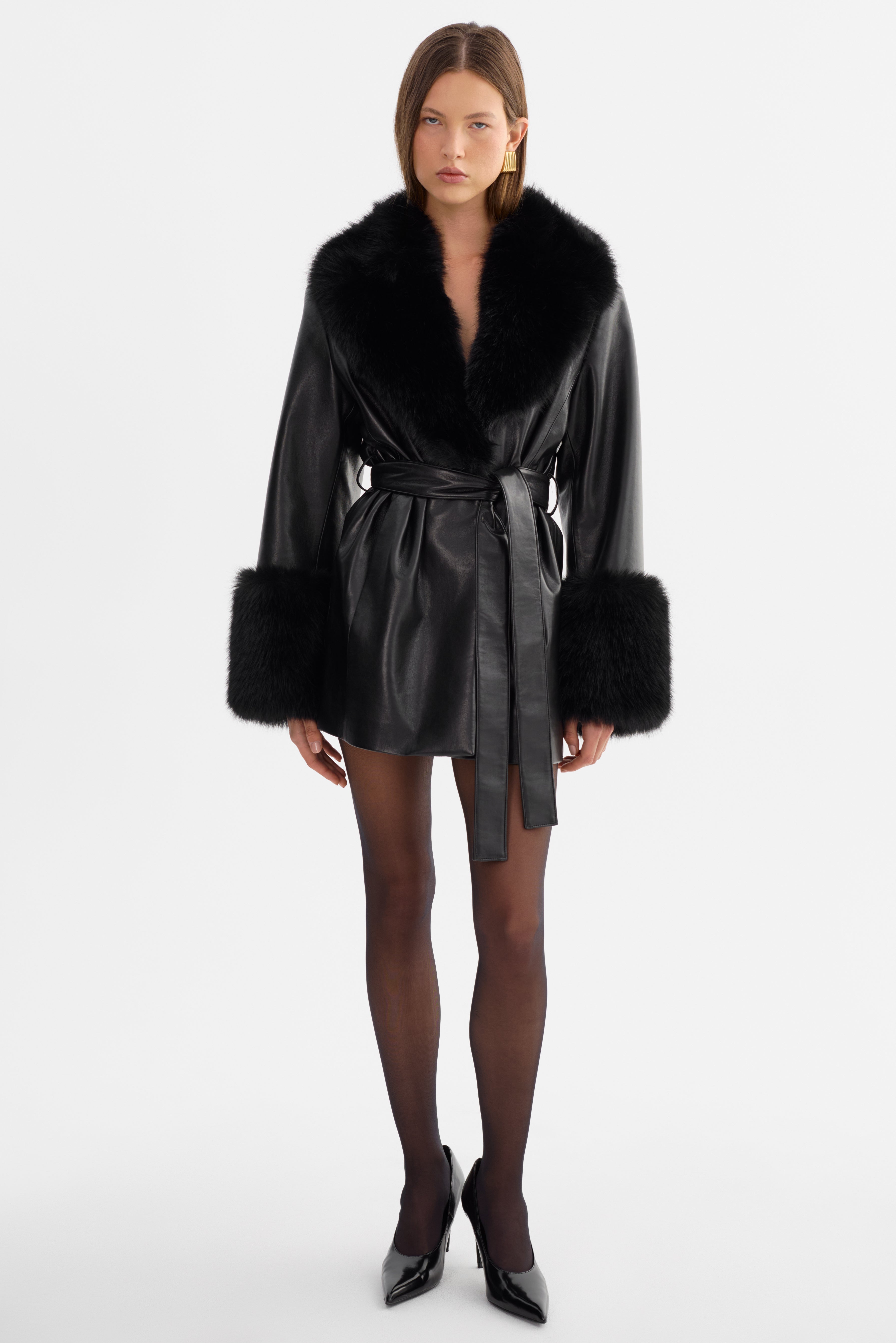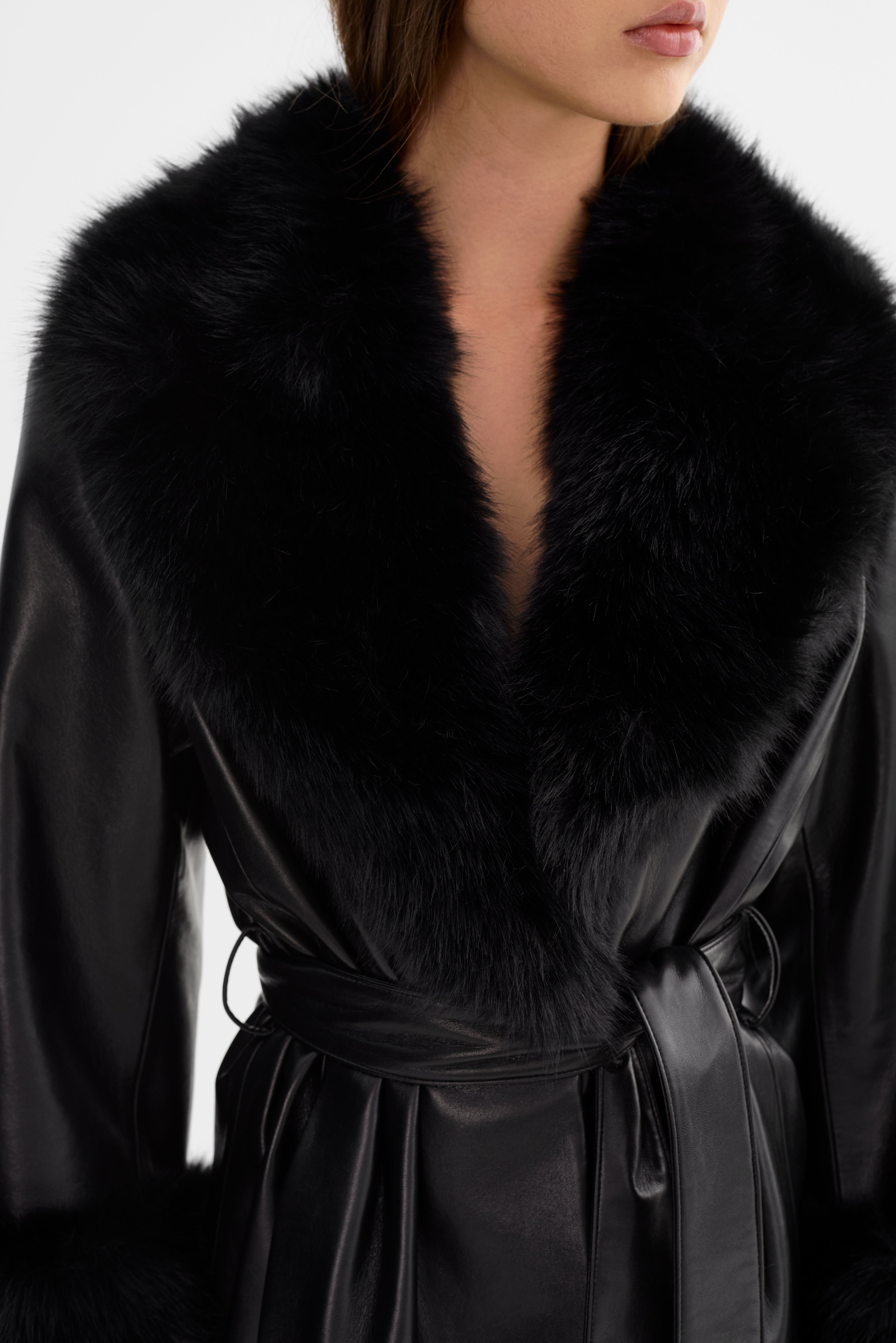 The ROSABELLA Leather Jacket balances sophistication and warmth with its faux fur details. Designed with a wide faux fur notch collar, belted waist, and  faux fur trimmed cuffs, it exudes timeless elegance while keeping a modern edge. A single-breasted closure and seam pockets complete the look, making it a statement piece for cold-weather dressing.