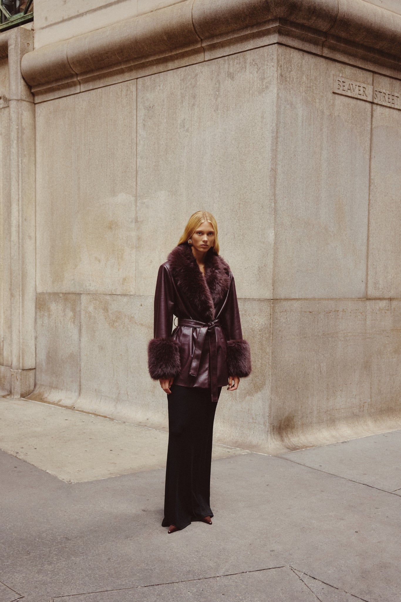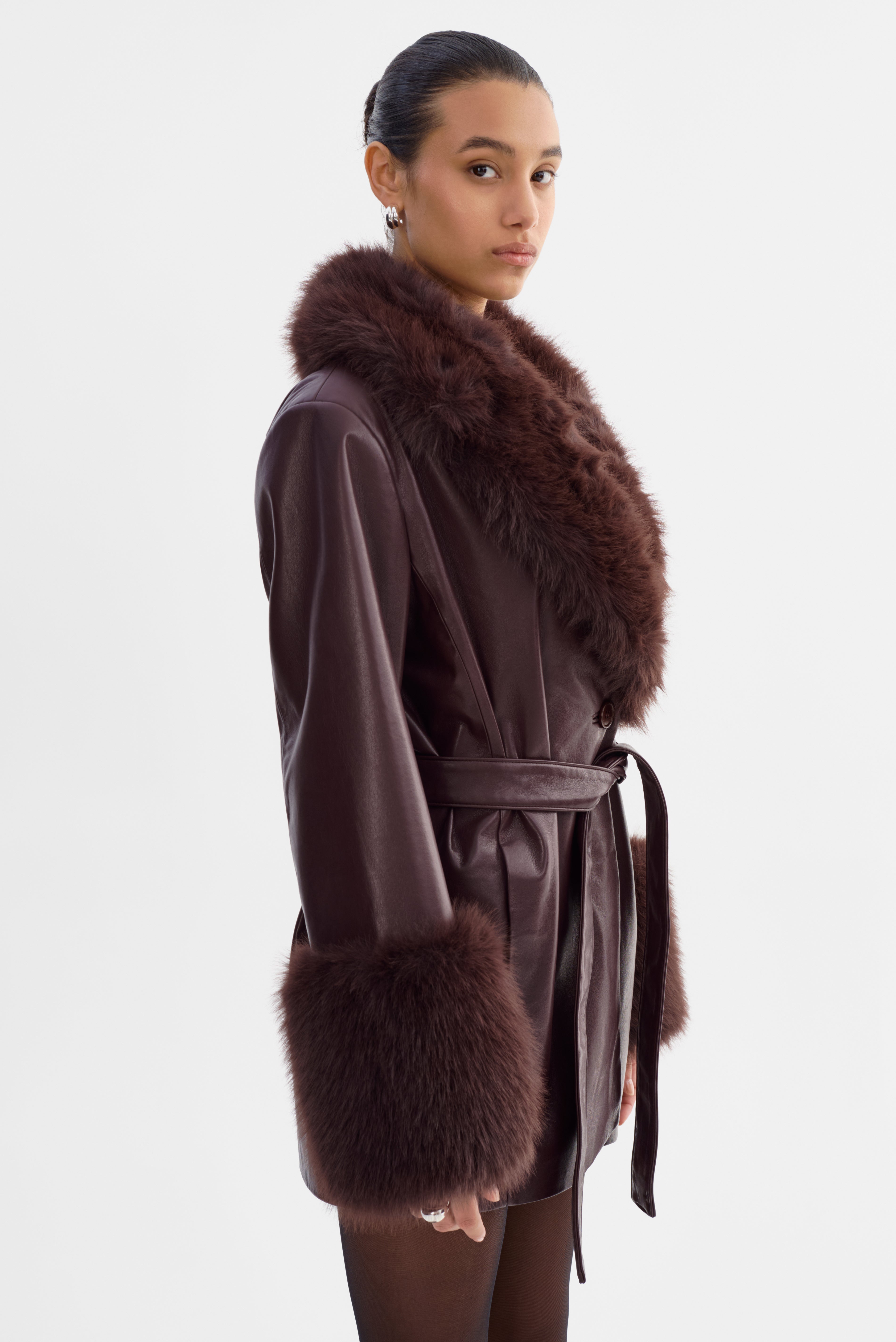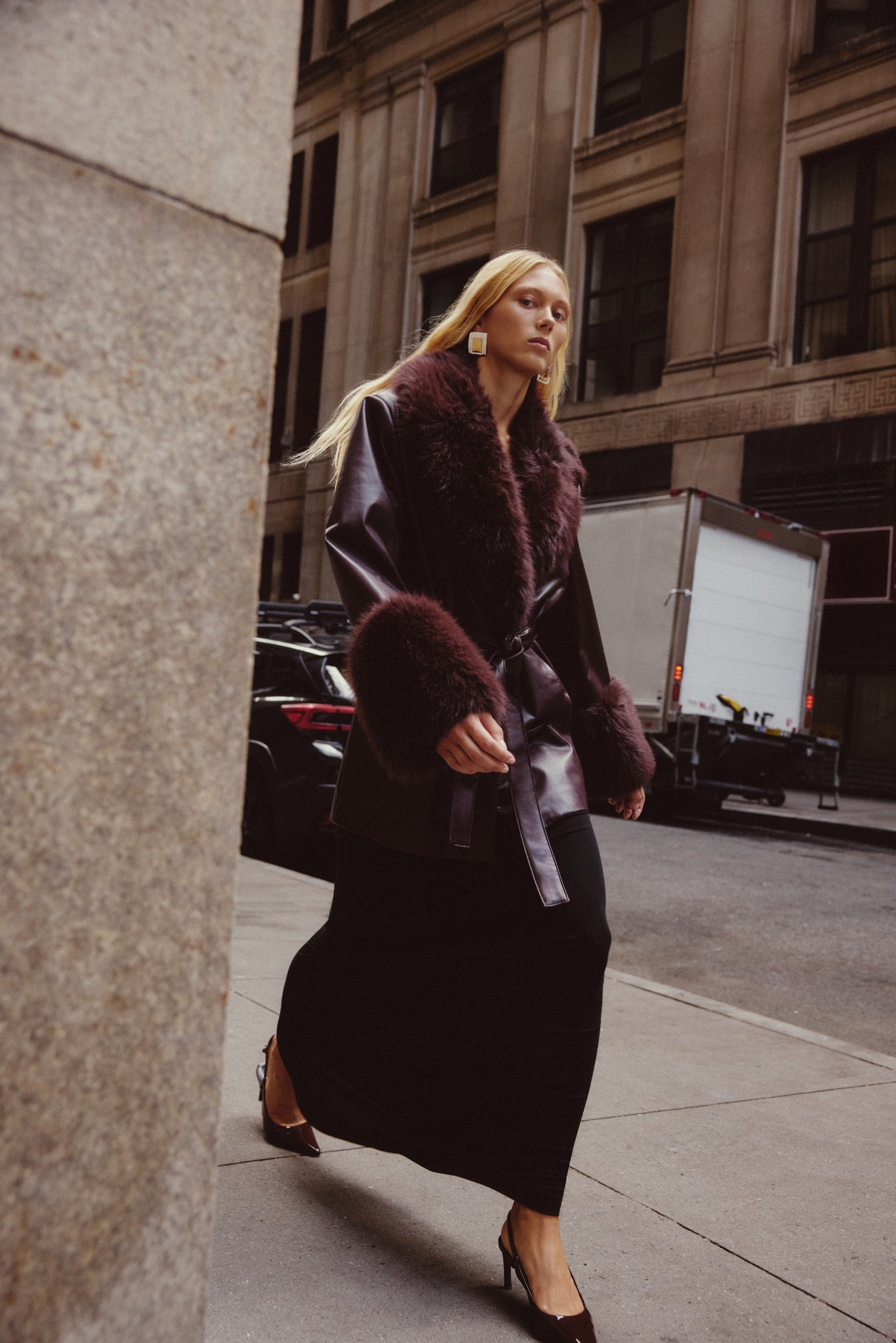 The ROSABELLA Leather Jacket balances sophistication and warmth with its faux fur details. Designed with a wide faux fur notch collar, belted waist, and faux fur trimmed cuffs, it exudes timeless elegance while keeping a modern edge. A single-breasted closure and seam pockets complete the look, making it a statement piece for cold-weather dressing.