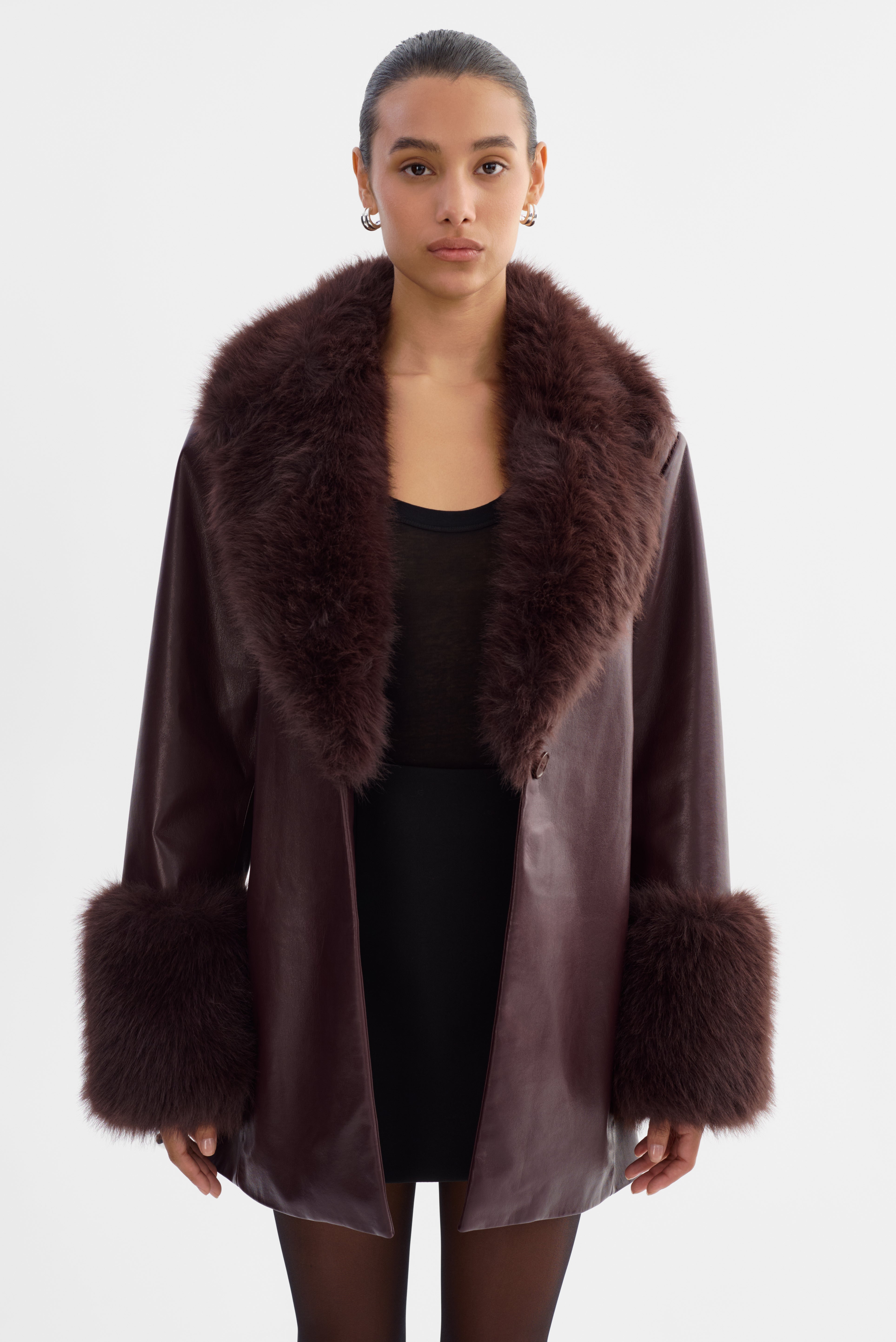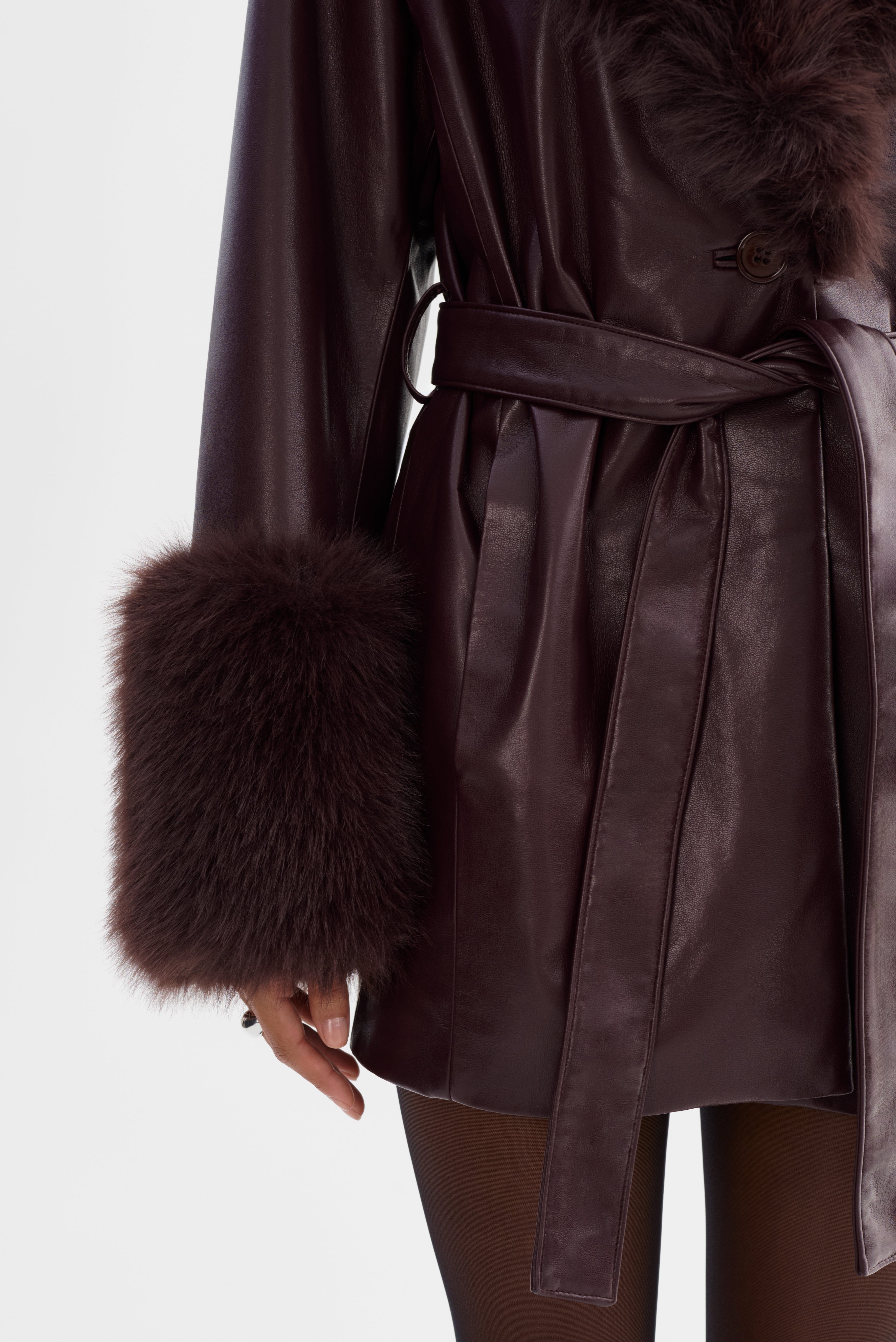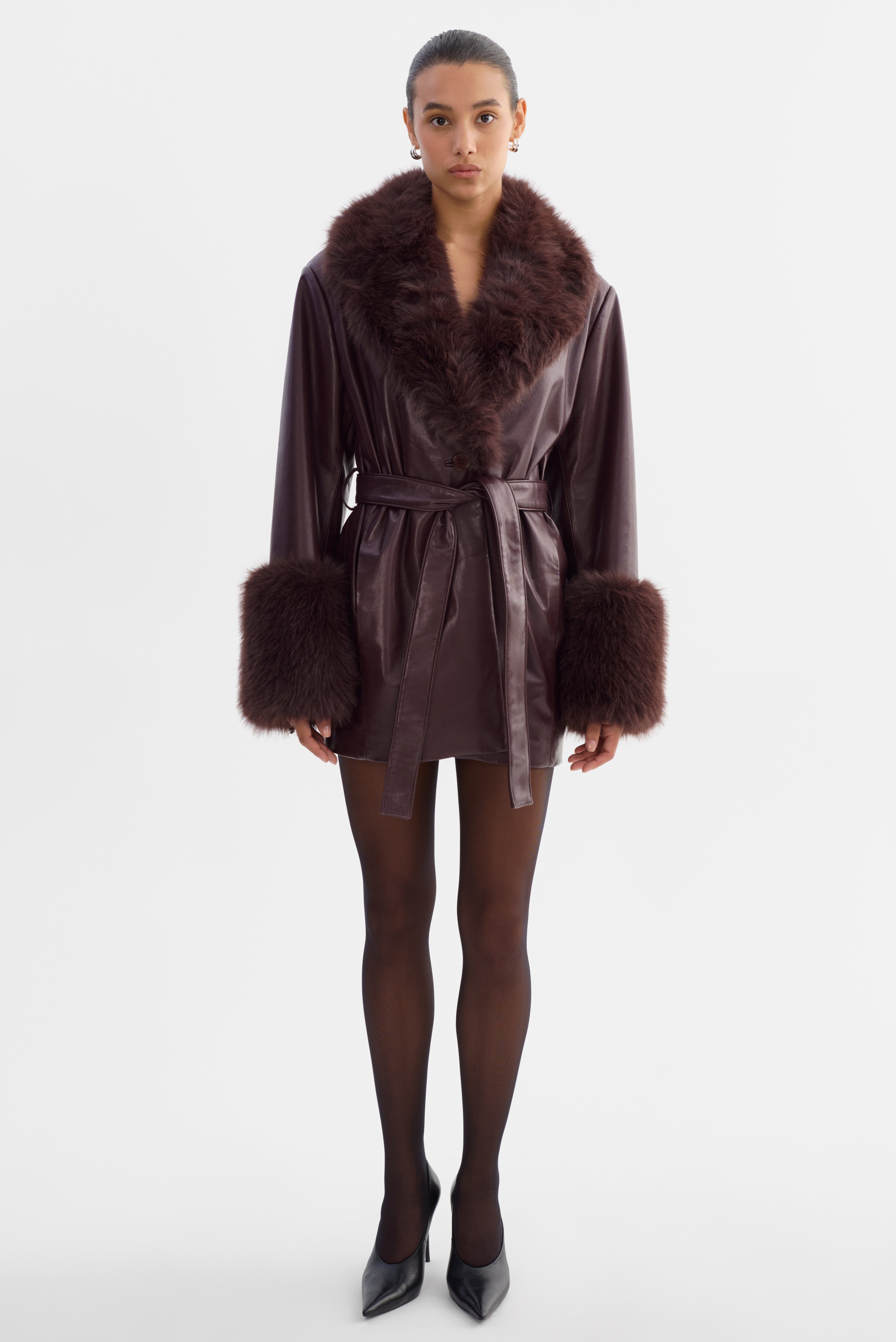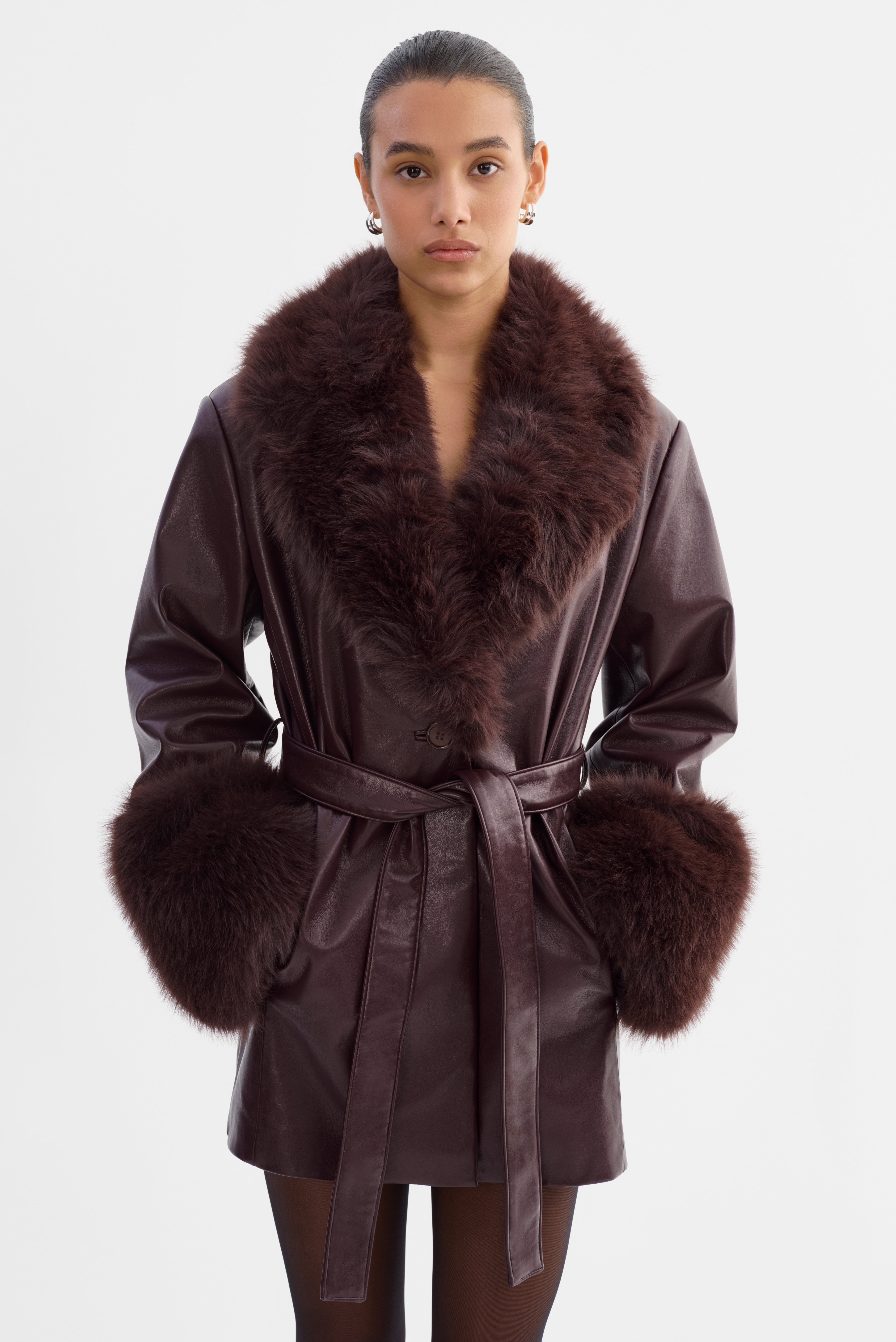 The ROSABELLA Leather Jacket balances sophistication and warmth with its faux fur details. Designed with a wide faux fur notch collar, belted waist, and faux fur trimmed cuffs, it exudes timeless elegance while keeping a modern edge. A single-breasted closure and seam pockets complete the look, making it a statement piece for cold-weather dressing.