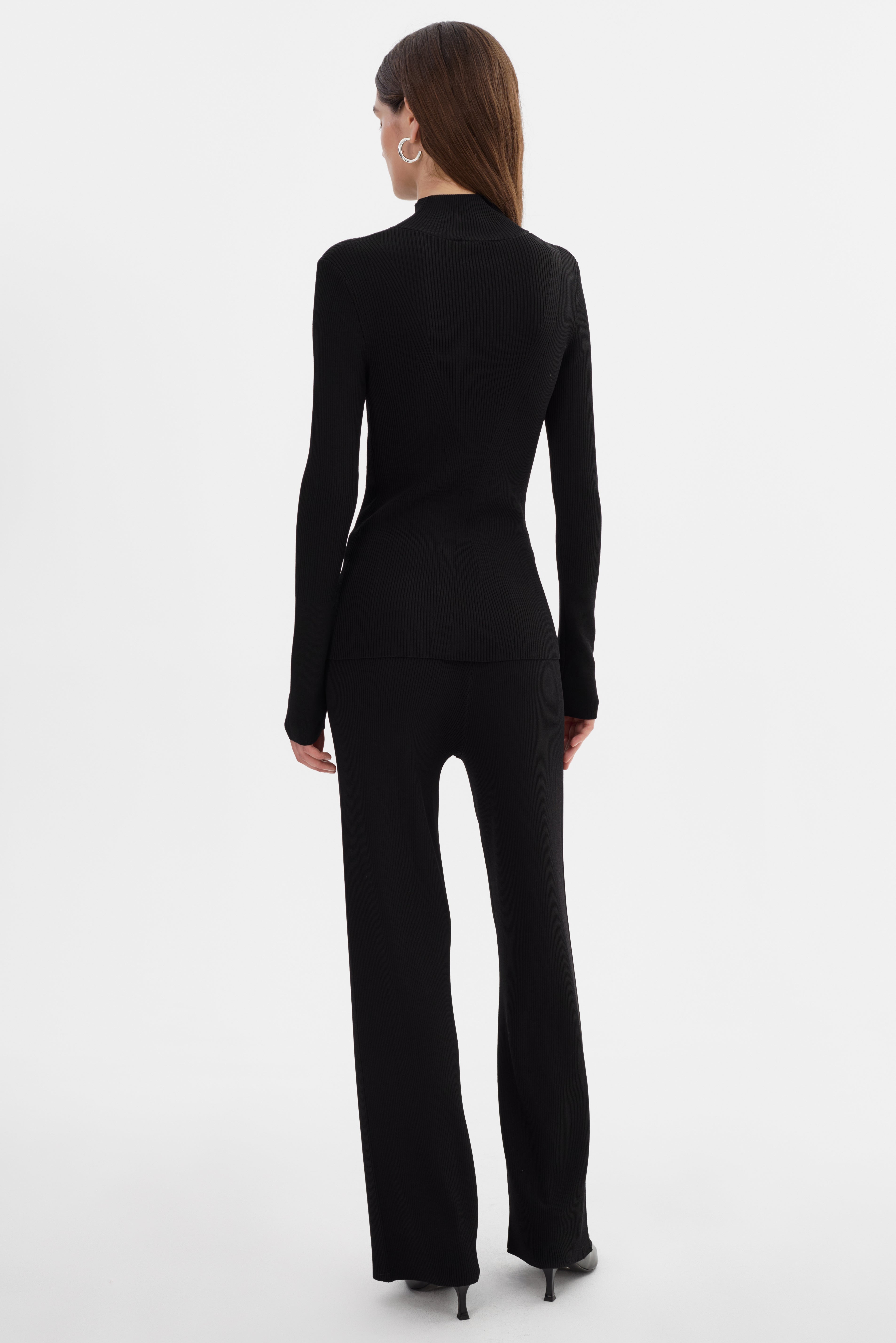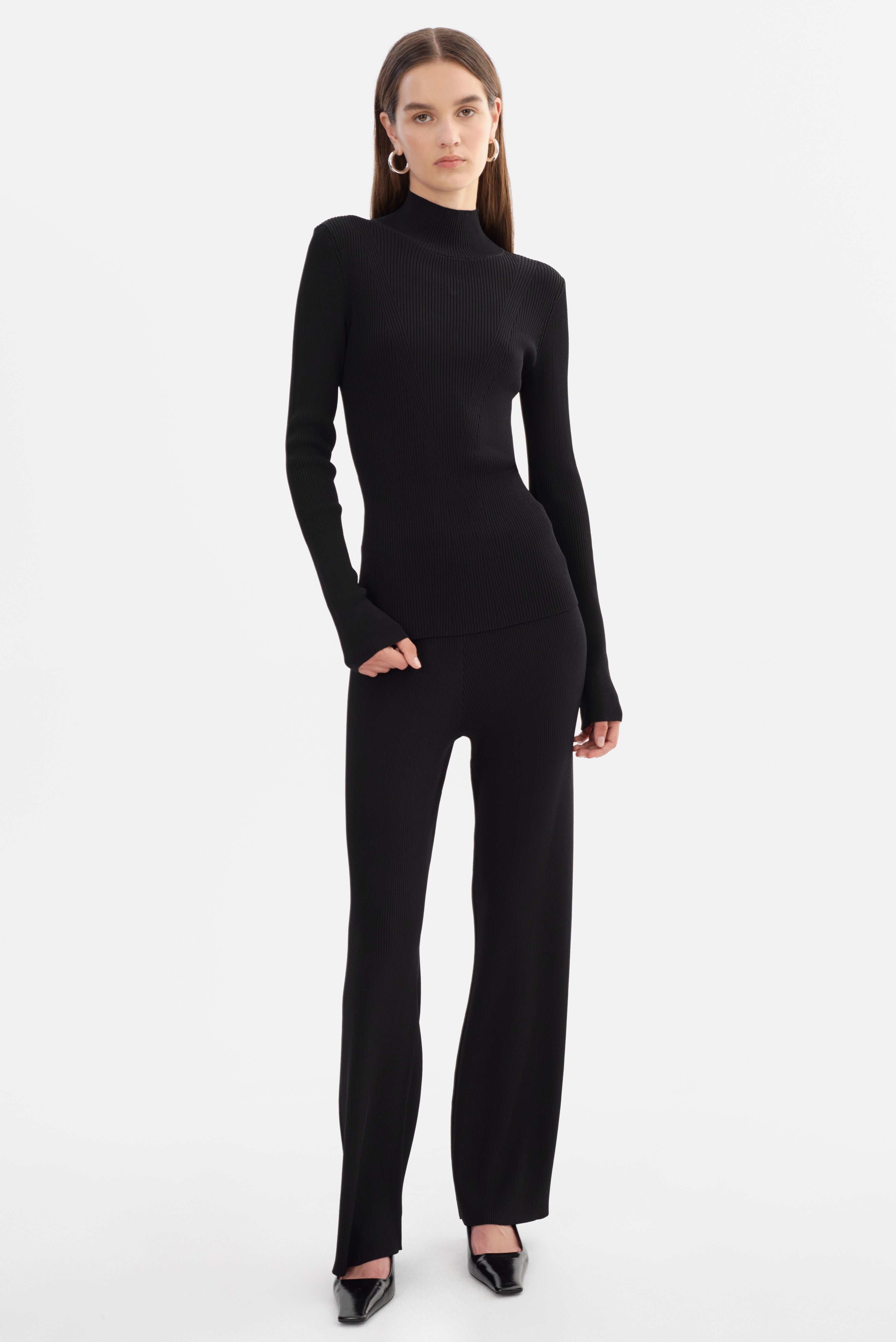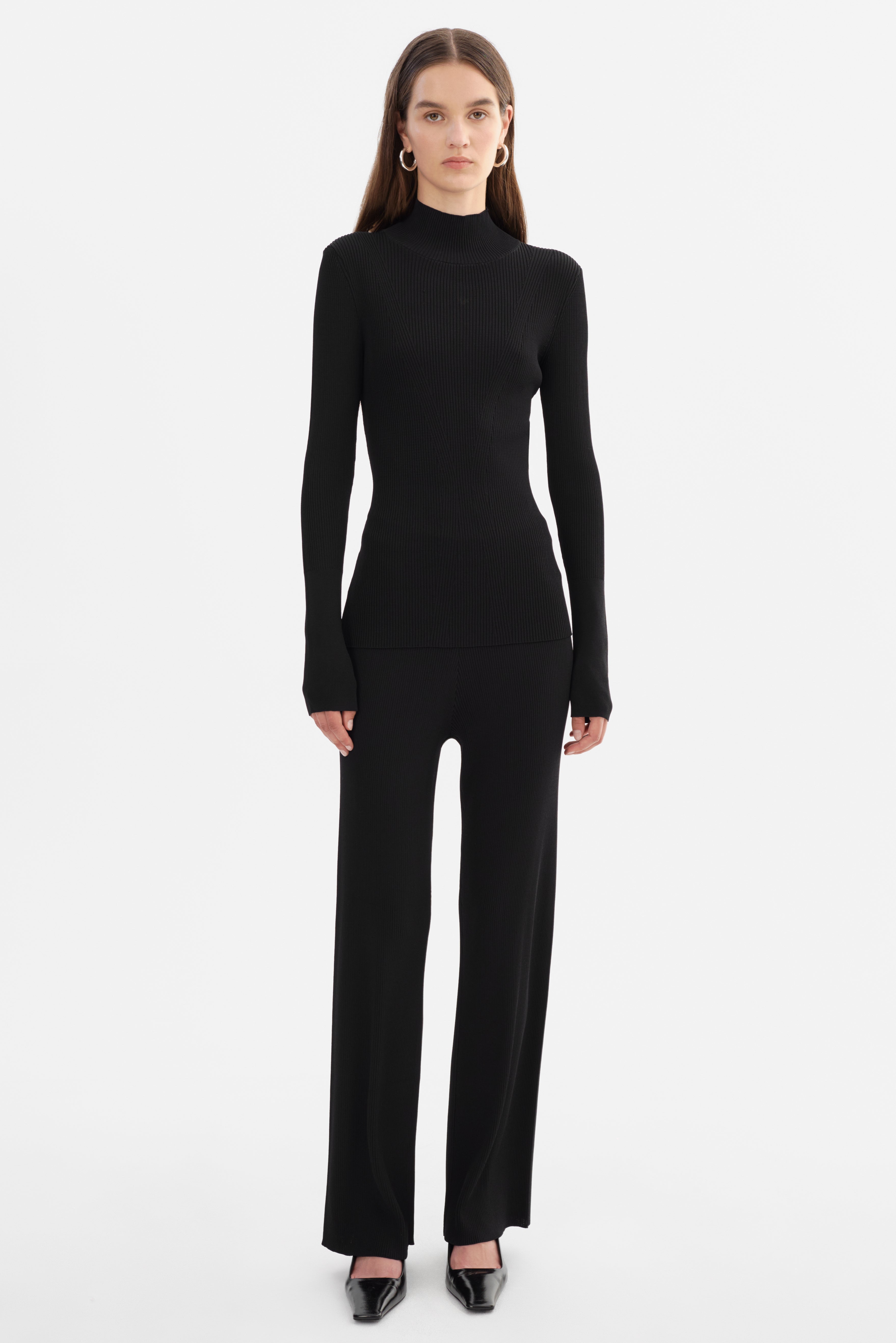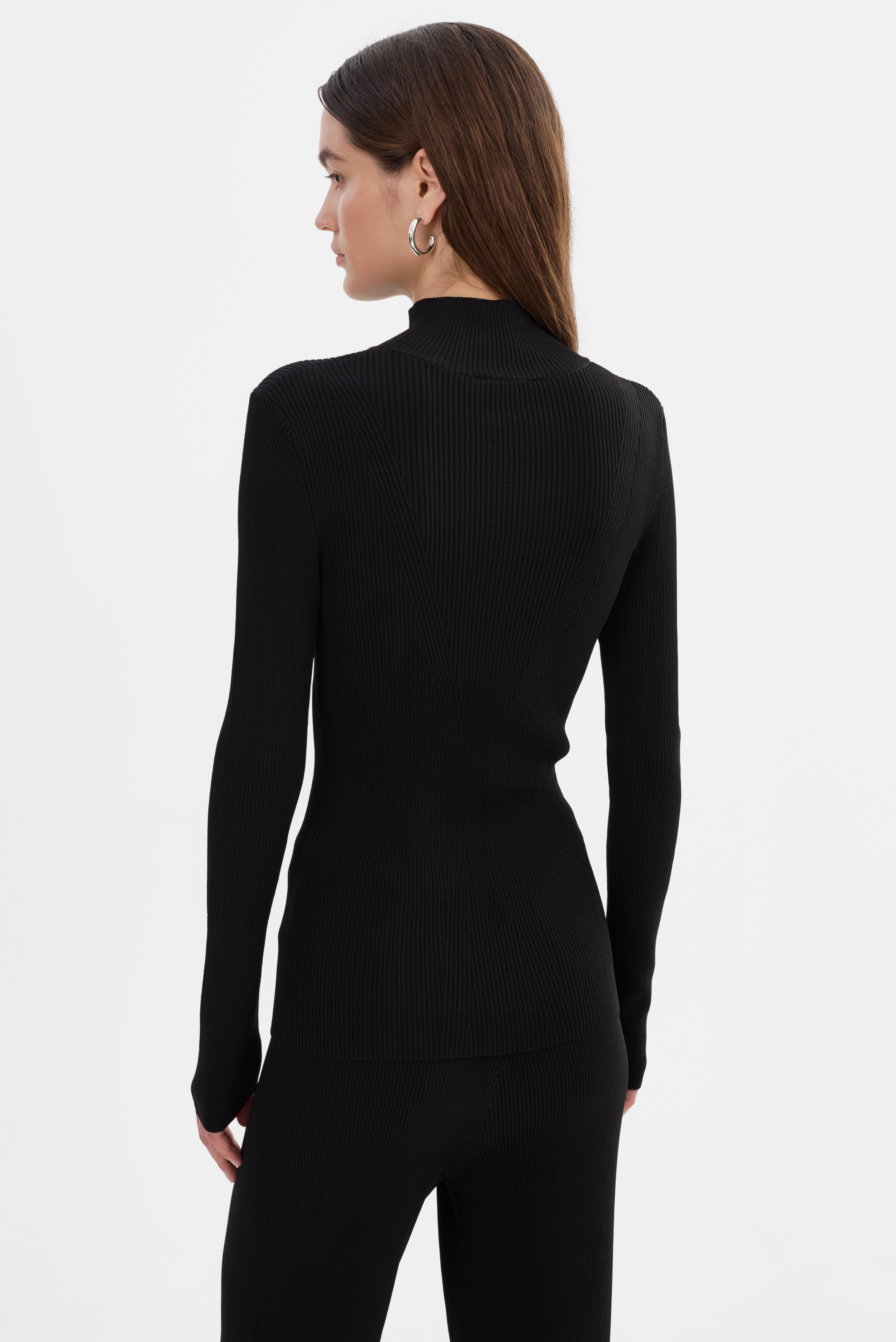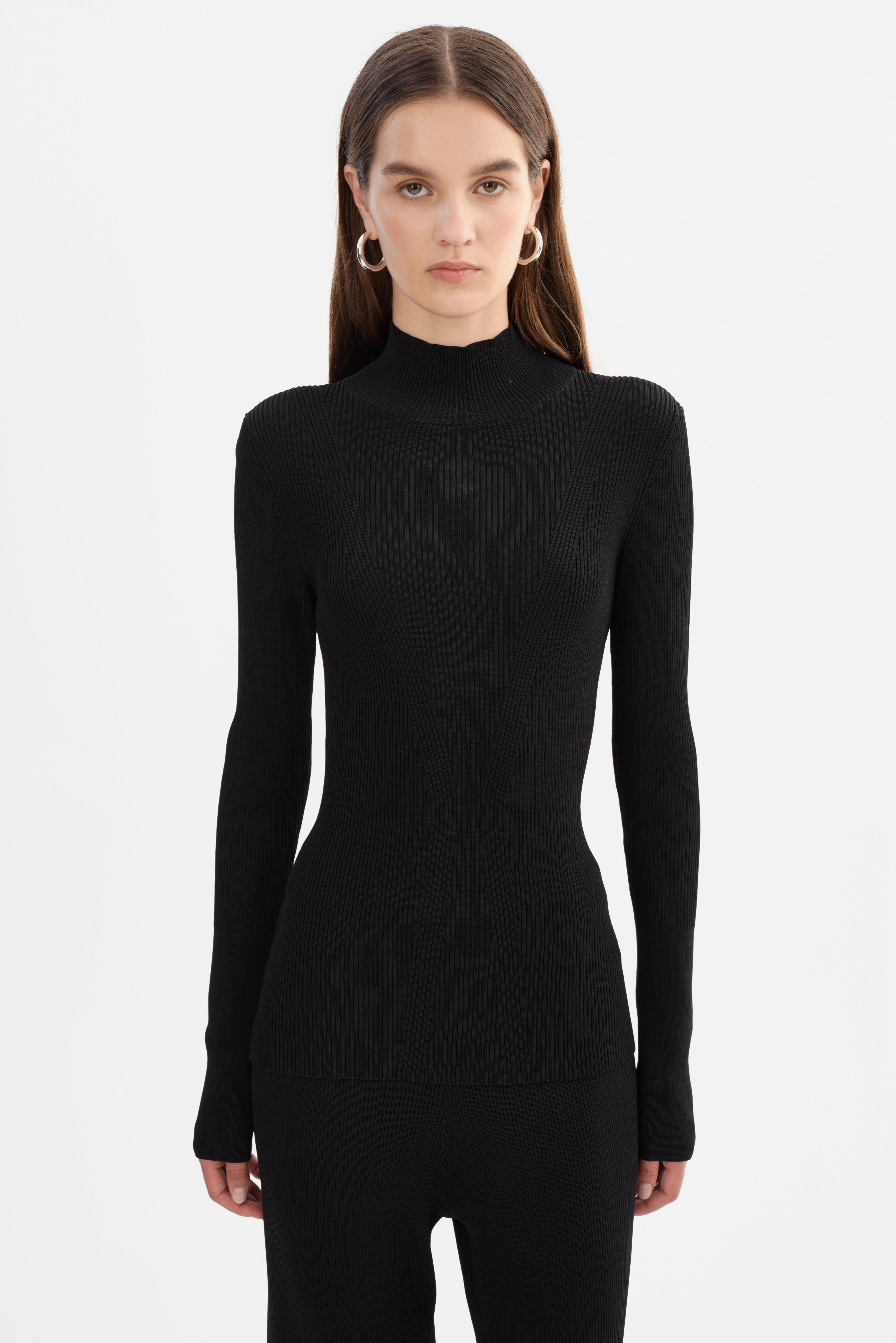 The SANDRINE Long Sleeve Mock neck Top is designed to flatter. Cut from a sculpting ribbed knit, it contours the body with precision while elongating the silhouette through sleek panel detailing. With its minimalist design and elevated mock neck, it's a go-to for effortless sophistication, whether layered or worn on its own.
