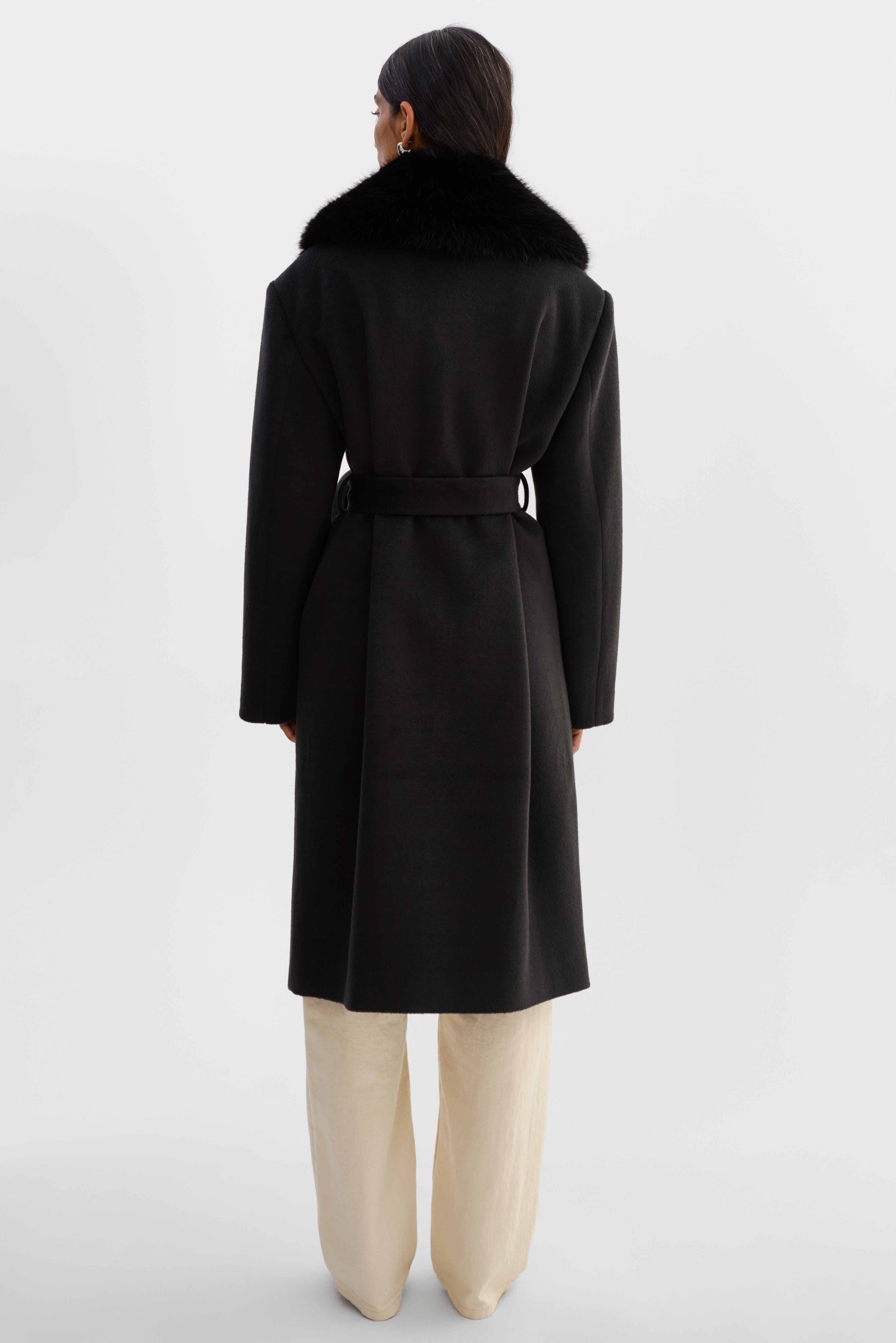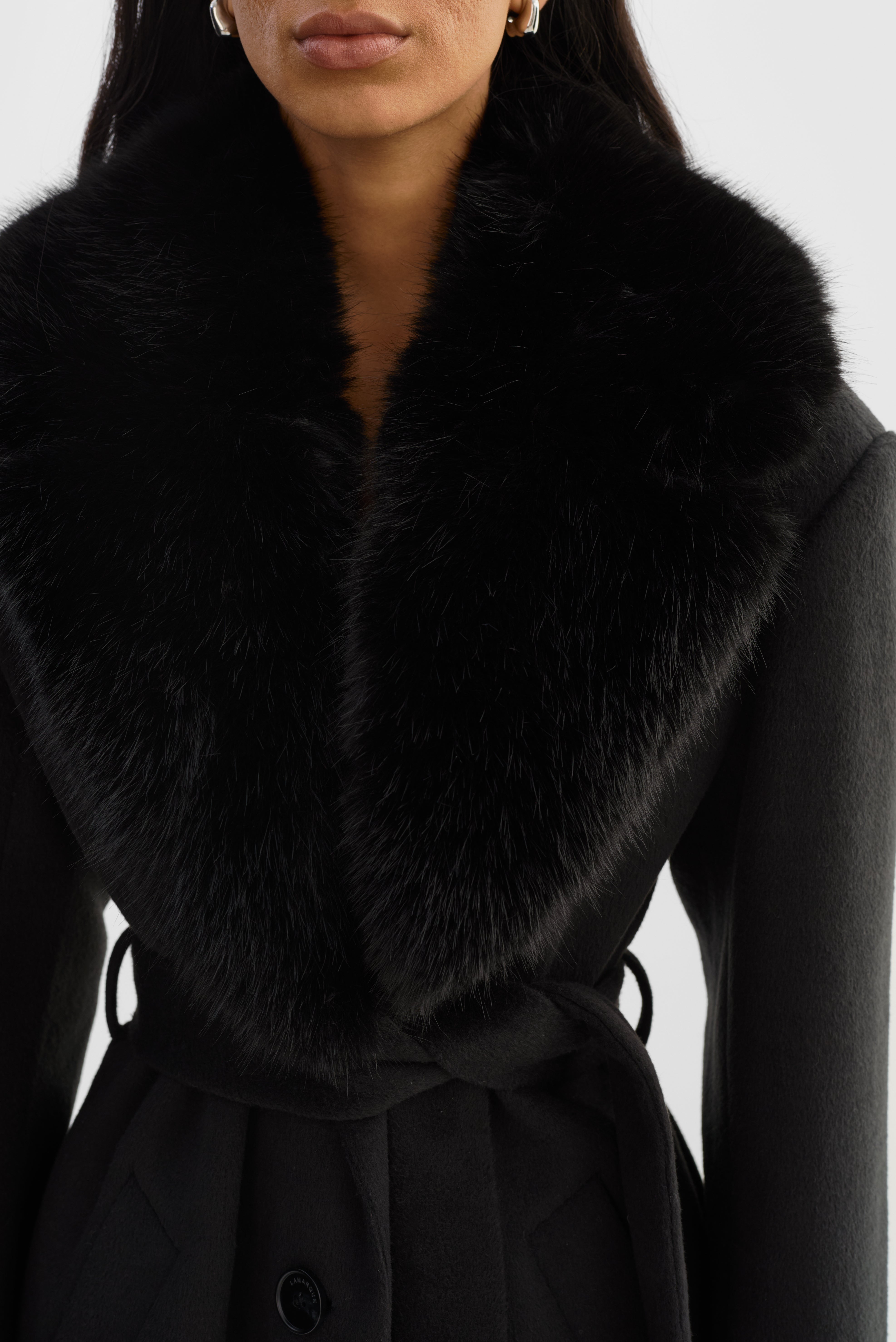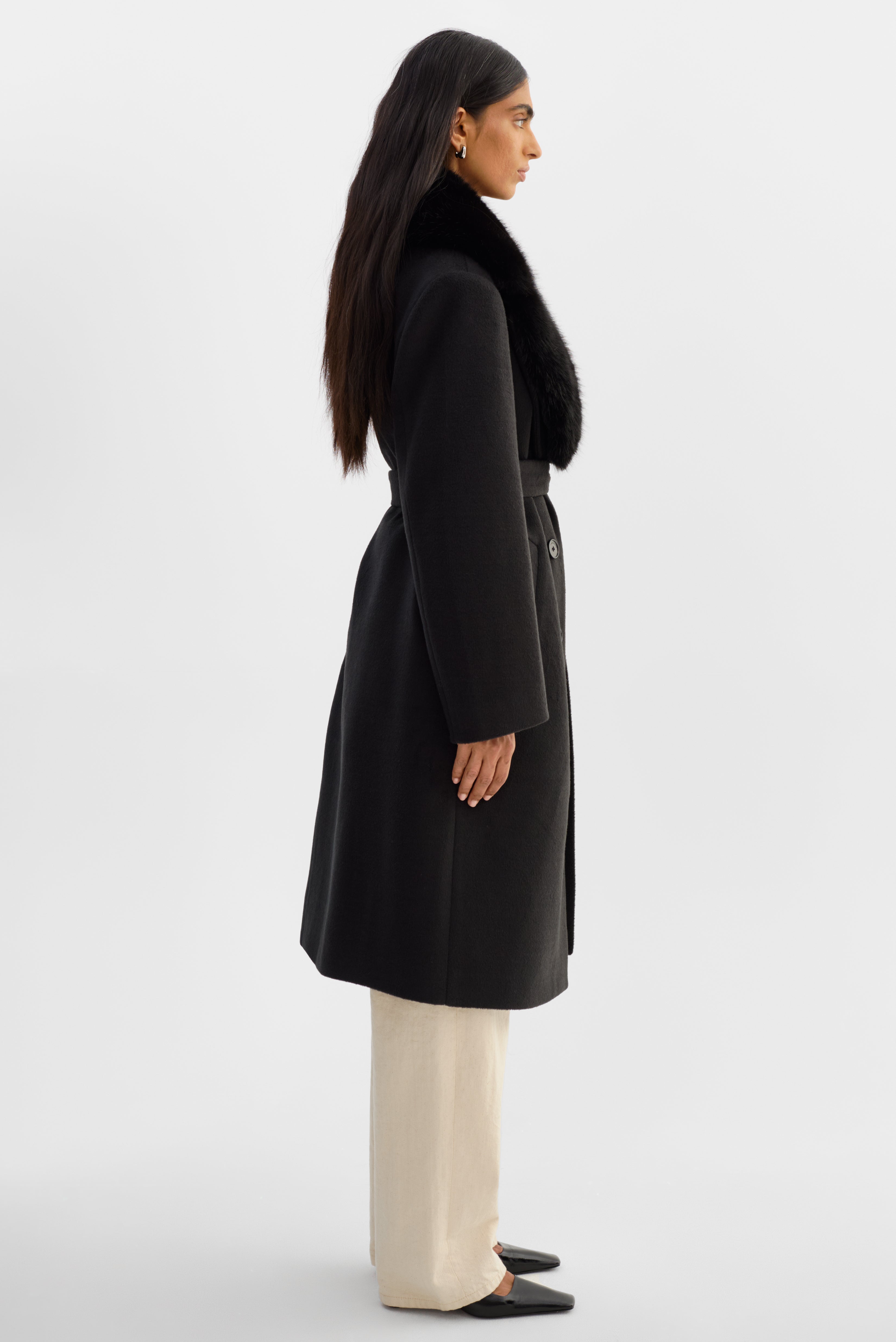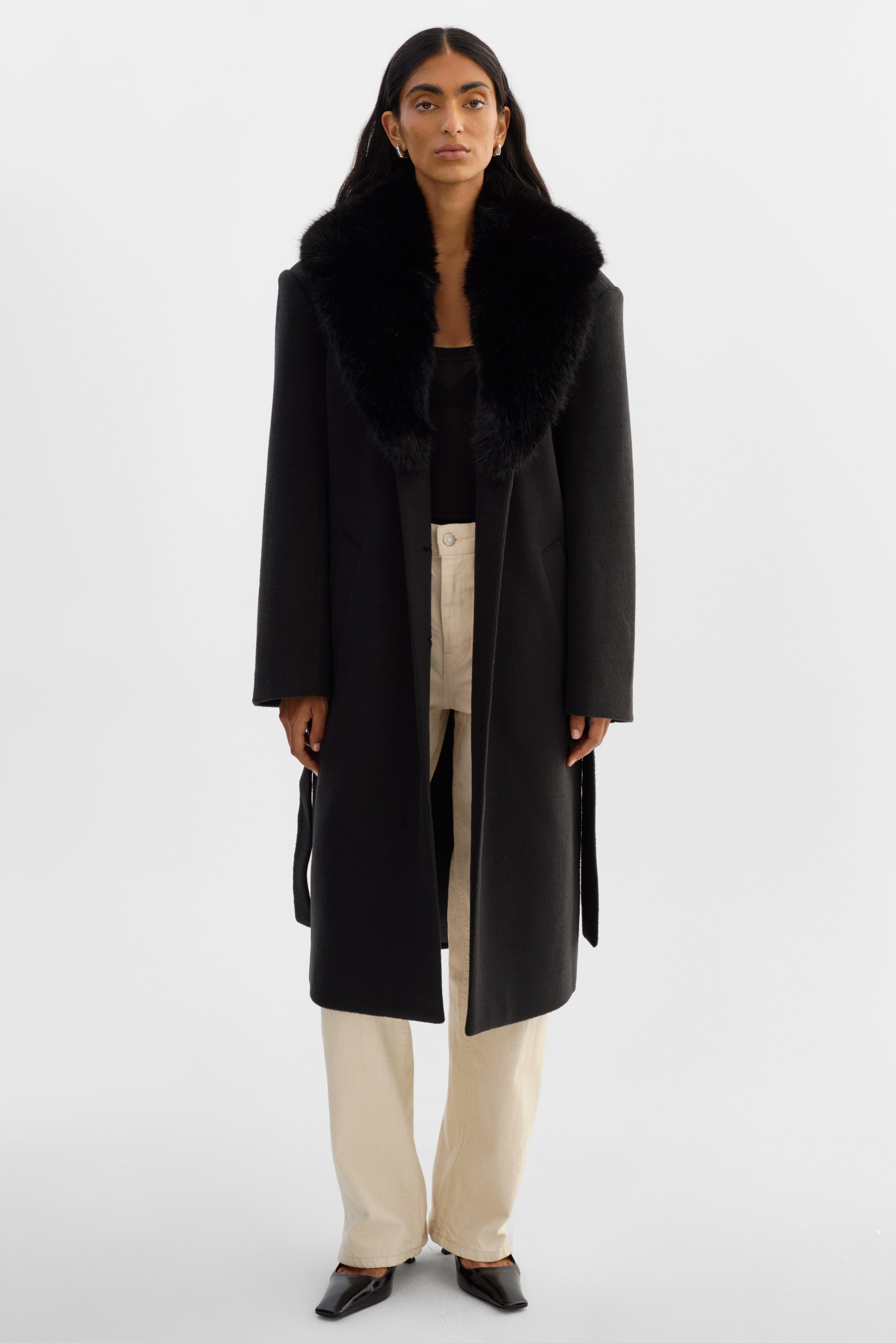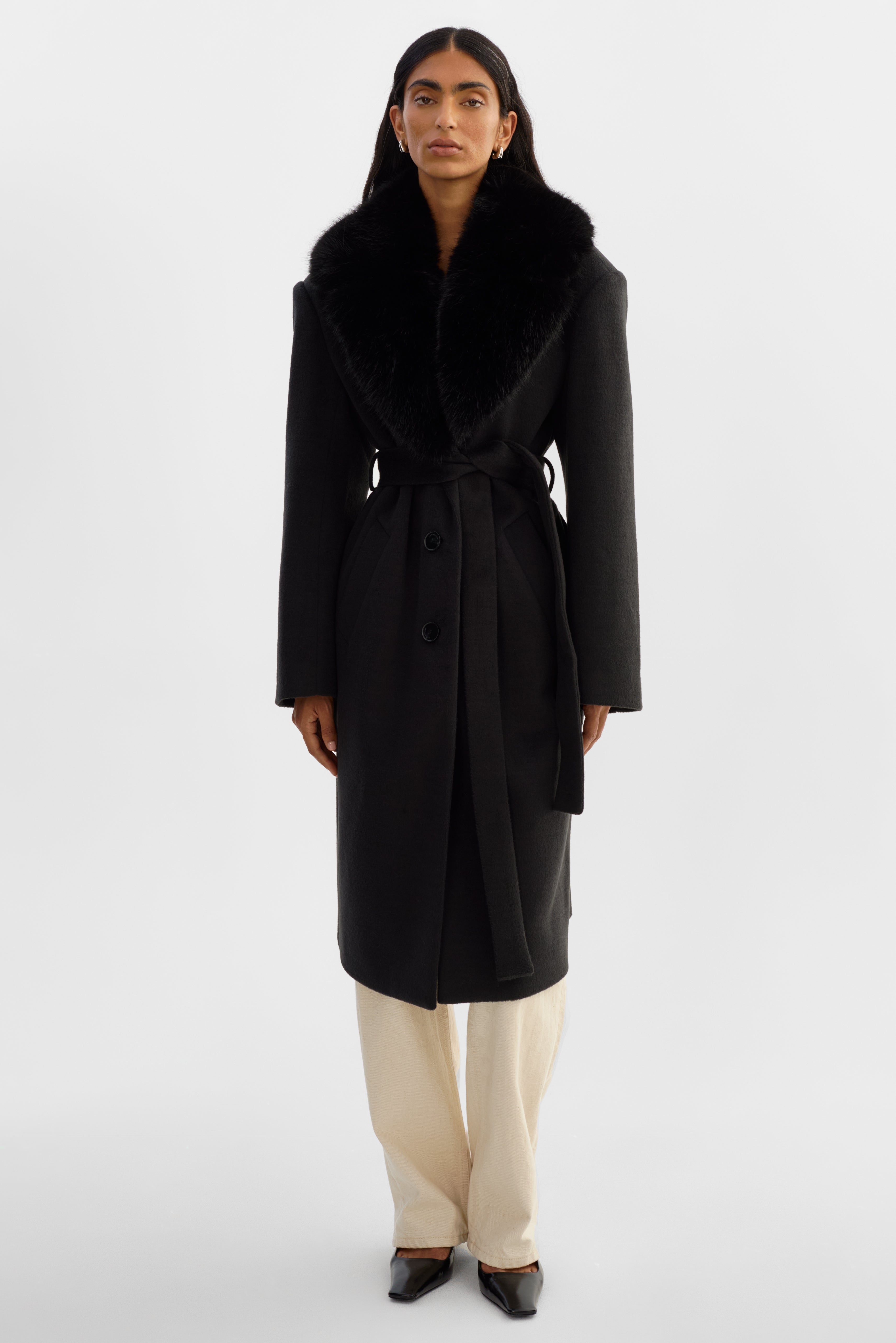Elevated glamour, timeless structure. The TILLIE Belted Wool Coatfeatures a refined brushed double knit wool blend body with a statement fur collar that adds instant softness and drama. A self-tie belt cinches the waist for a flattering fit, while the clean midi length and minimalist design keep the look effortlessly polished.