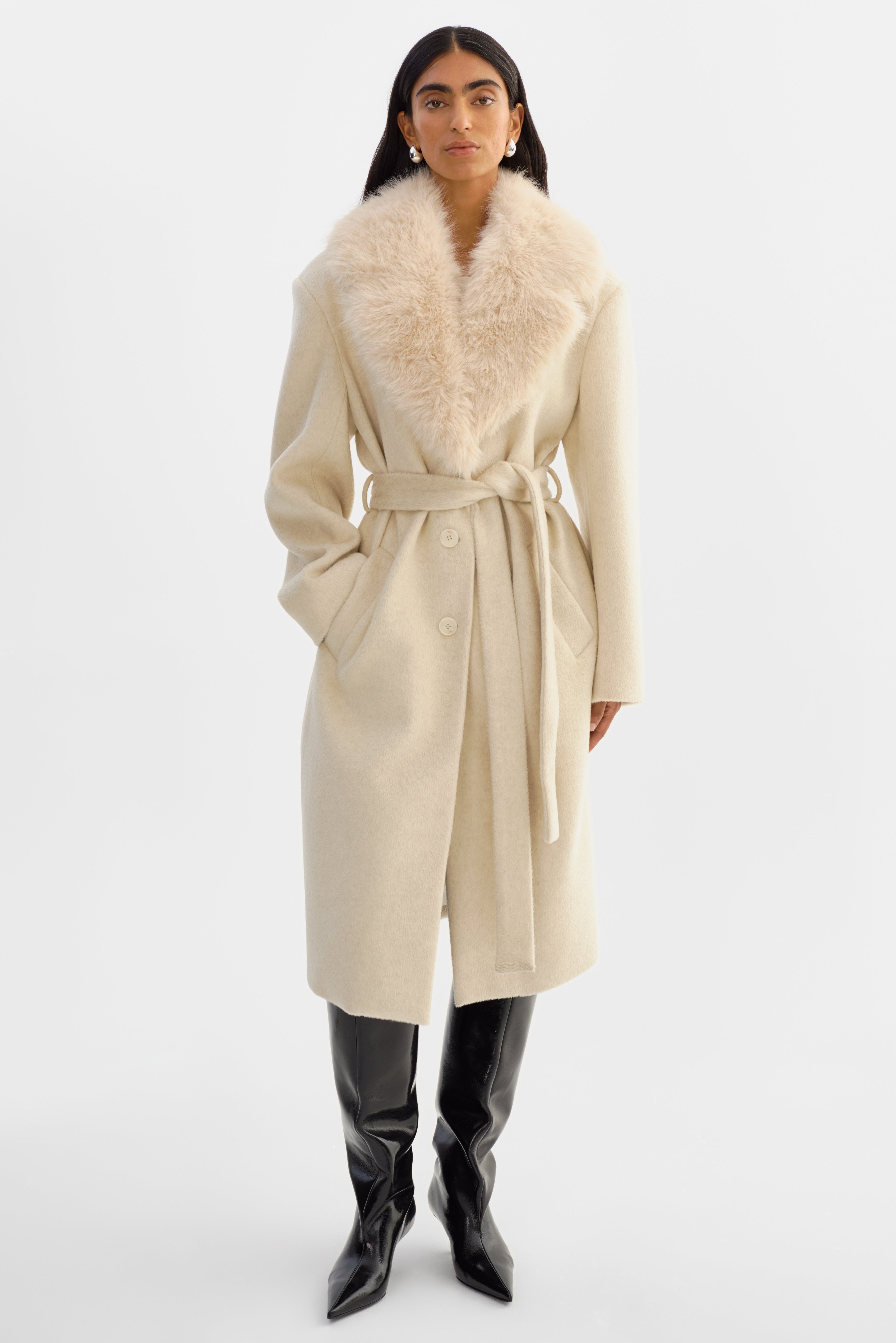 Elevated glamour, timeless structure. The TILLIE Belted Wool Coatfeatures a refined brushed double knit wool blend body with a statement fur collar that adds instant softness and drama. A self-tie belt cinches the waist for a flattering fit, while the clean midi length and minimalist design keep the look effortlessly polished.
