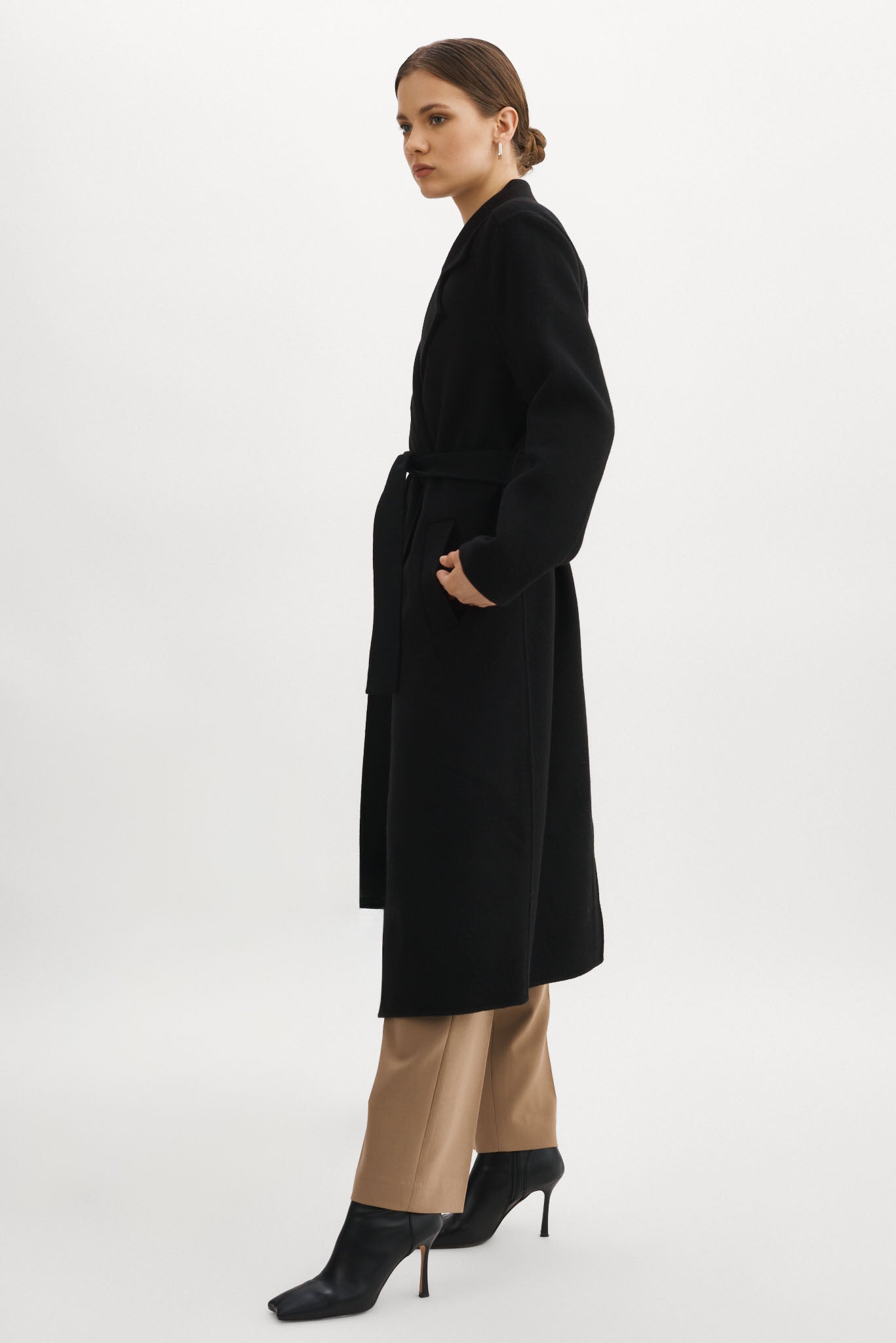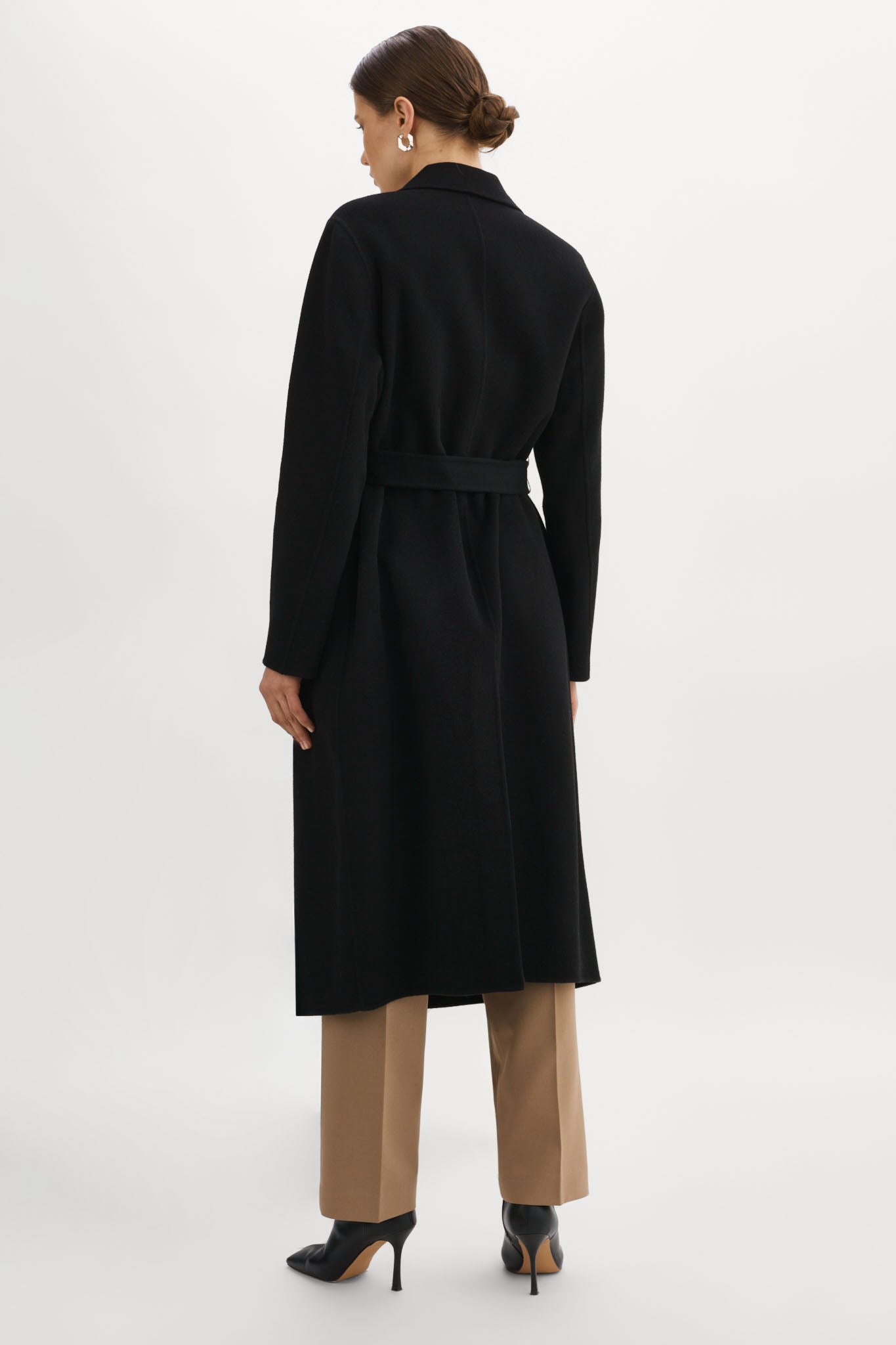 Every closet needs a classic tailored wool coat to effortlessly layer as you transition into colder seasons. Ours is cut from double faced wool for added warmth to block out the cold. It features an asymmetric single button closure and self tie at waist allowing you to change up the look.