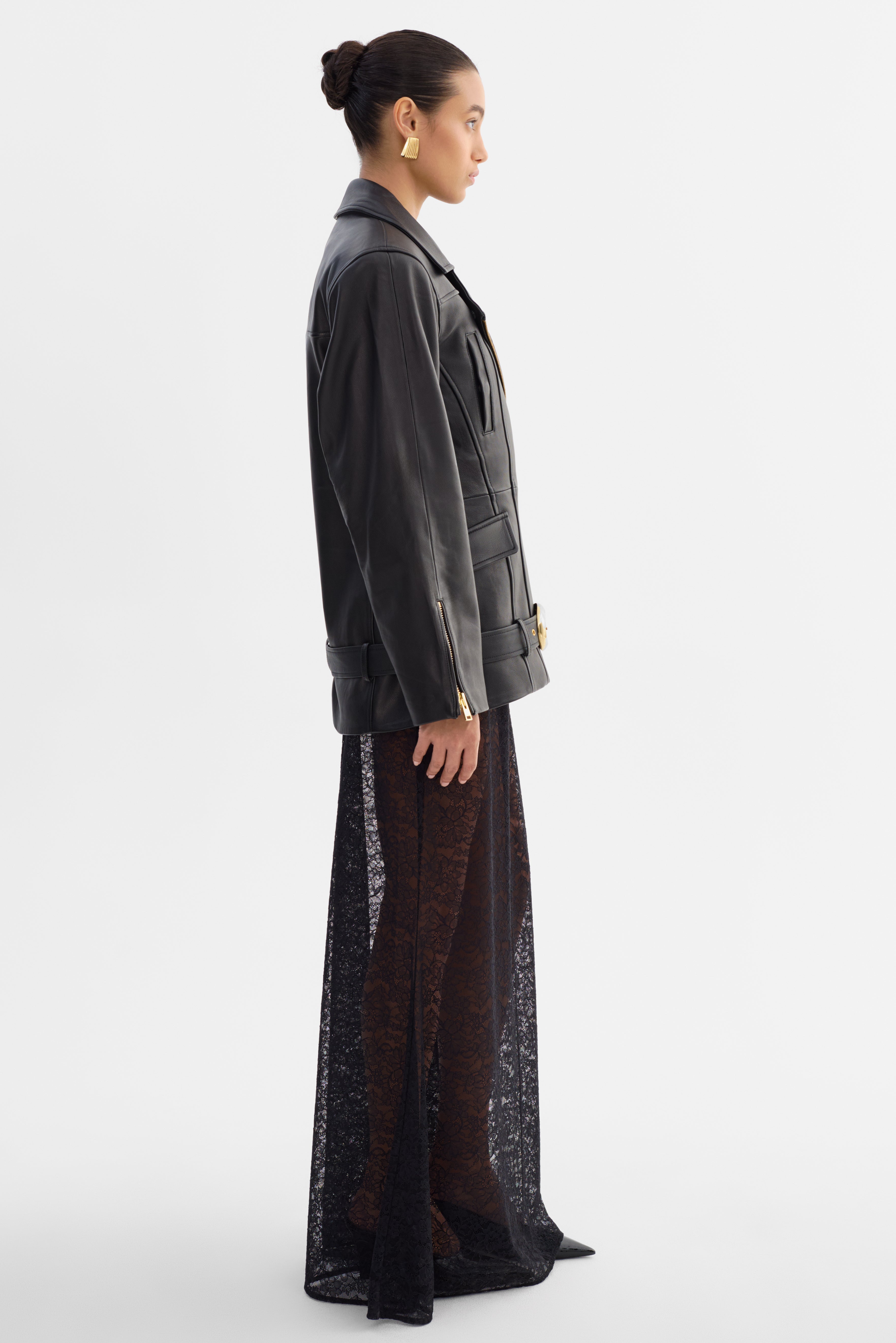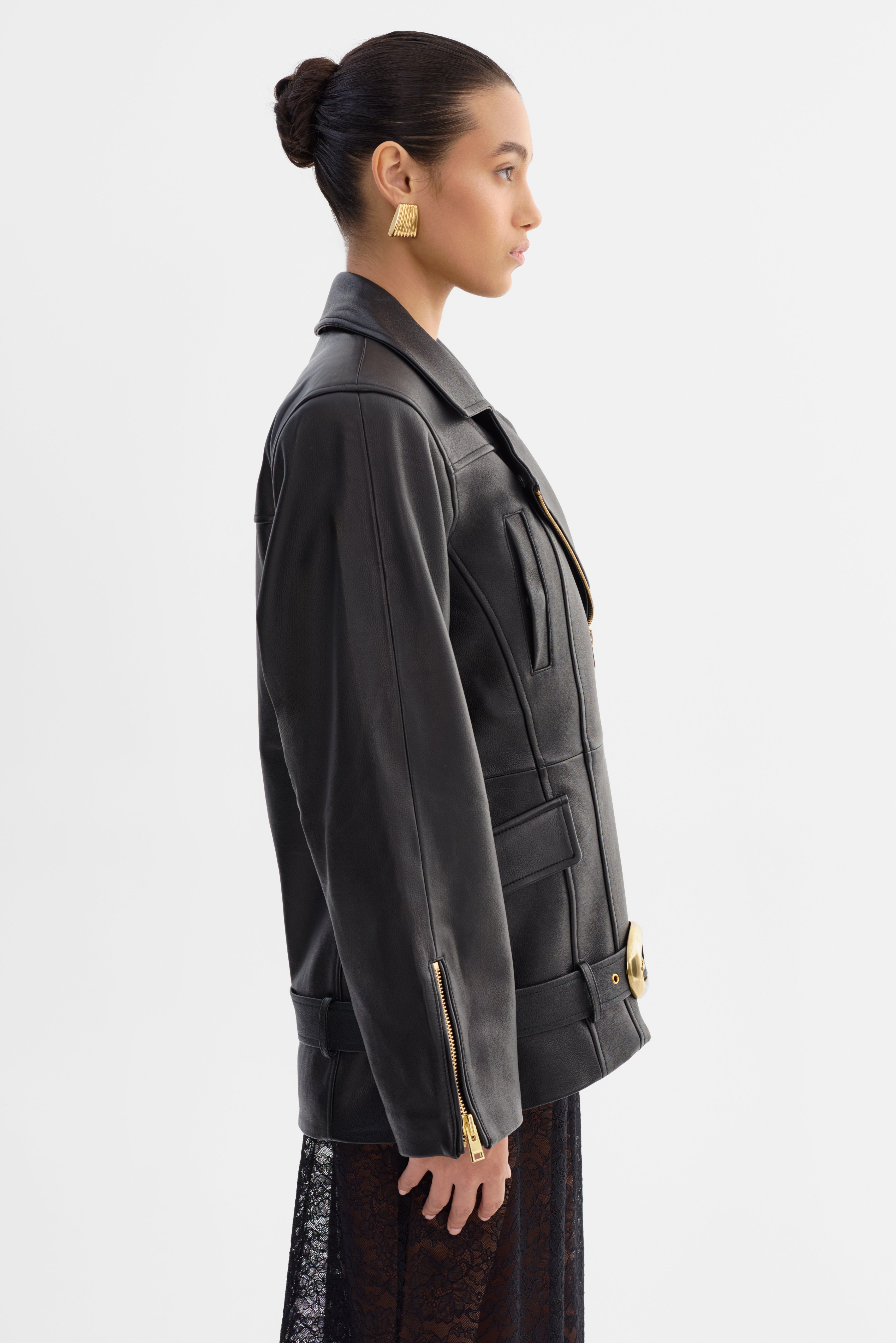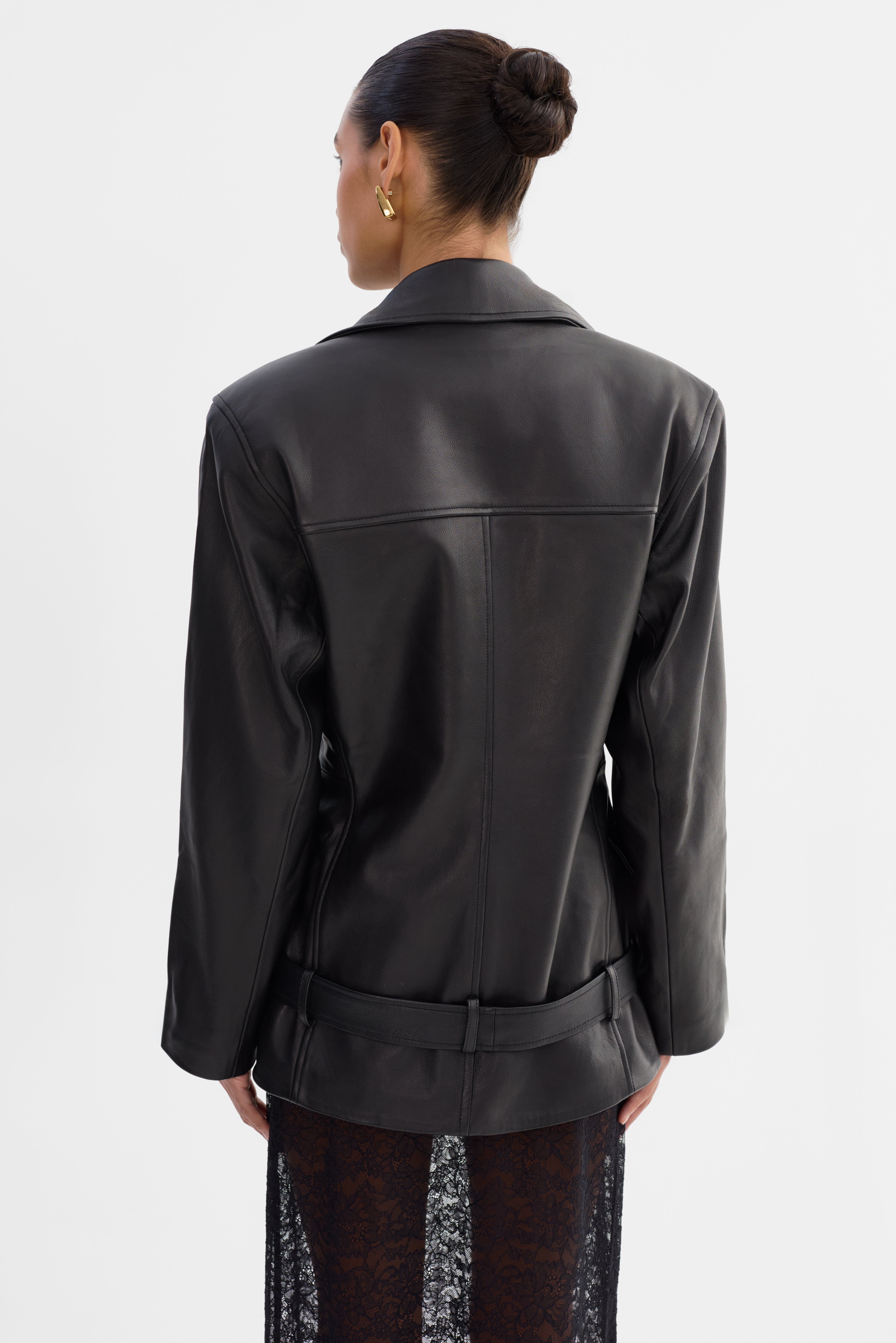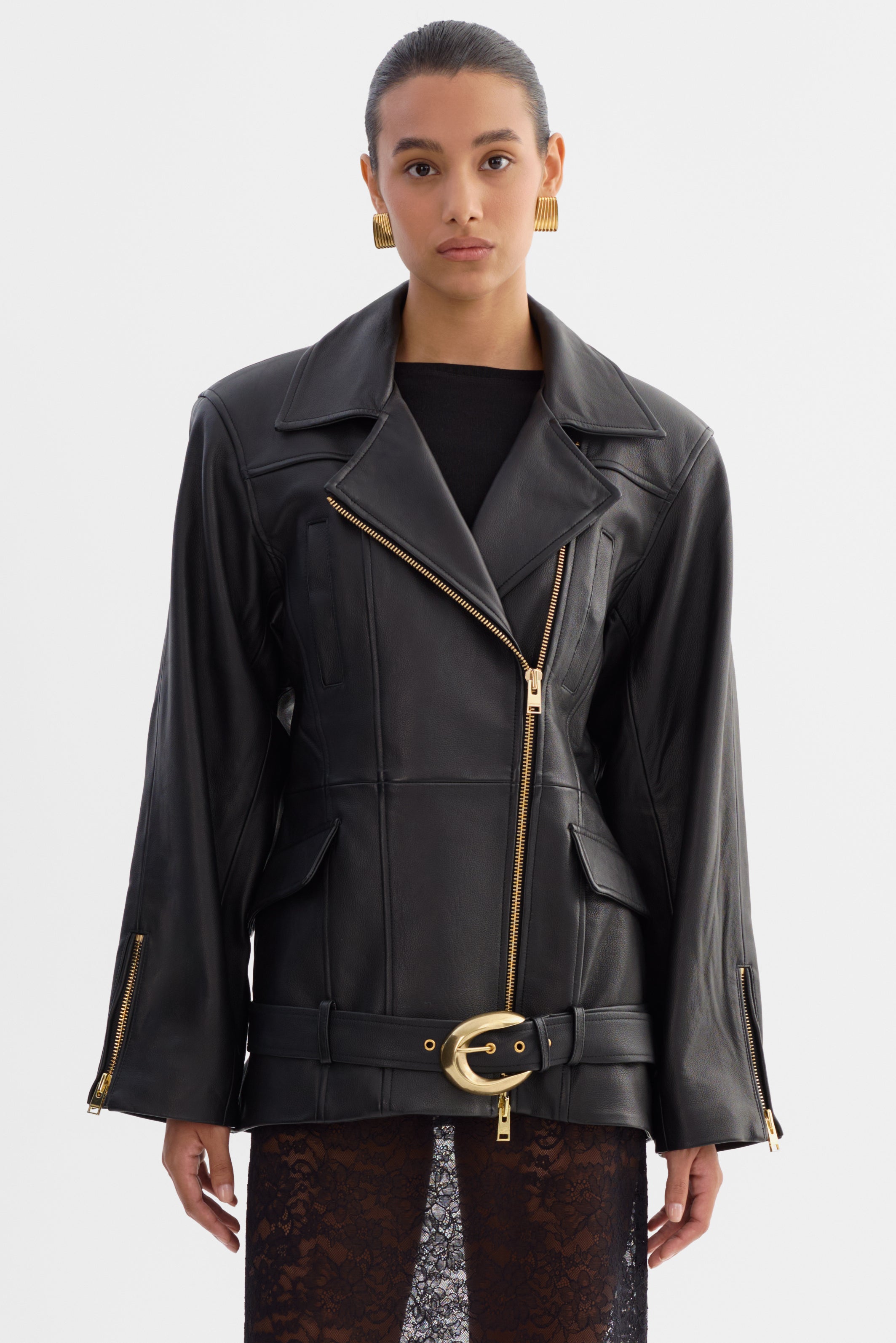 The VENETIA Belted Leather Jacket blends timeless outerwear with bold detailing. Defined by its oversized silhouette and structured shoulders, this piece is elevated with an asymmetric zipper closure, angled flap pockets, and a wide buckled belt that cinches the look with attitude. Designed for both edge and elegance, it is a statement layer that carries through seasons of chic styling.