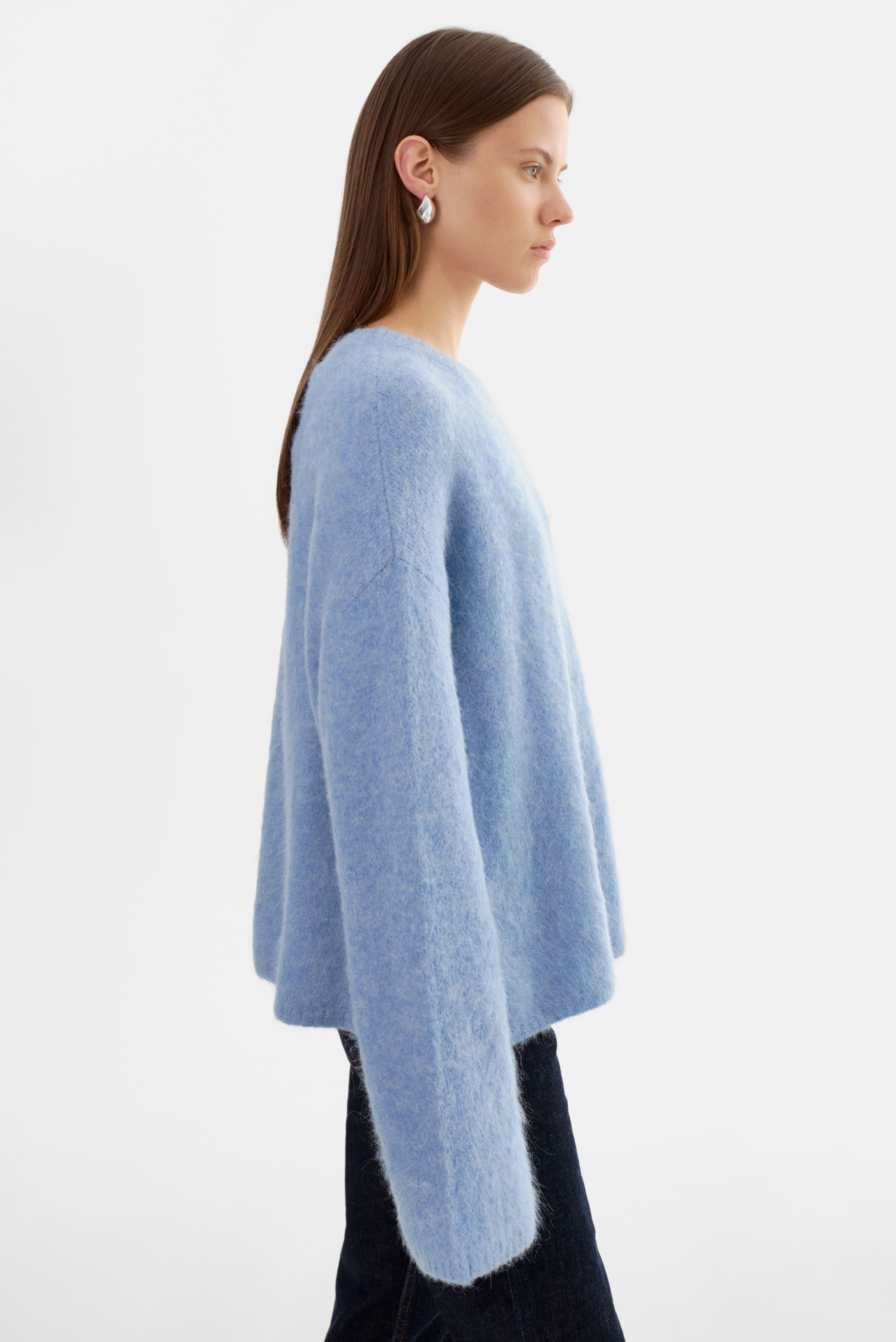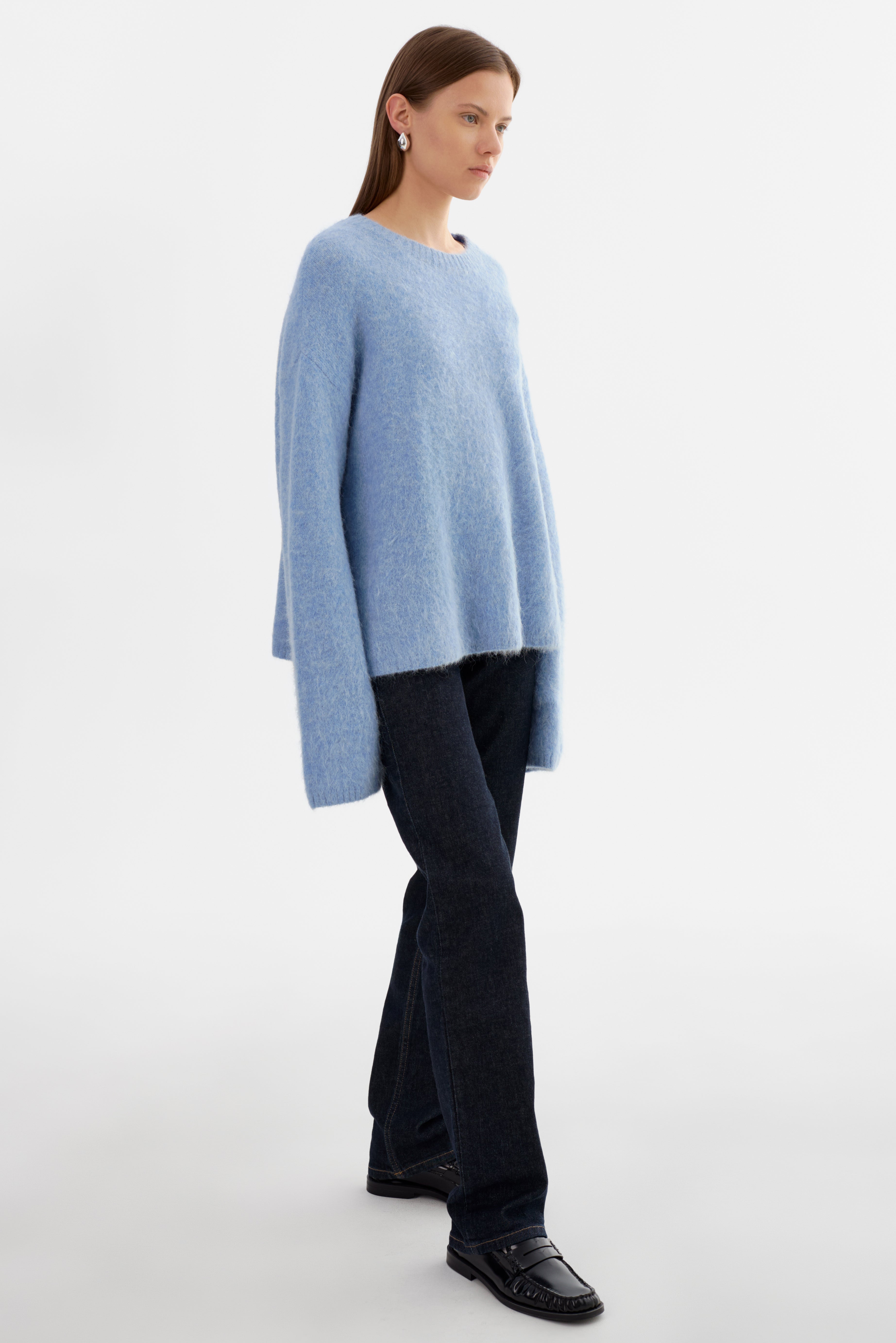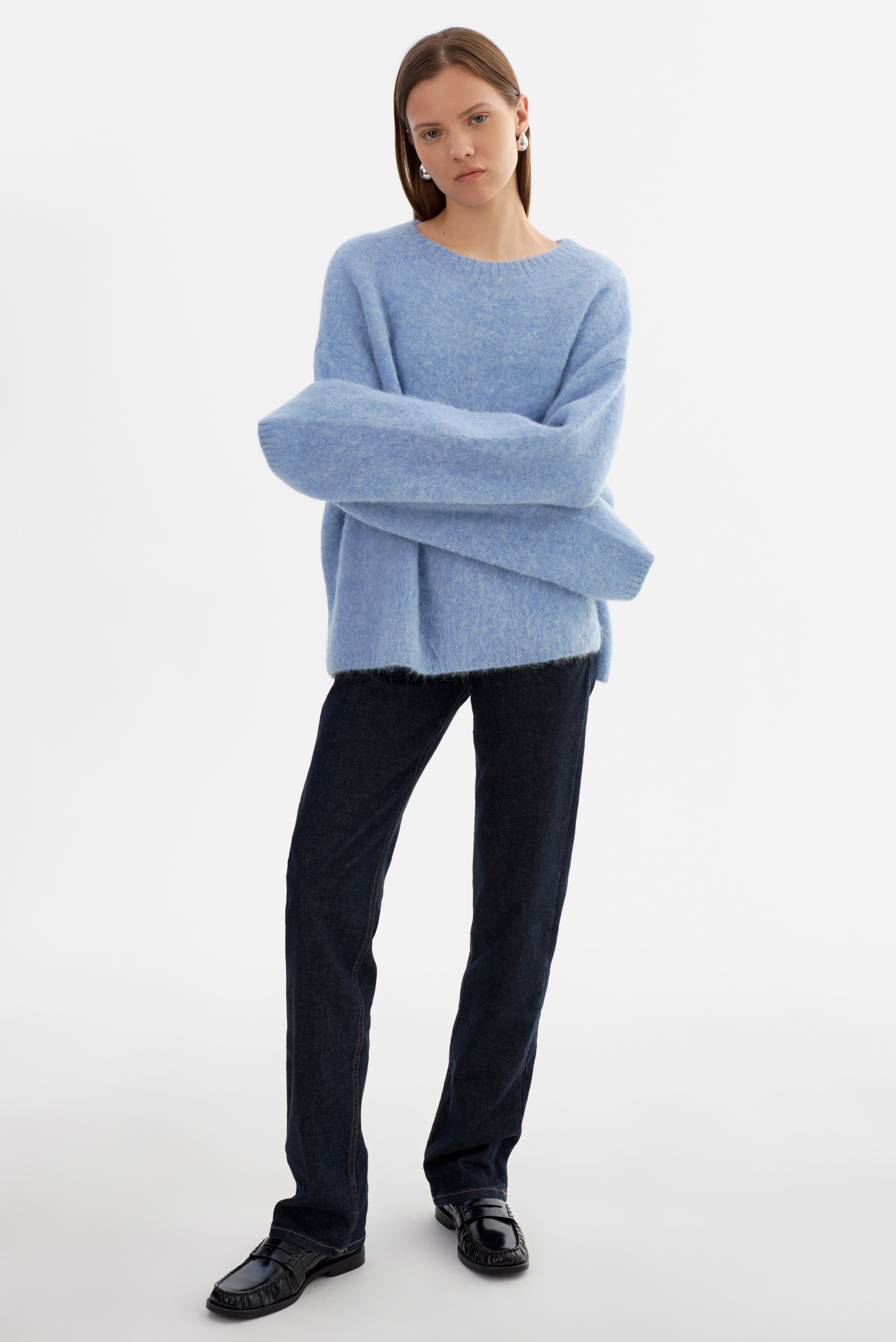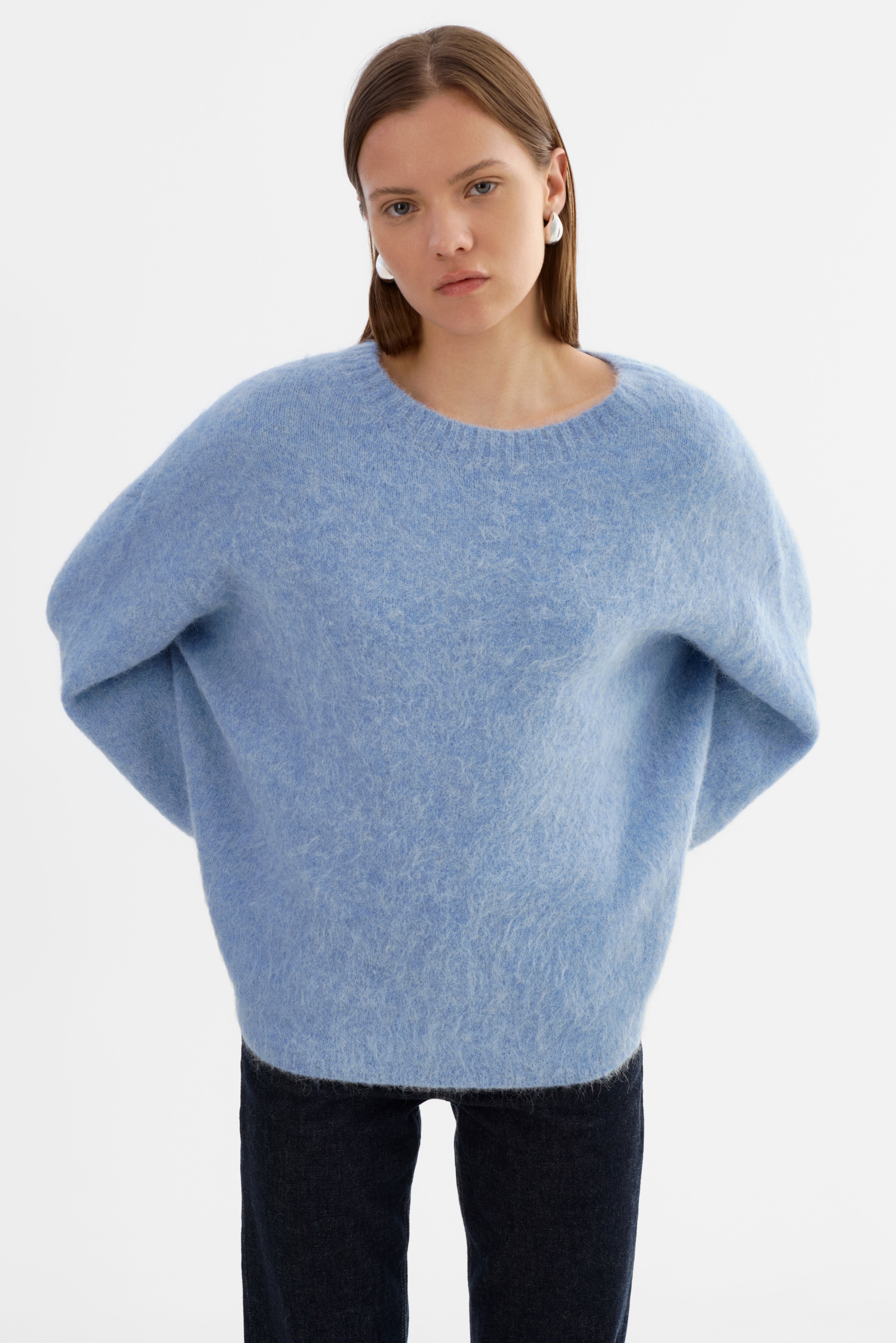 Softness you can feel. The VERA Oversized Knit Sweater is crafted from a brushed alpaca knit that offers a luxe, airy texture with a naturally relaxed drape. Featuring a classic crew neckline, elongated sleeves, and an easy fit, it's an elevated essential that pairs effortlessly with denim, leather, or tailored bottoms.