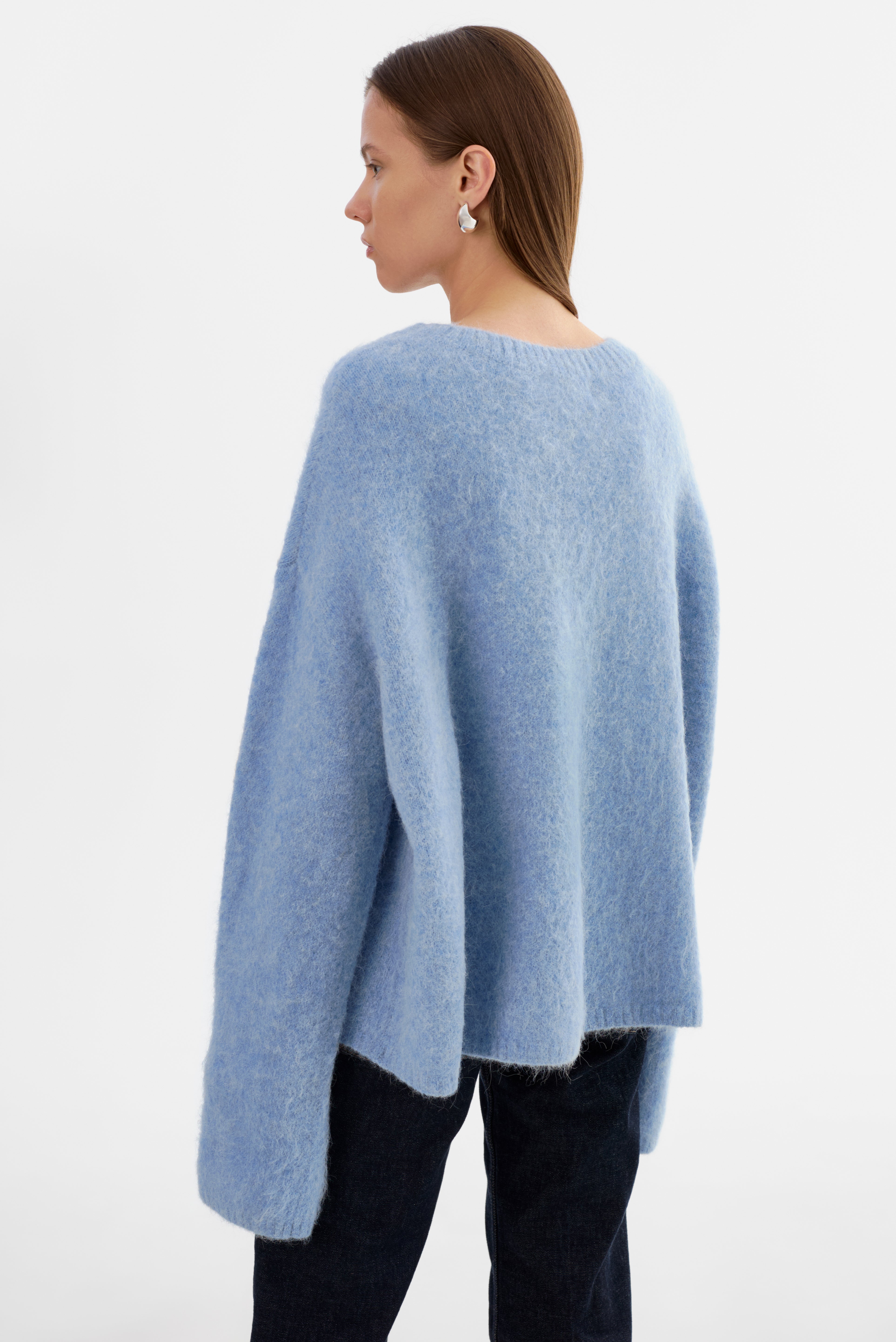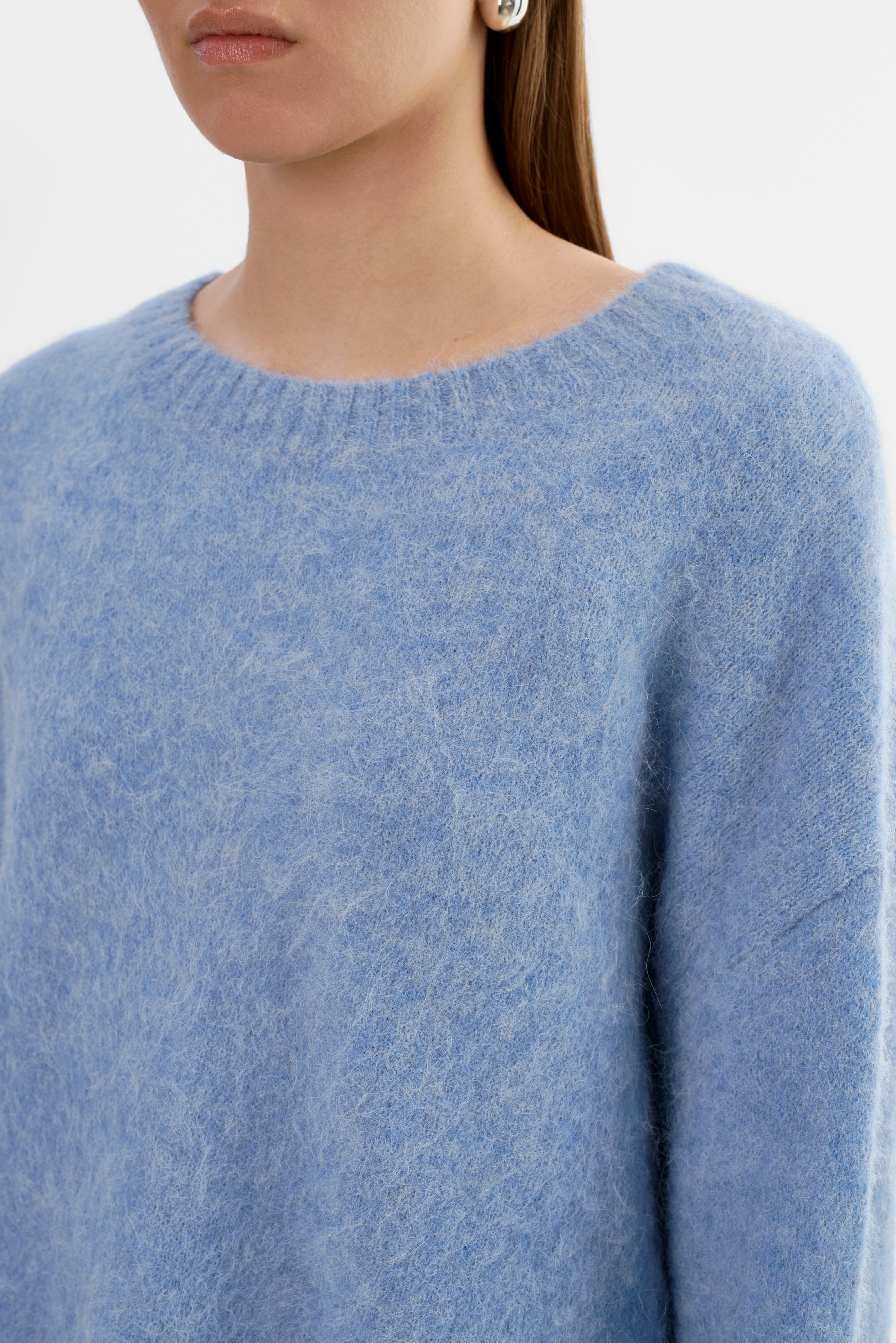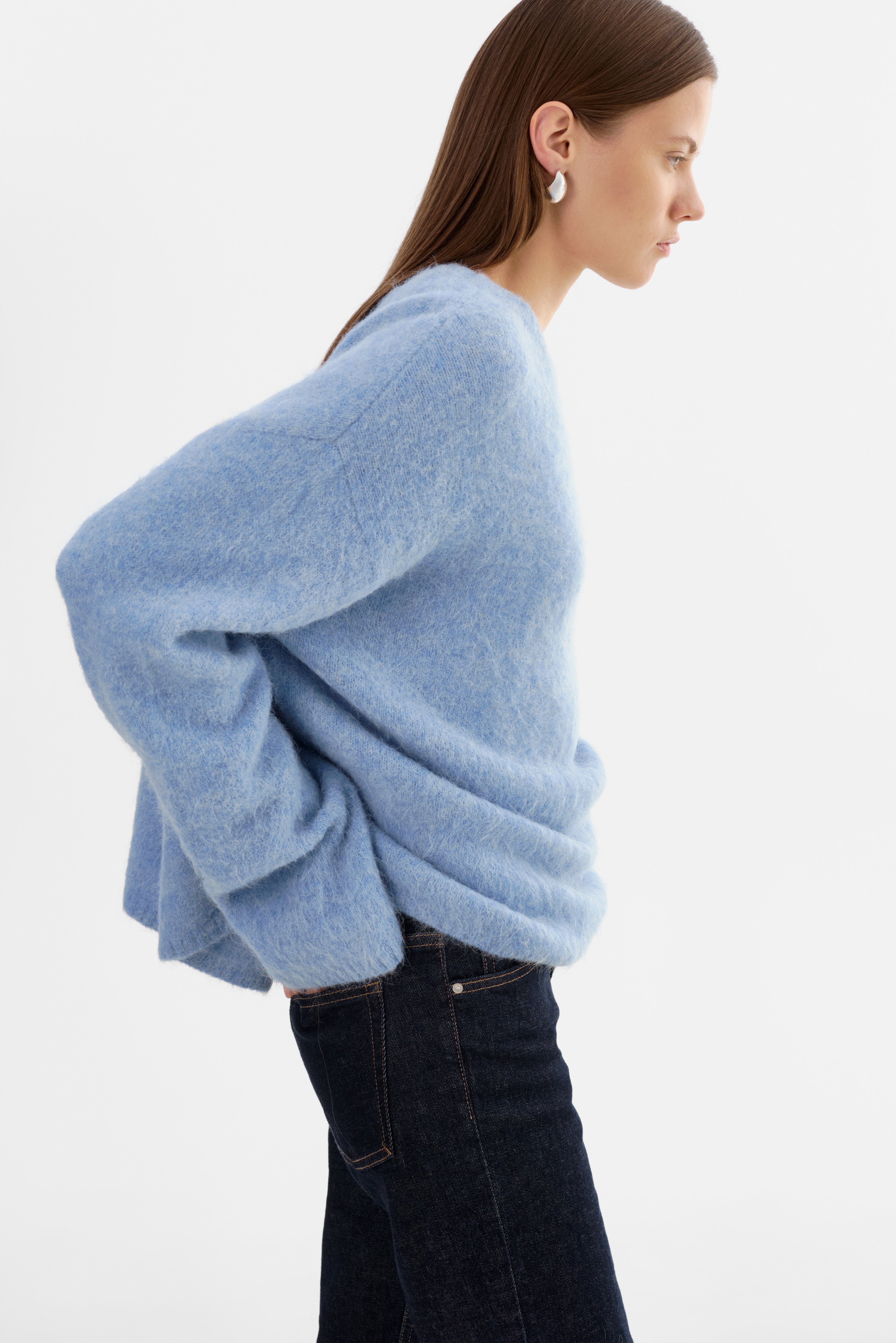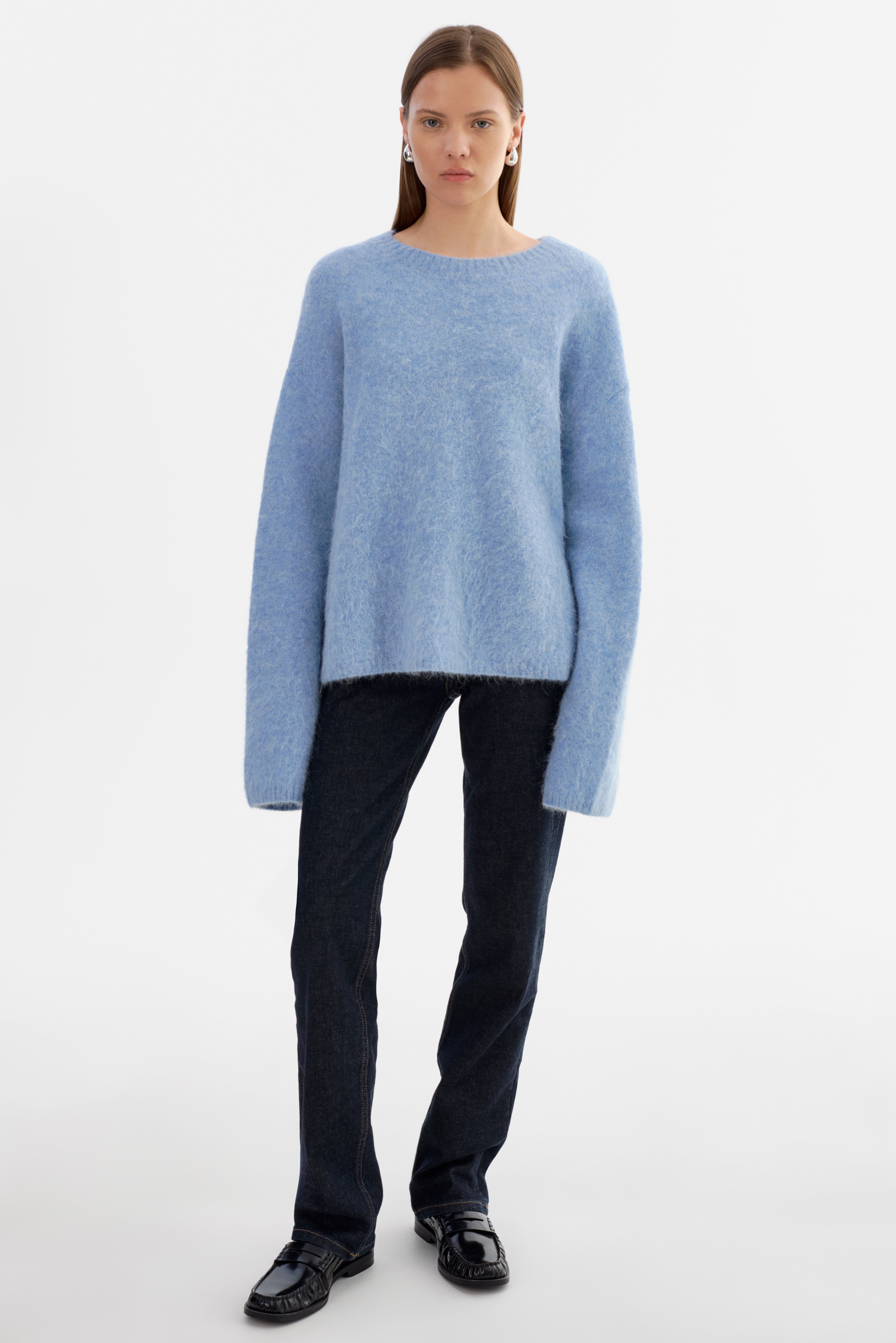 Softness you can feel. The VERA Oversized Knit Sweater is crafted from a brushed alpaca knit that offers a luxe, airy texture with a naturally relaxed drape. Featuring a classic crew neckline, elongated sleeves, and an easy fit, it's an elevated essential that pairs effortlessly with denim, leather, or tailored bottoms.
