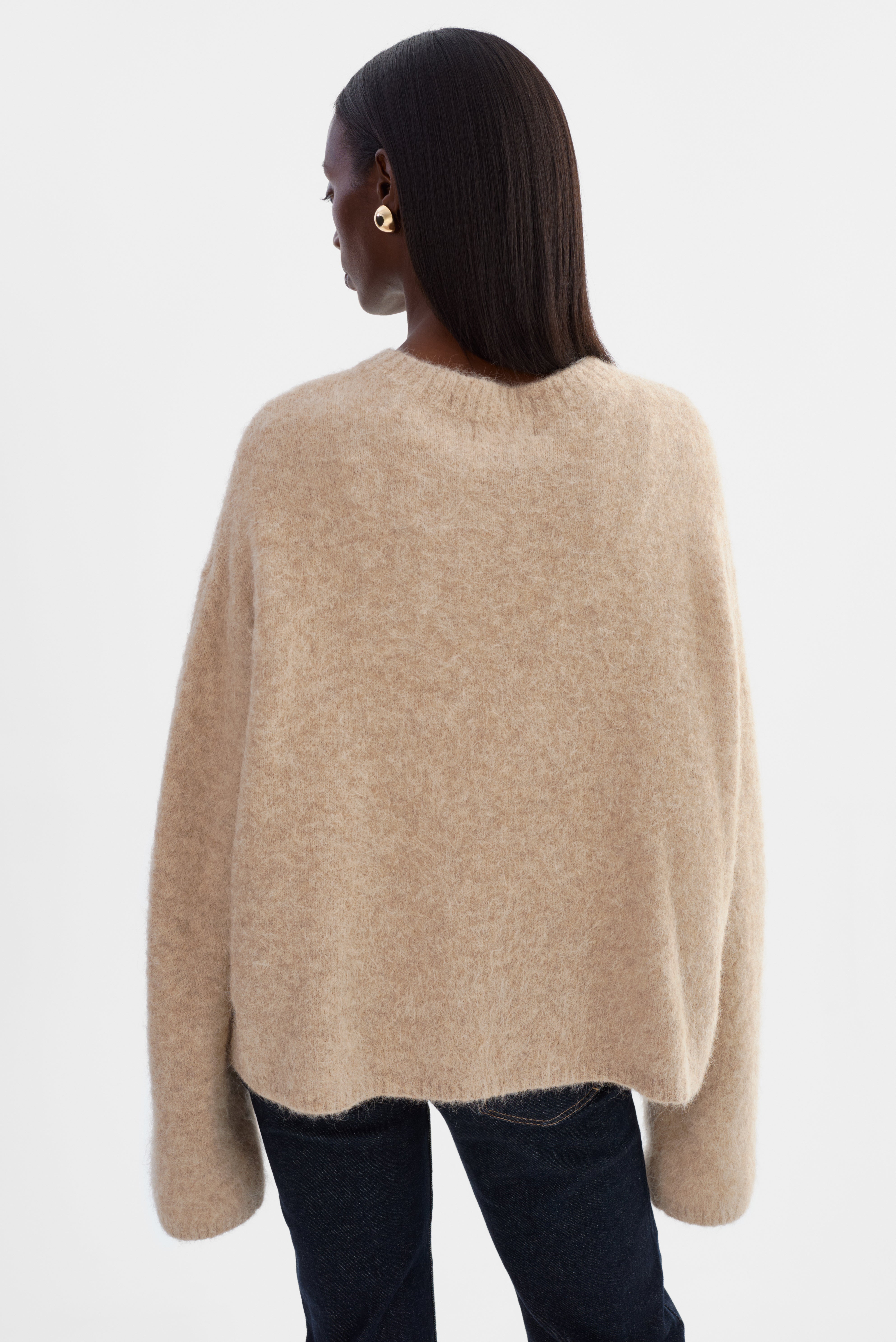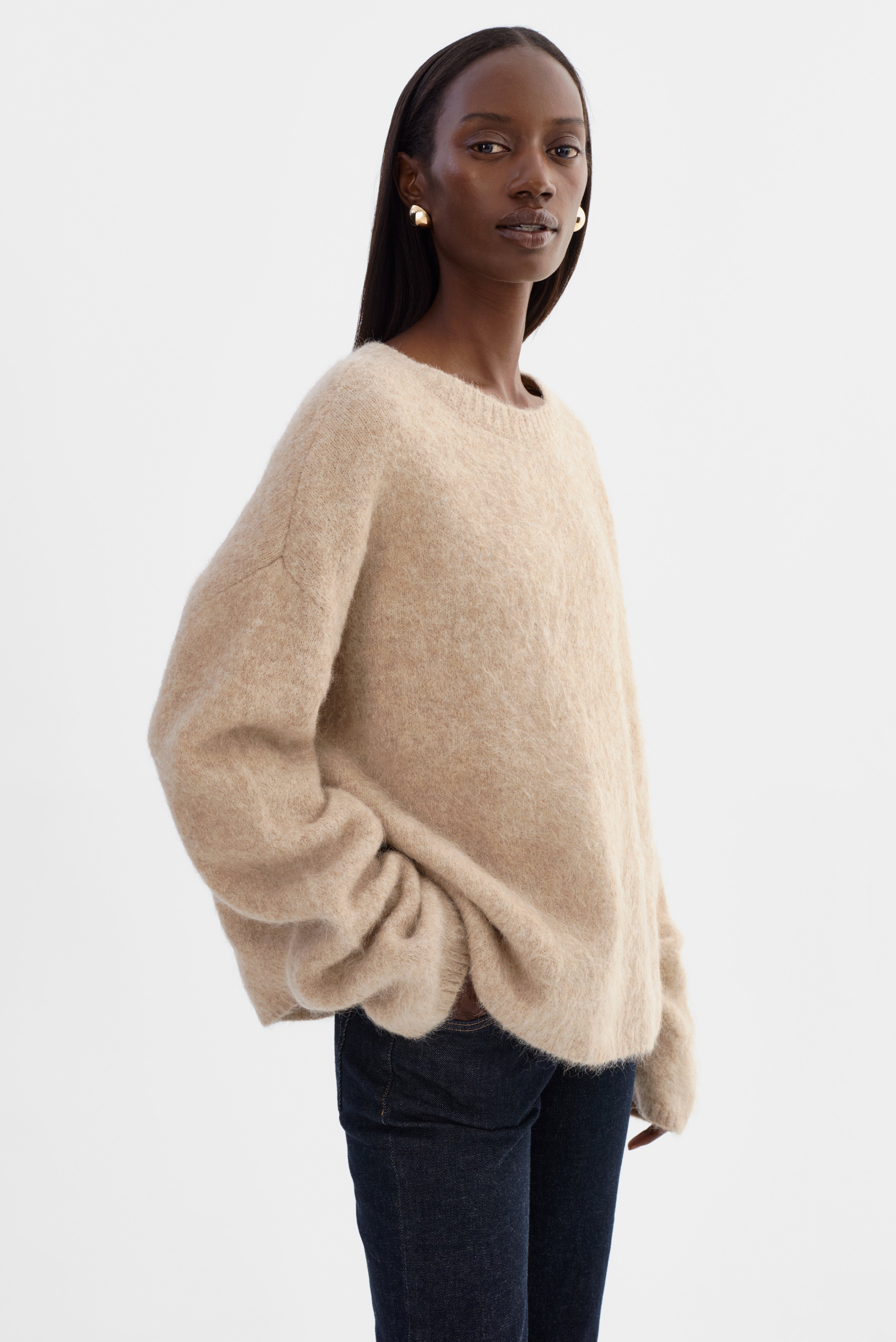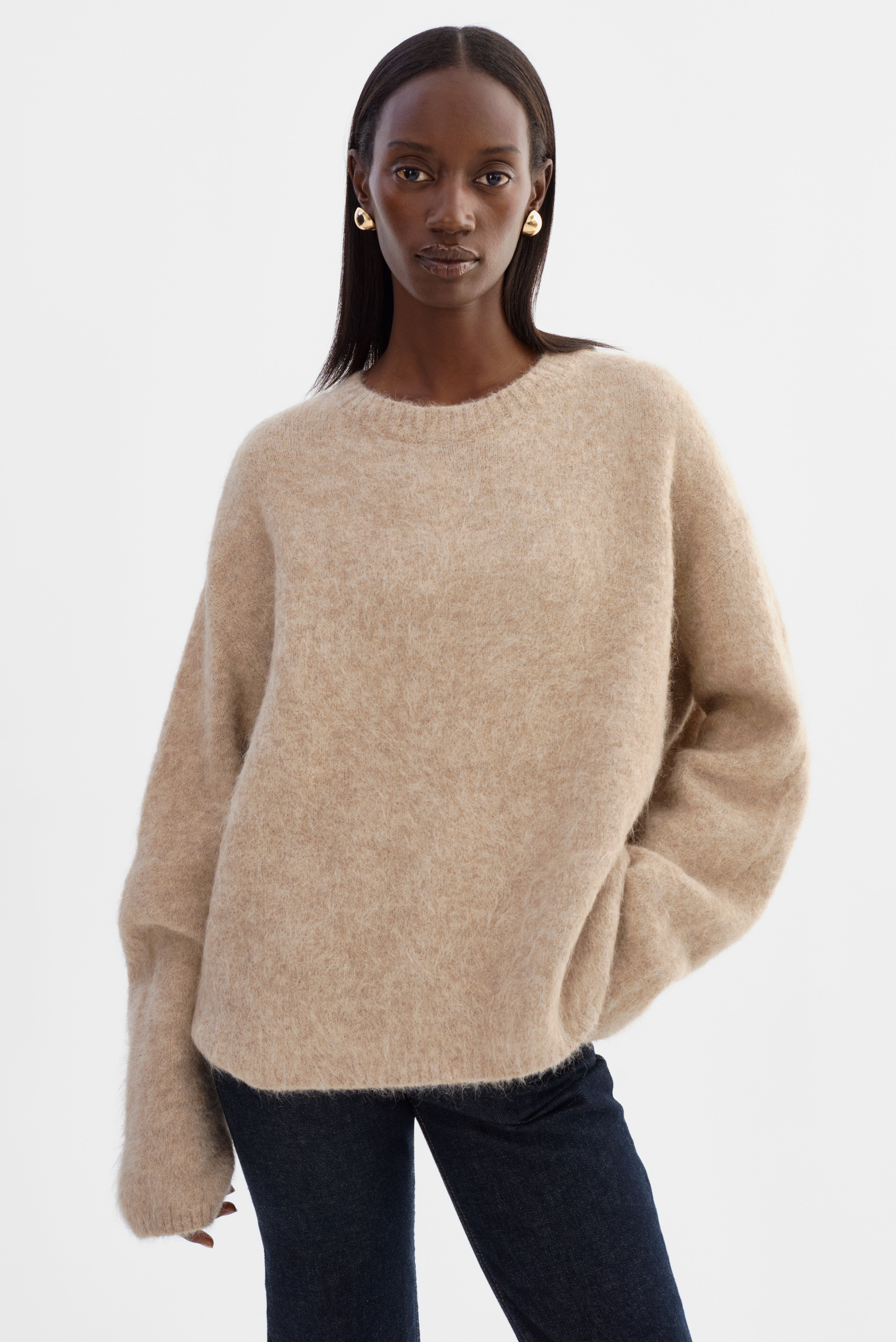 Softness you can feel. The VERA Oversized Knit Sweater is crafted from a brushed alpaca knit that offers a luxe, airy texture with a naturally relaxed drape. Featuring a classic crew neckline, elongated sleeves, and an easy fit, it's an elevated essential that pairs effortlessly with denim, leather, or tailored bottoms.