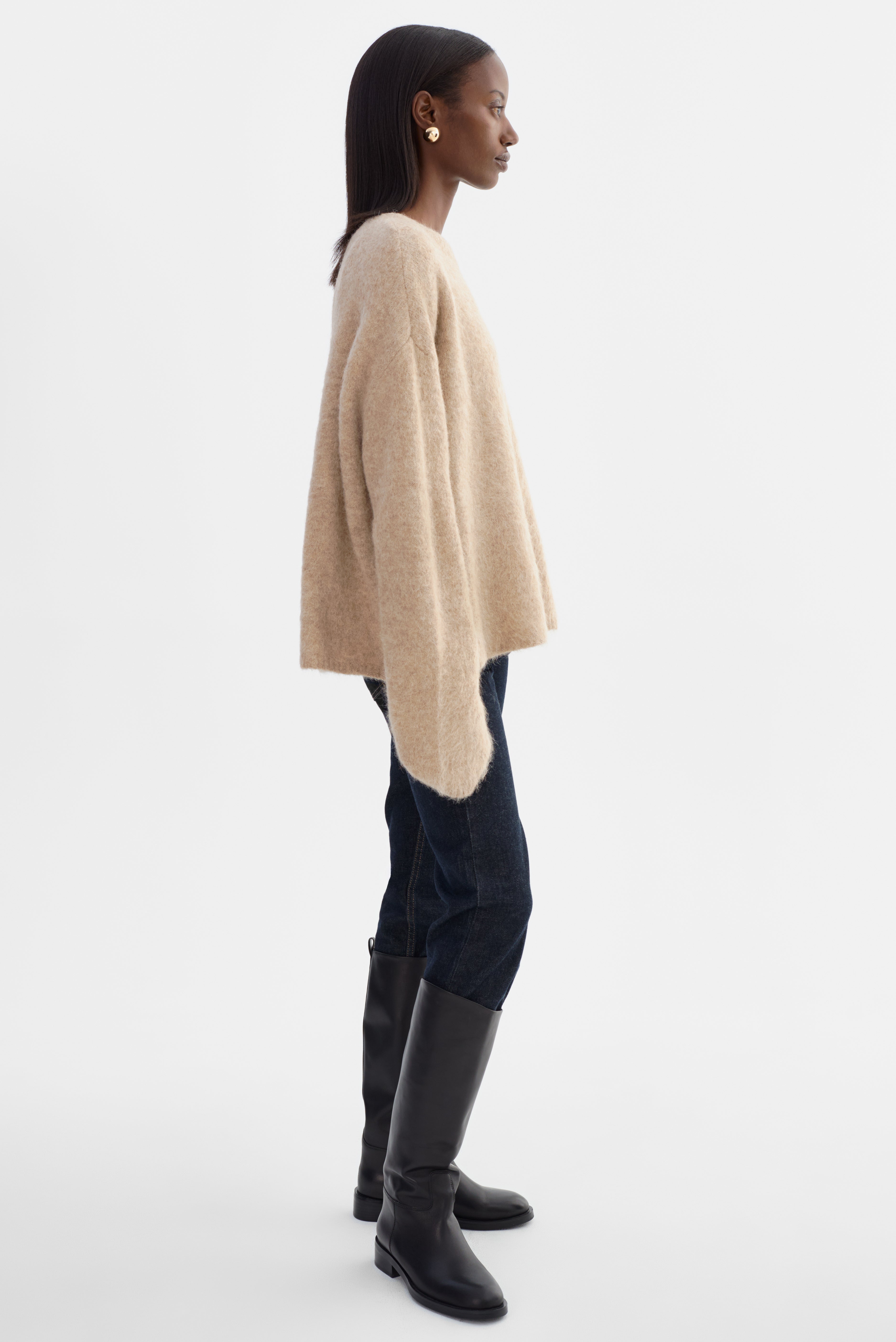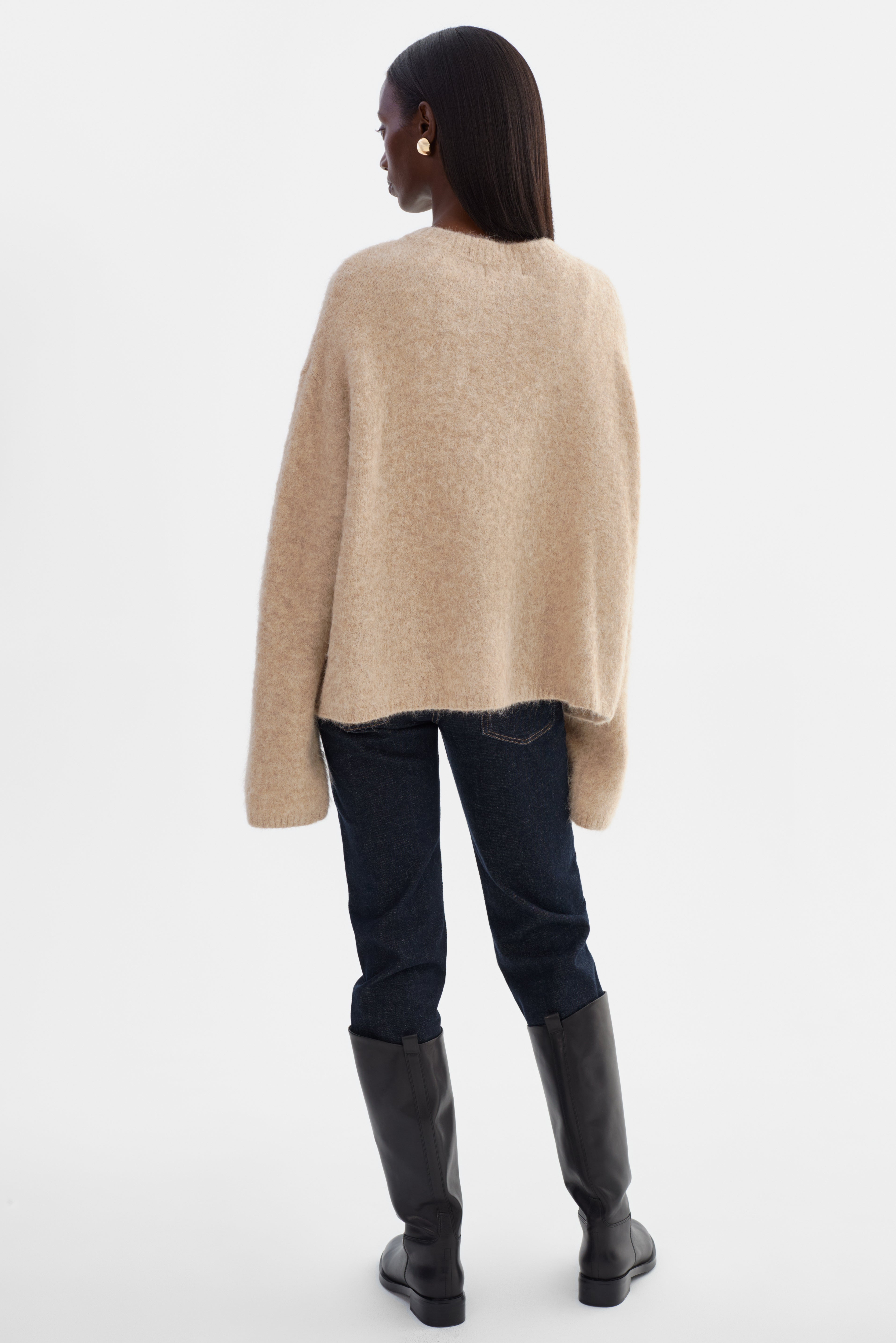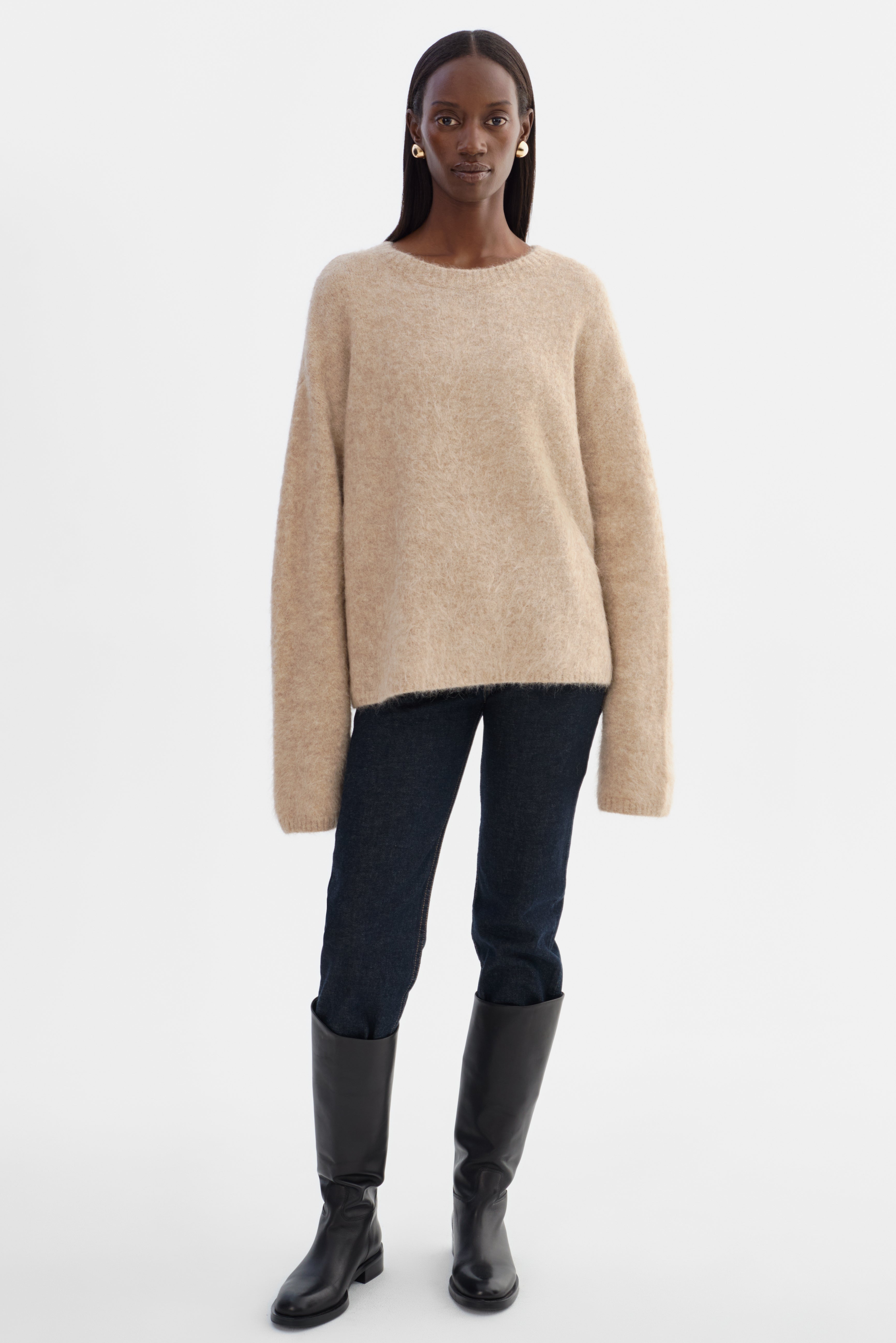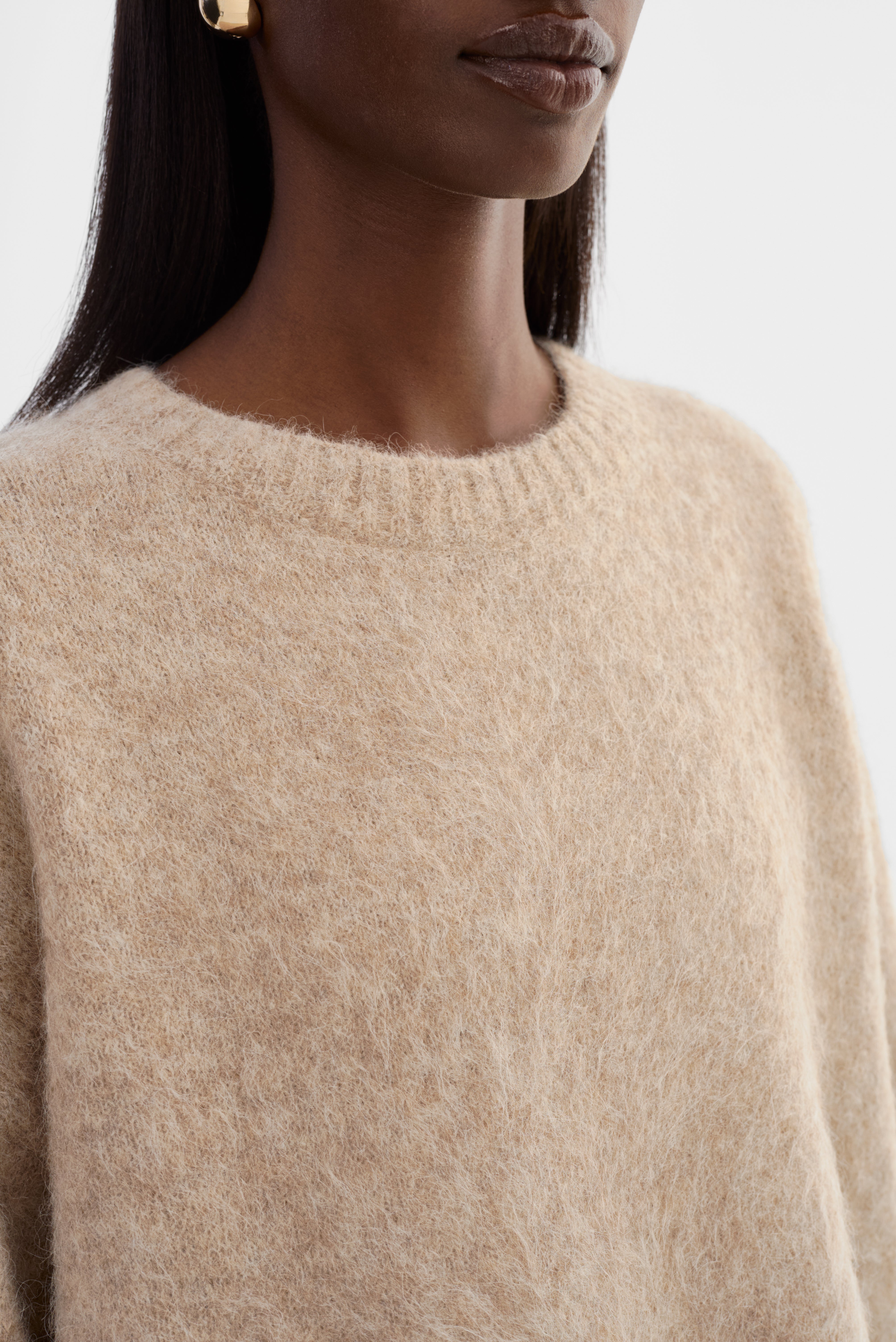 Softness you can feel. The VERA Oversized Knit Sweater is crafted from a brushed alpaca knit that offers a luxe, airy texture with a naturally relaxed drape. Featuring a classic crew neckline, elongated sleeves, and an easy fit, it's an elevated essential that pairs effortlessly with denim, leather, or tailored bottoms.
