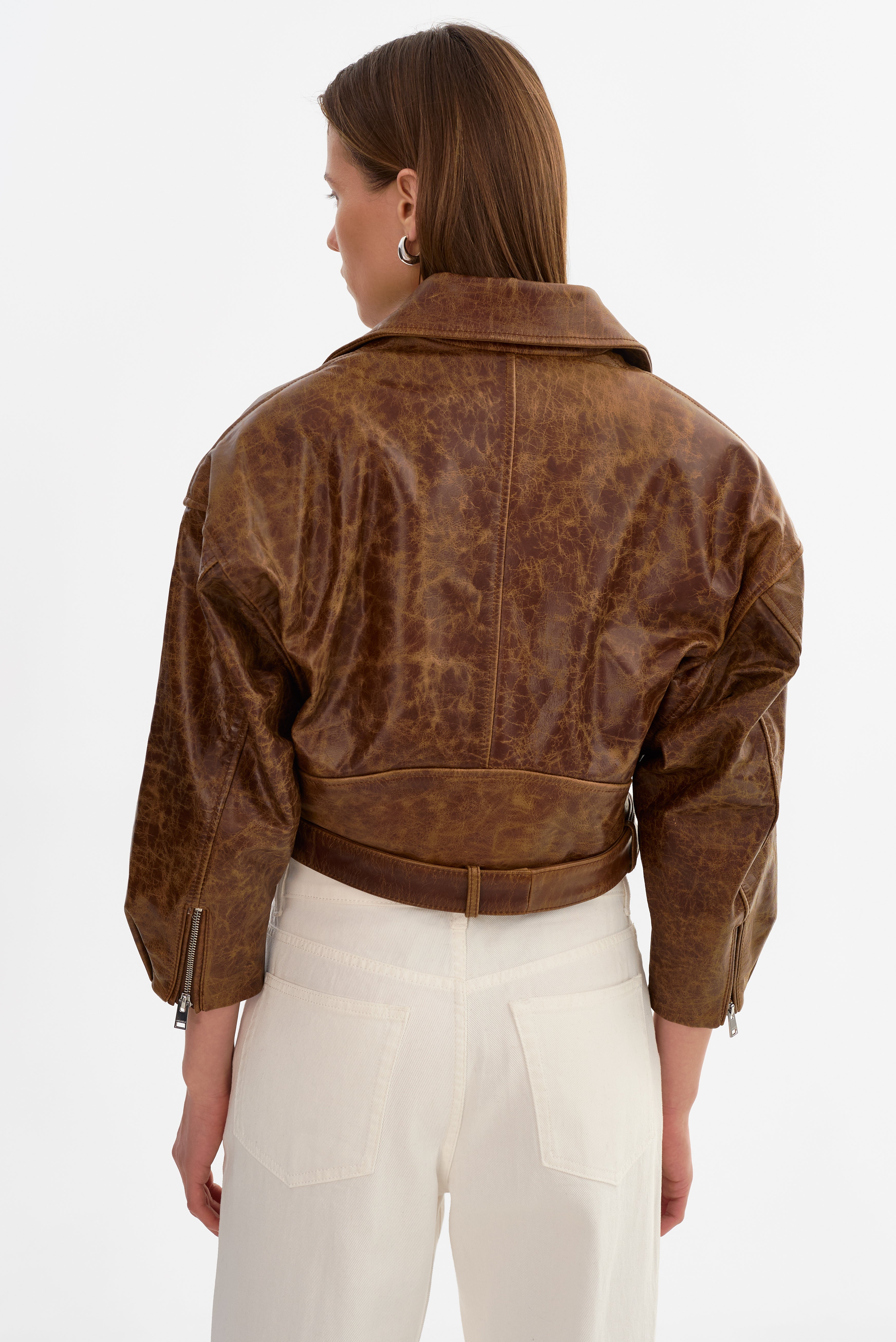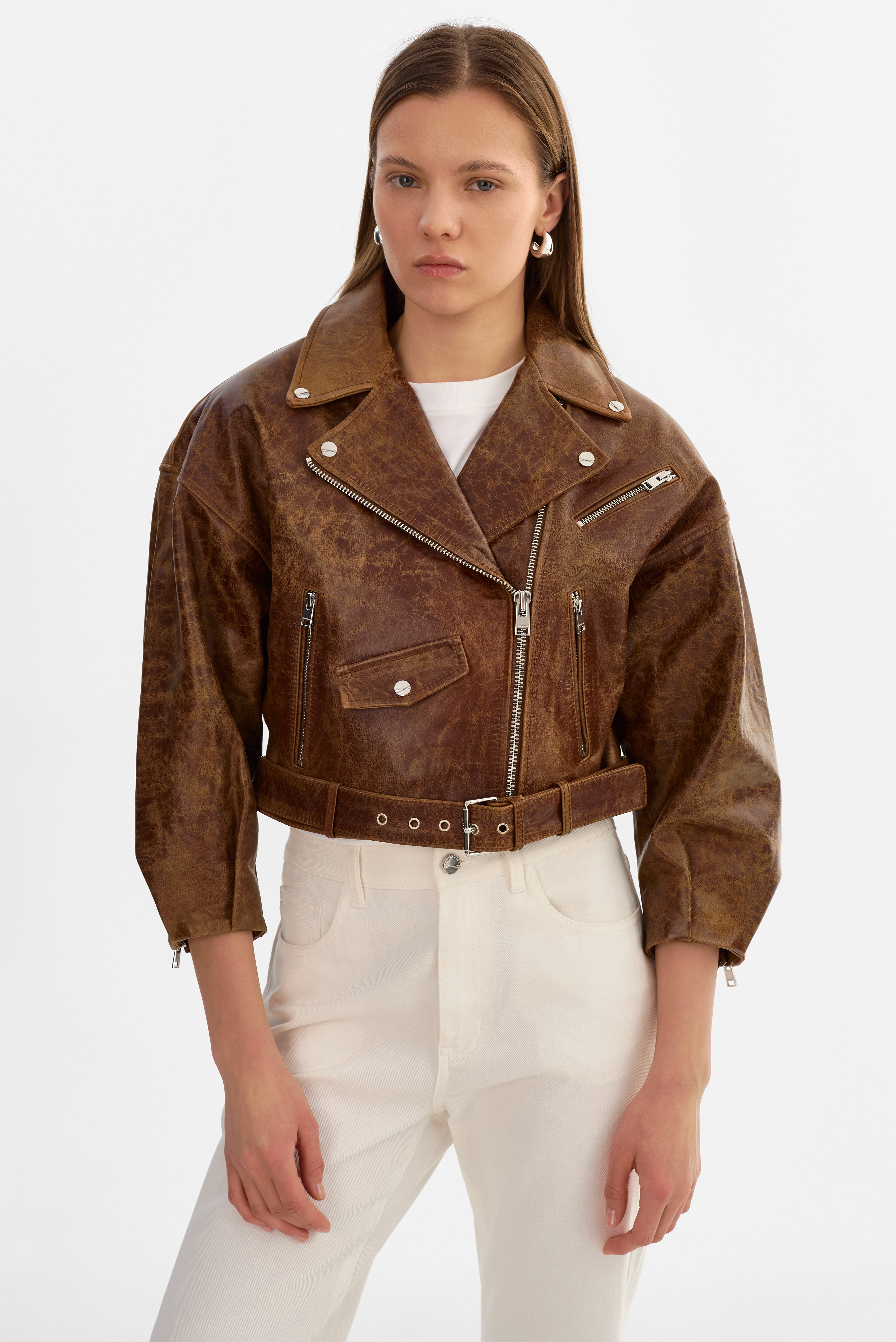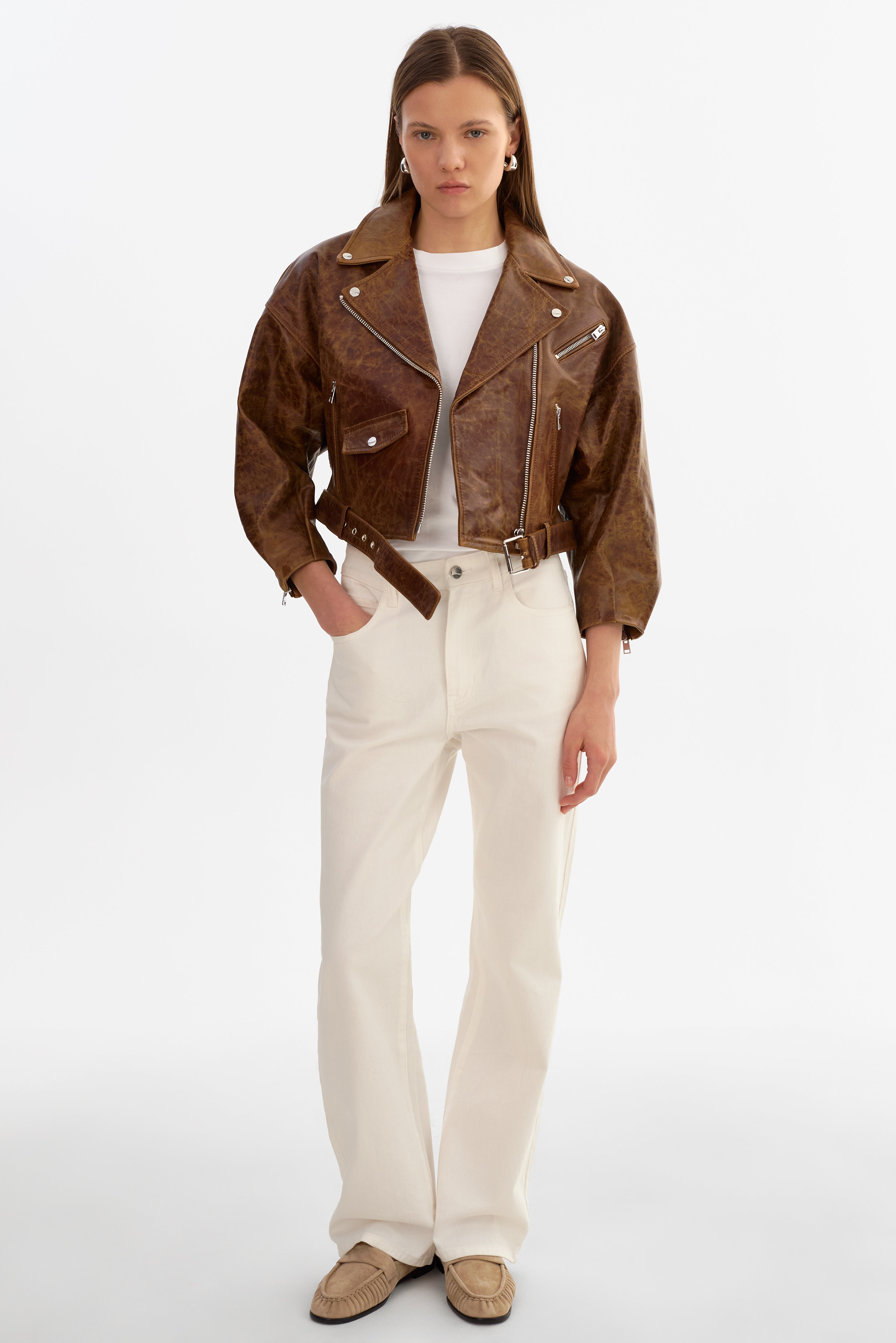 The VINNIE Leather Cropped Biker Jacket brings a relaxed attitude to a classic leather icon. Designed with an oversized, cropped fit and drop shoulders, it balances bold structure with effortless ease. Finished with batwing sleeves and signature biker details, it's an easy statement layer that elevates everyday dressing.