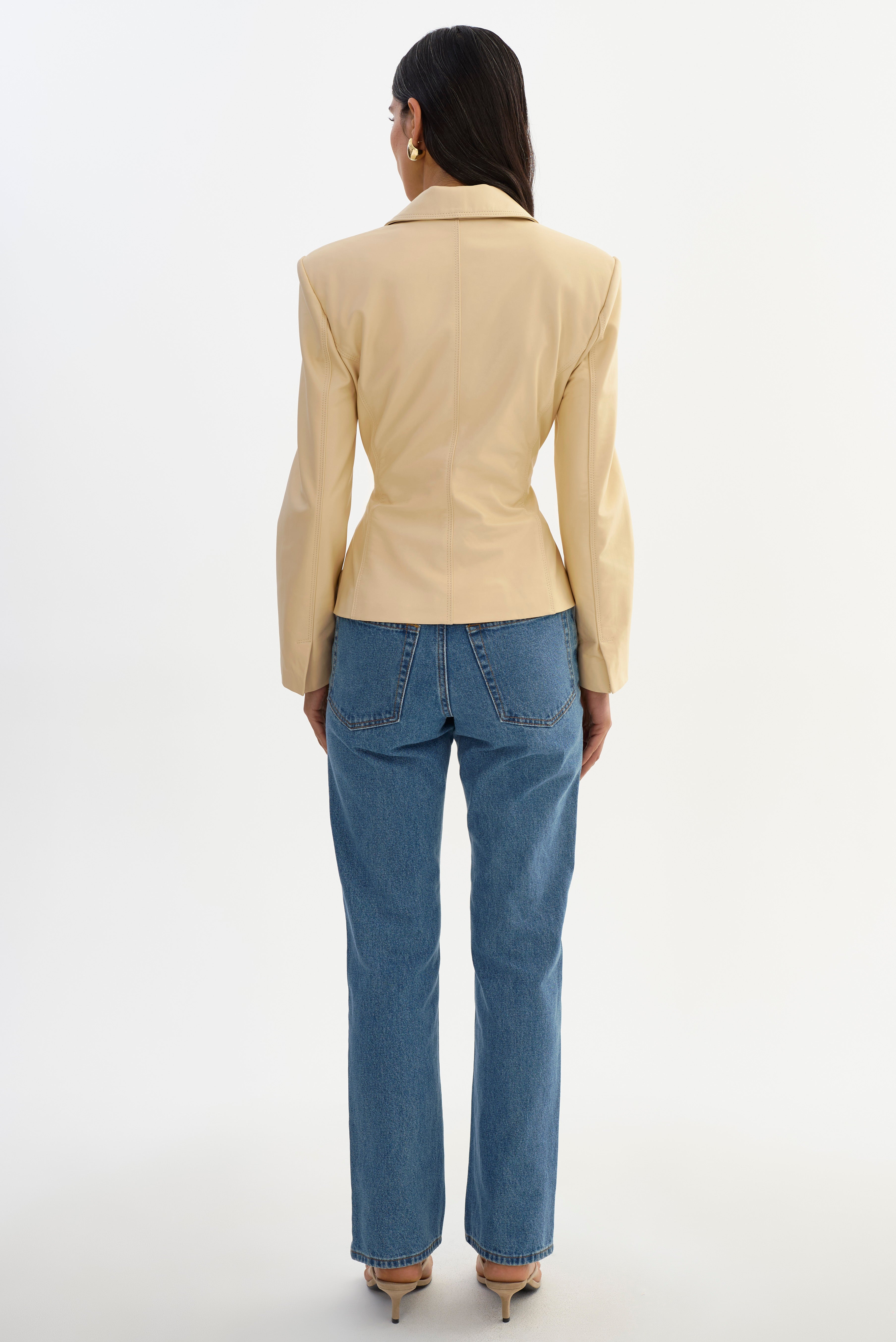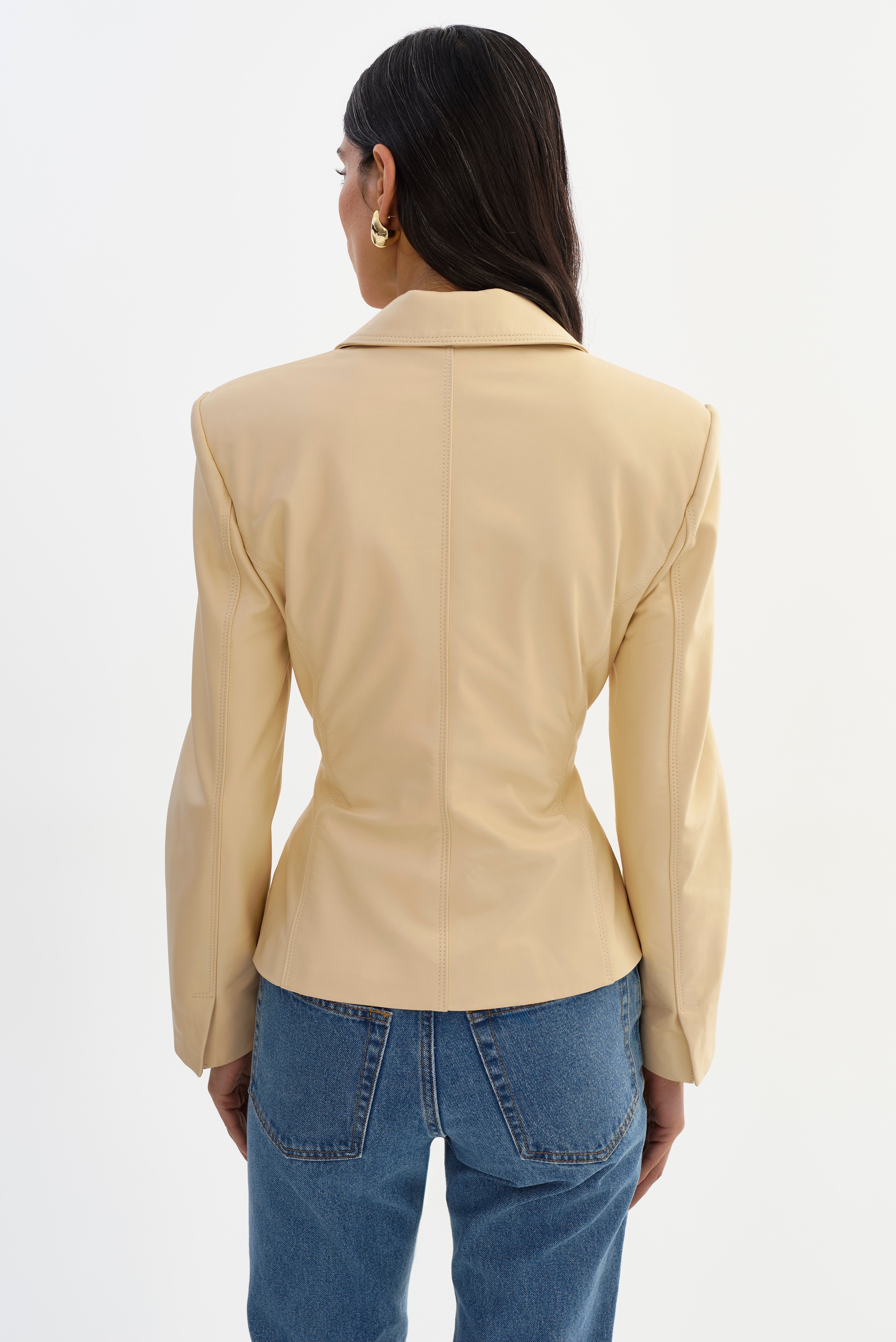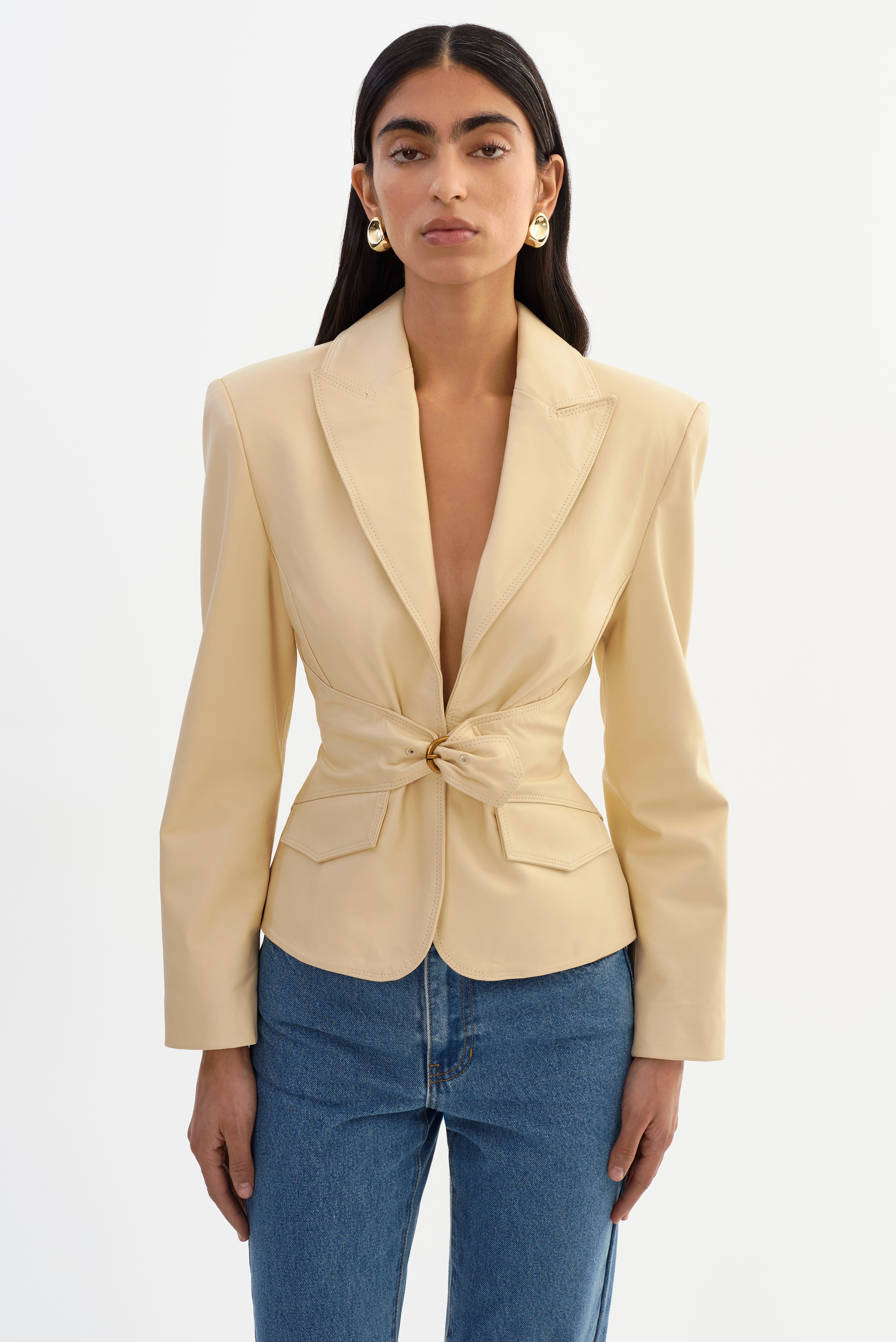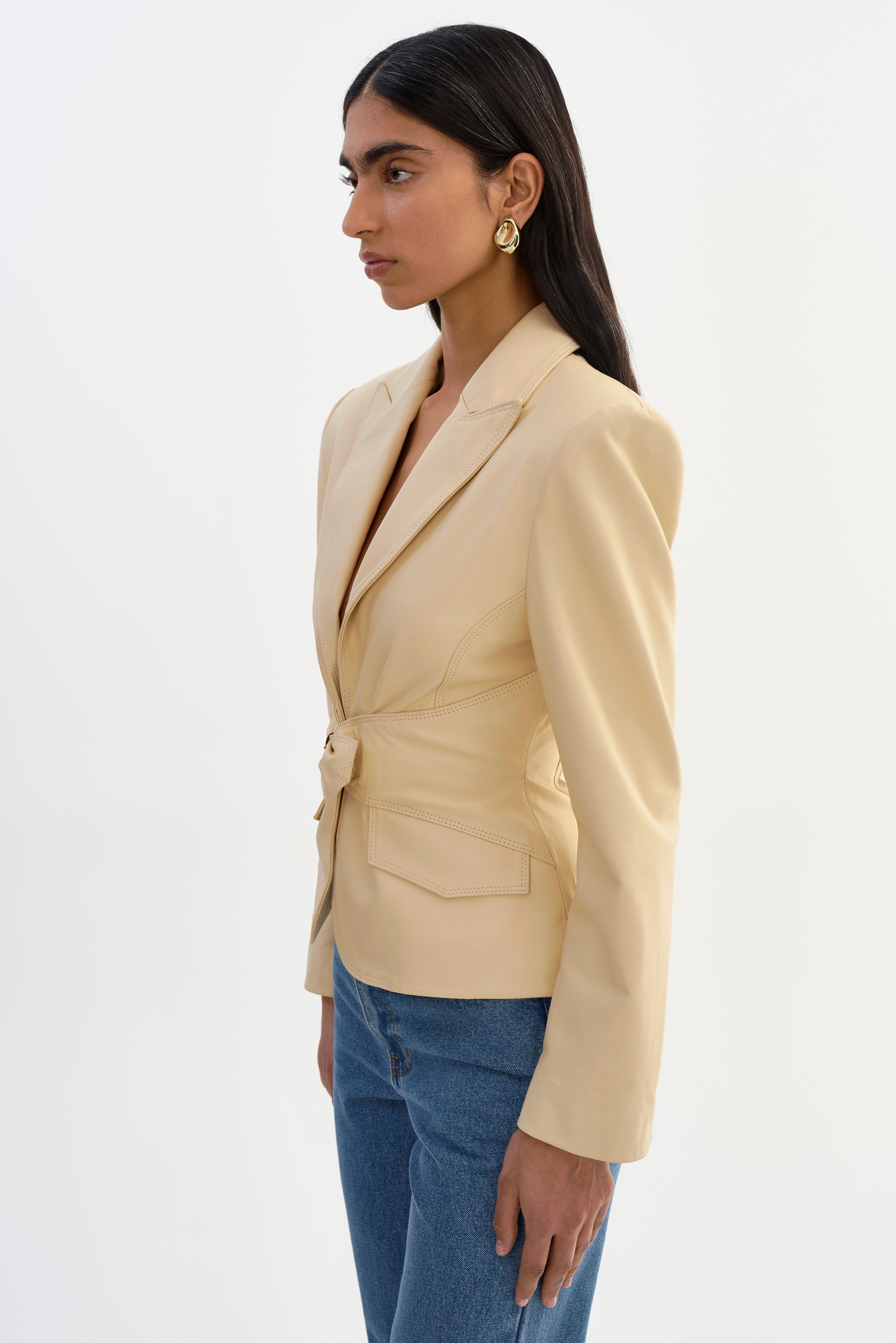A polished take on modern tailoring. The WILEY Leather Belted Blazer features a softly defined waist that creates a flattering, feminine shape. Crafted from supple leather, it transitions easily from daytime dressing to evening looks.